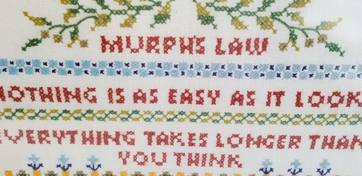 Nice vintage "Murphy's Law" cross stitch in frame - good condition. Measures 16" takk, 20" wide.