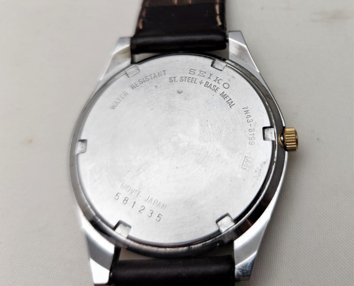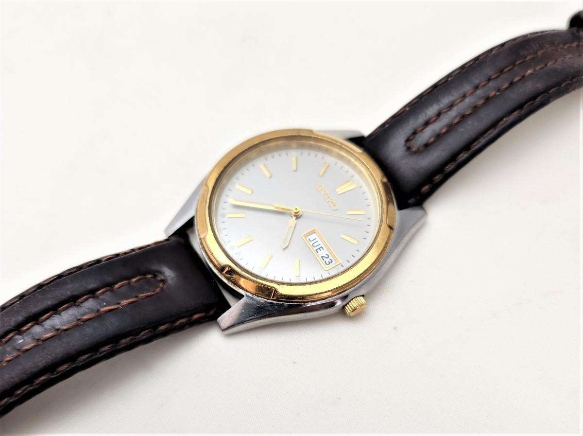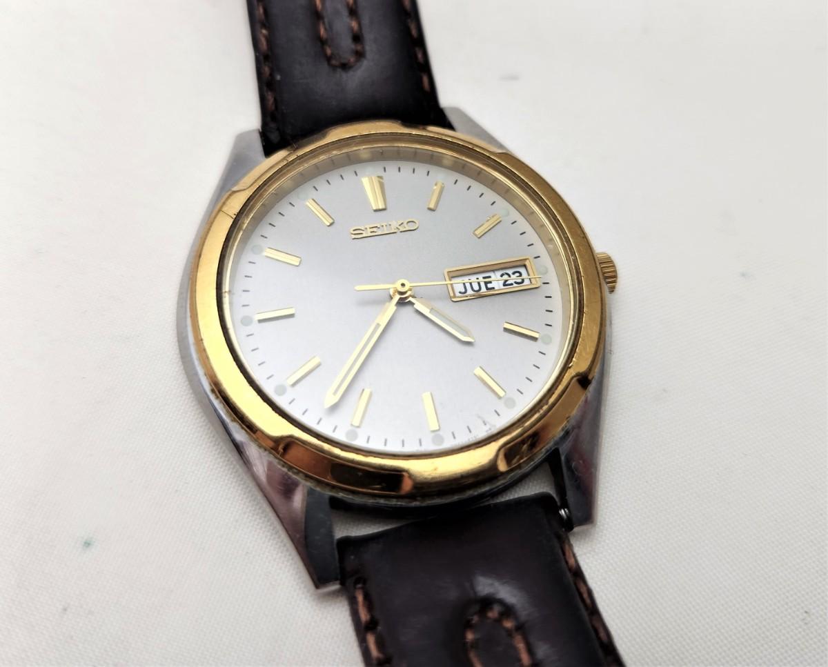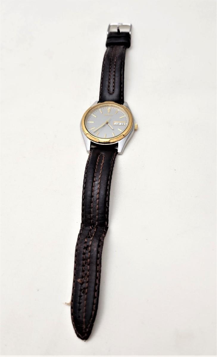 This Seiko Quartz man's watch dates from August of 1975. Features bilingual English/Spanish day of the week and the date of the month.. Leather band, fresh battery. Good working condition. Face measures about 1.5" across. I would be willing to ship this item - you pay priority postage.