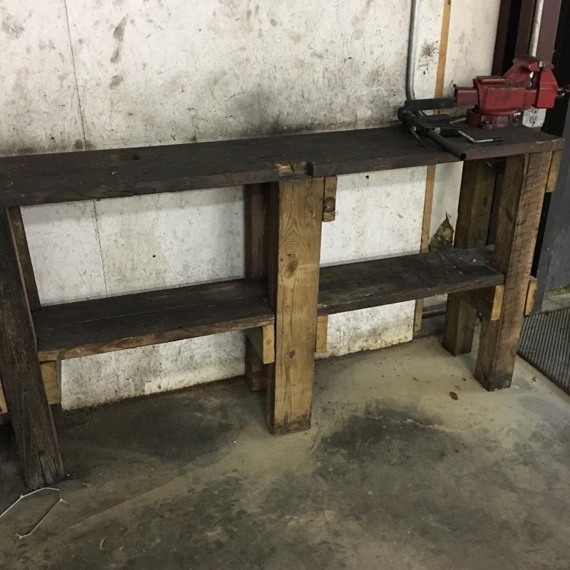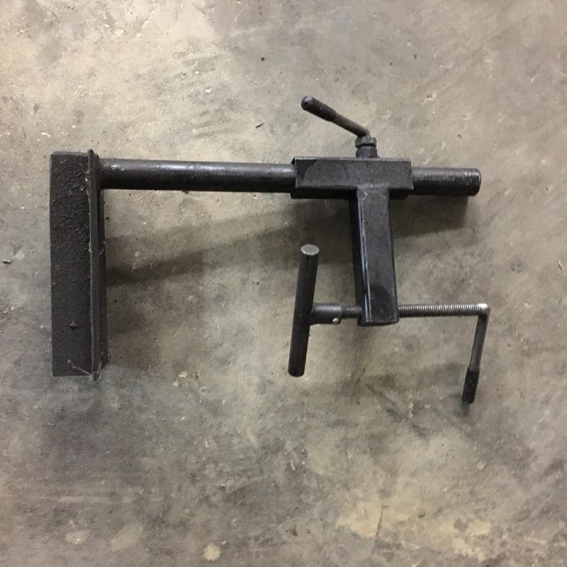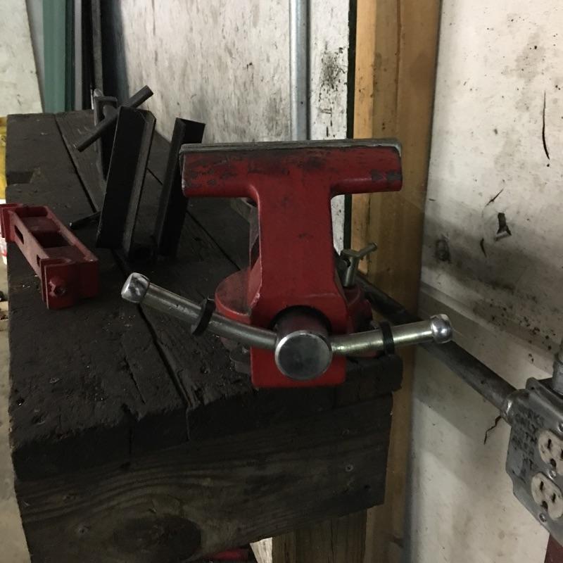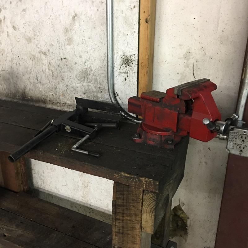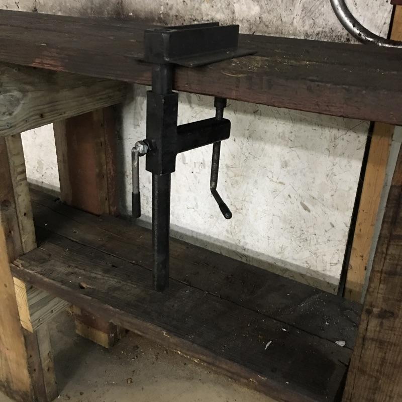 Large bench mounted vise and portable clamp with wooden work bench. Heavy duty bench vise to get the tough jobs done. Work bench