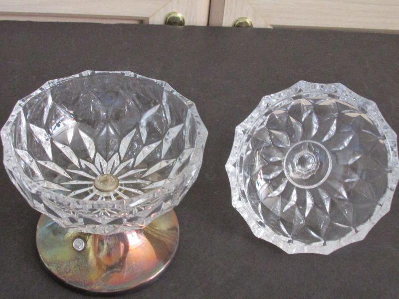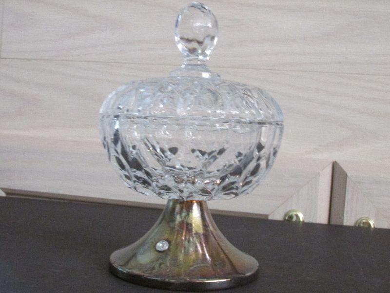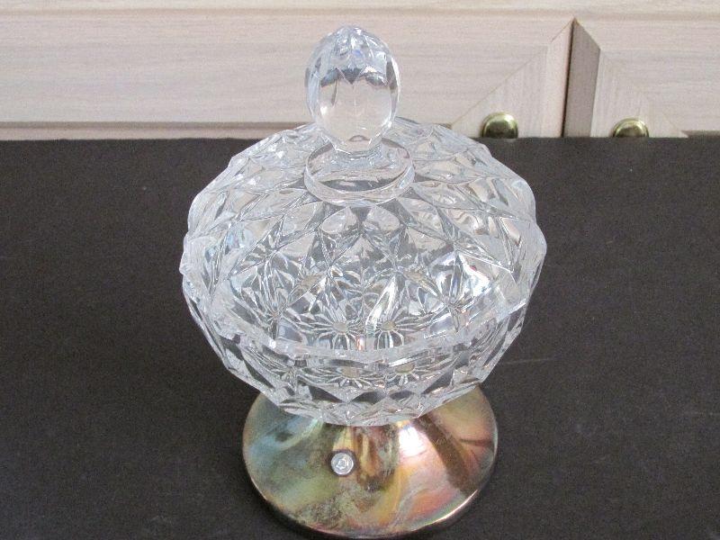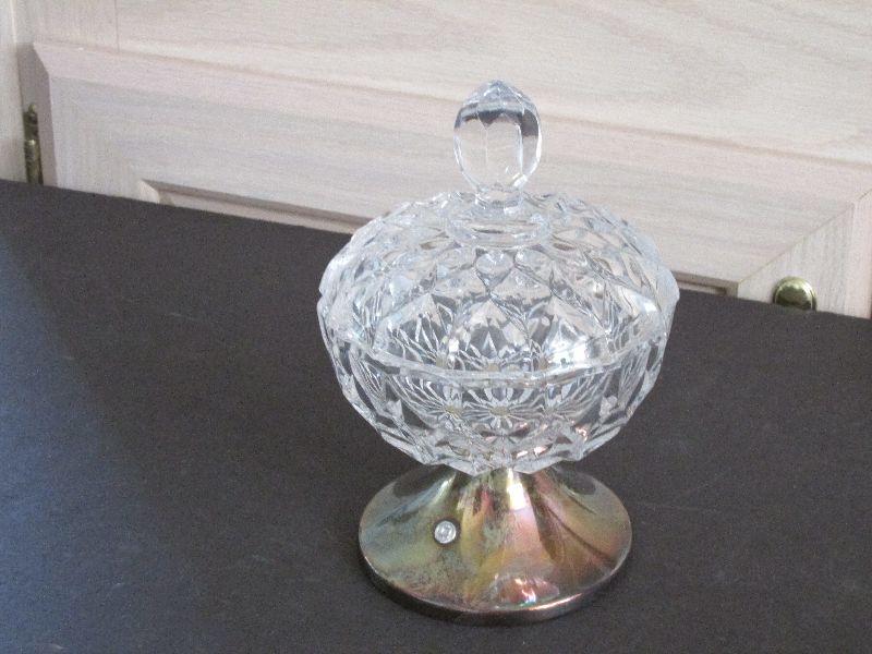 Crystal candy dish with Wallace Silver base. No chips or cracks. Silver is tarnished.