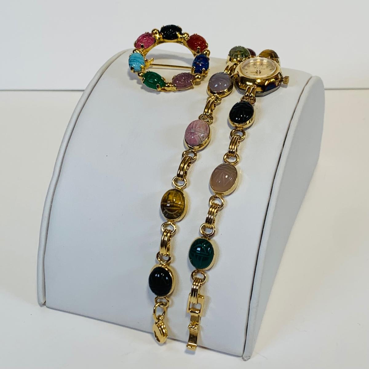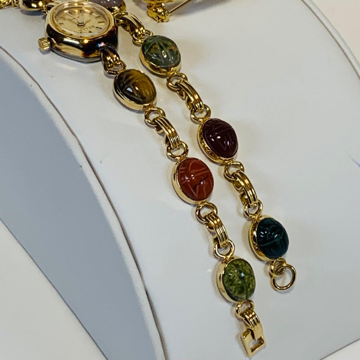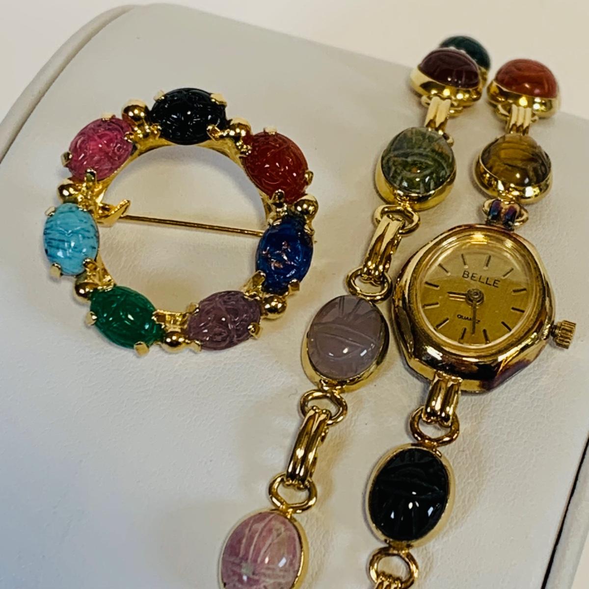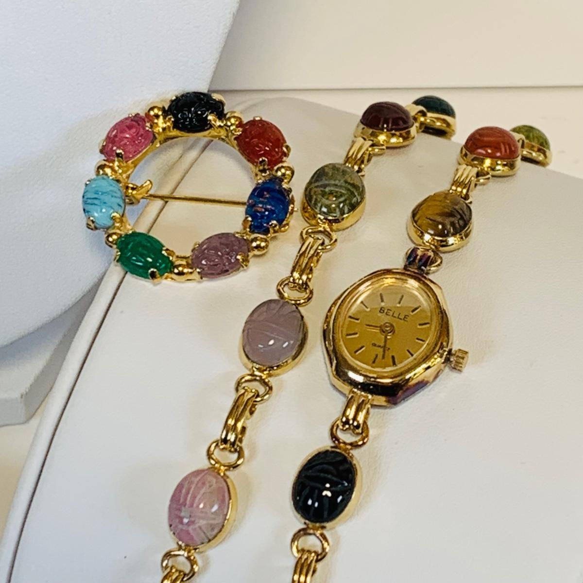 Lot 220L Vintage Bracelet Scarab Gold Tone Bracelet, Watch & Pin, Green Tone Stone Necklace w/Matching Earrings & More