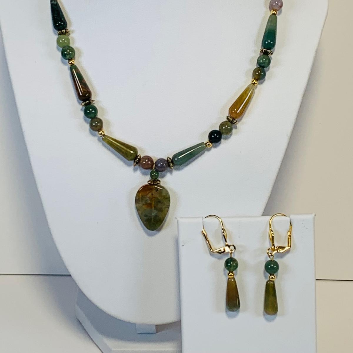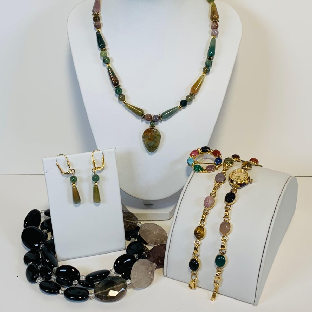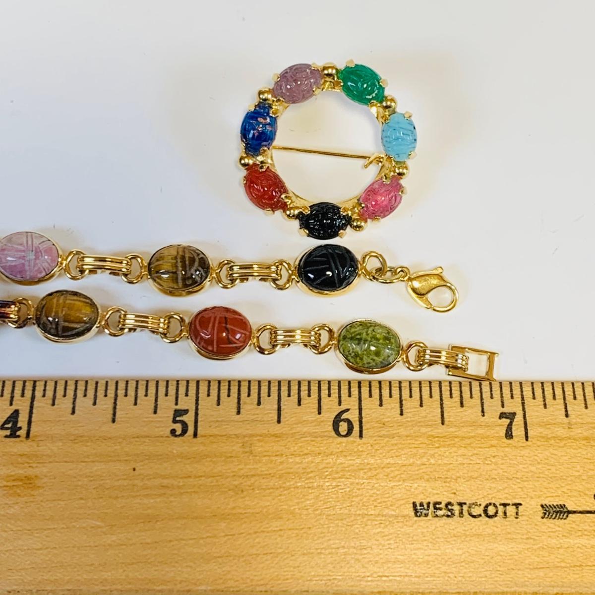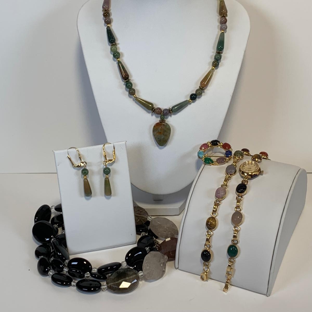 Lot 220L Vintage Bracelet Scarab Gold Tone Bracelet, Watch & Pin, Green Tone Stone Necklace w/Matching Earrings & More