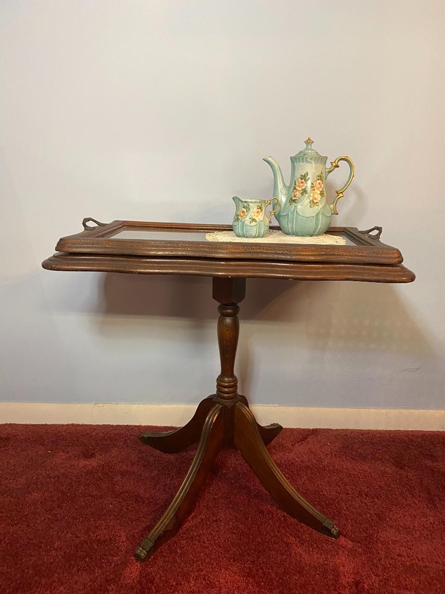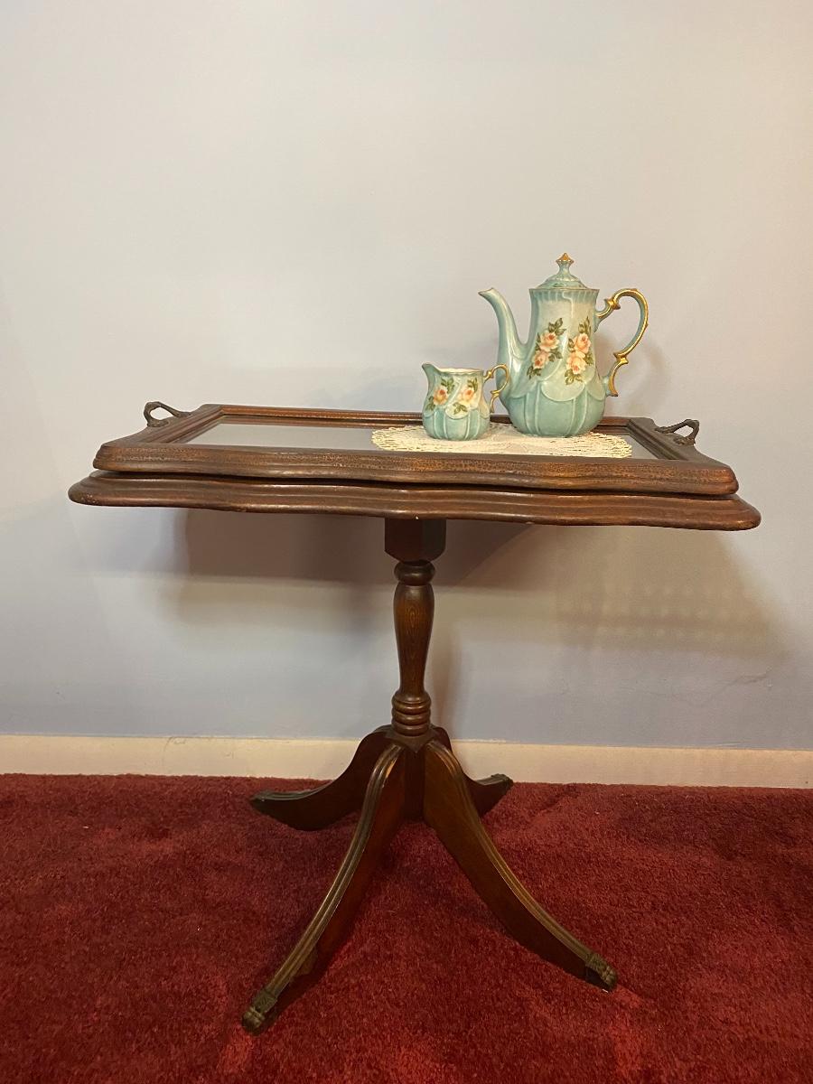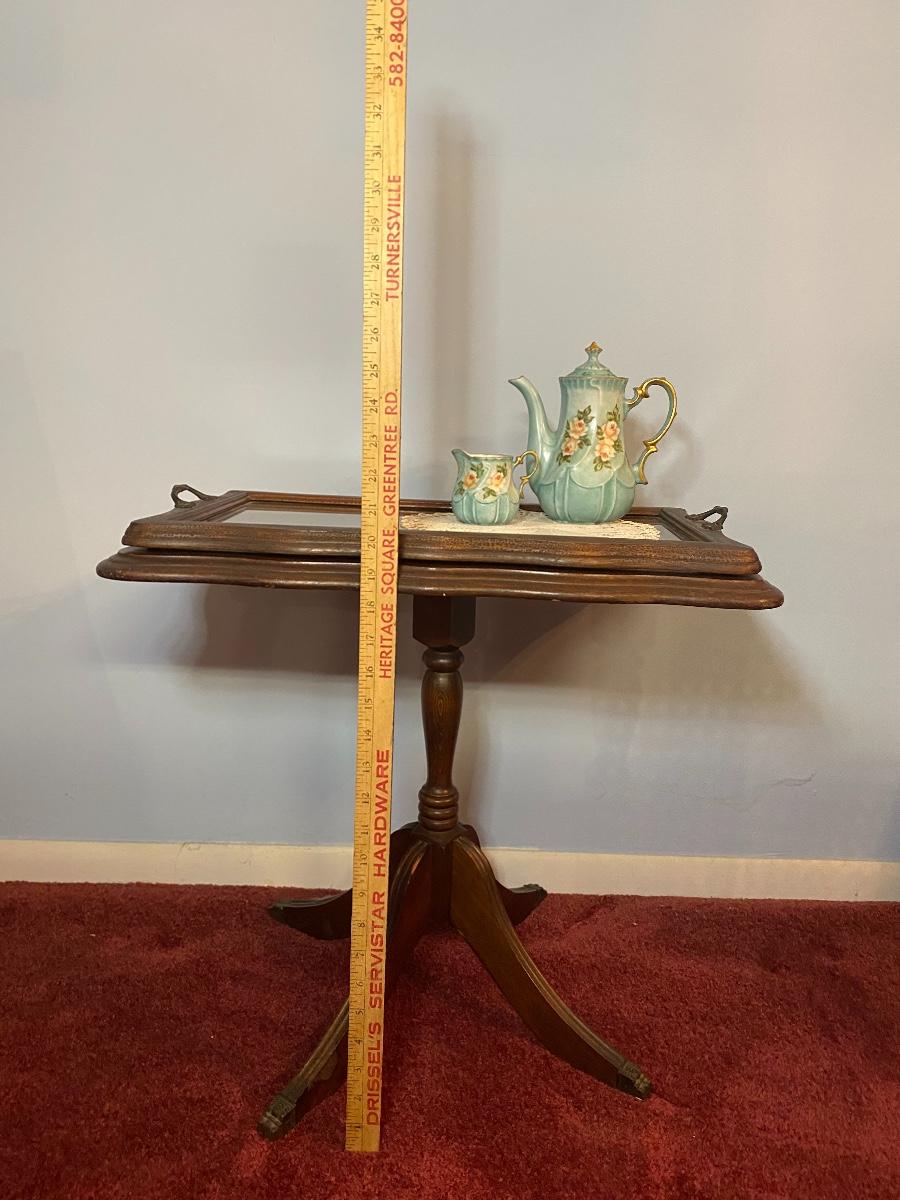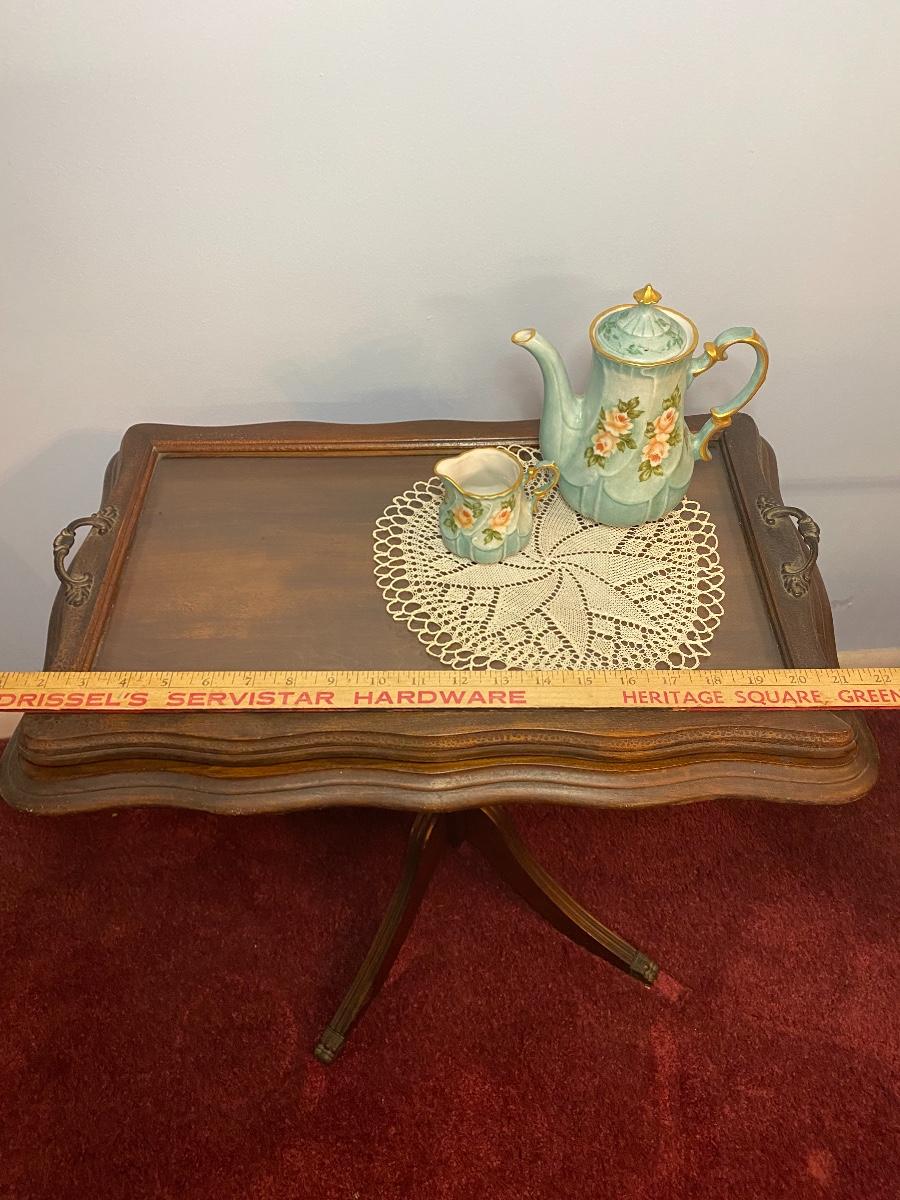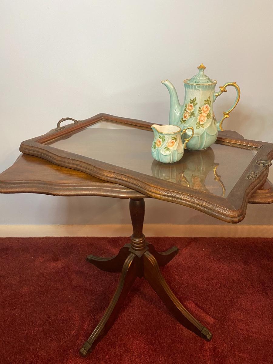 Petite side table with matching glass top tray on top. This comes with a small teapot and matching creamer. Please see all pictures as they are the best representation of the items. The pictures show condition, measurements if taken, and what is included in the lot. Due to the large amount that we photograph and the time frame, we are not always able to take measurements. All items unless noted, are pre-owned and have been used. If you purchased furniture, you must bring help. We do not allow one person to carry large furniture out on their own. Bring help, tools and a truck for the safety of our client’s homes, and your personal safety. Company policy. Thank you.