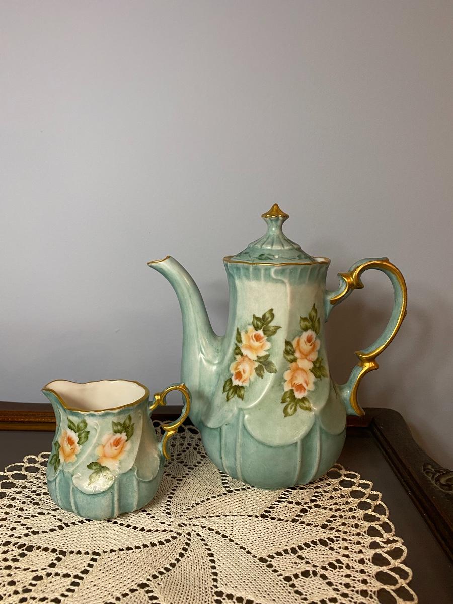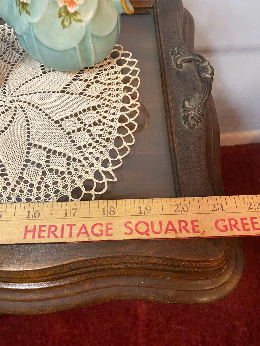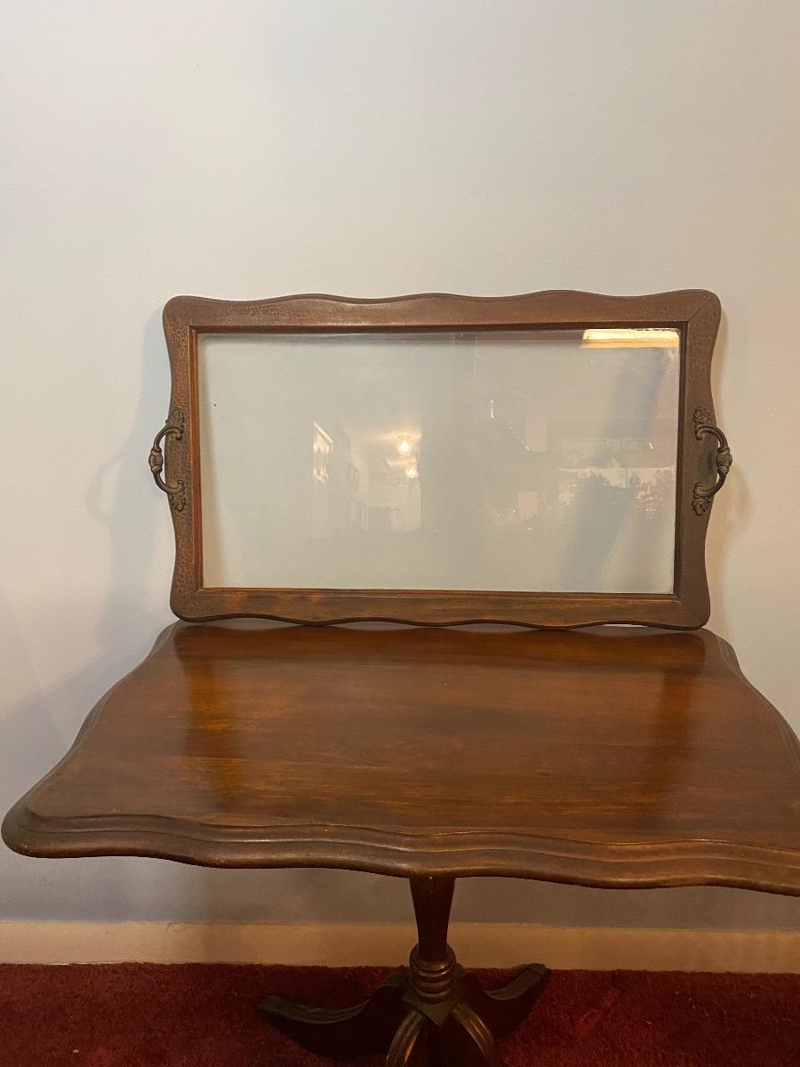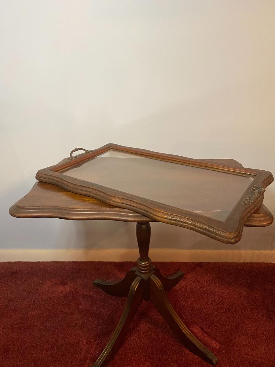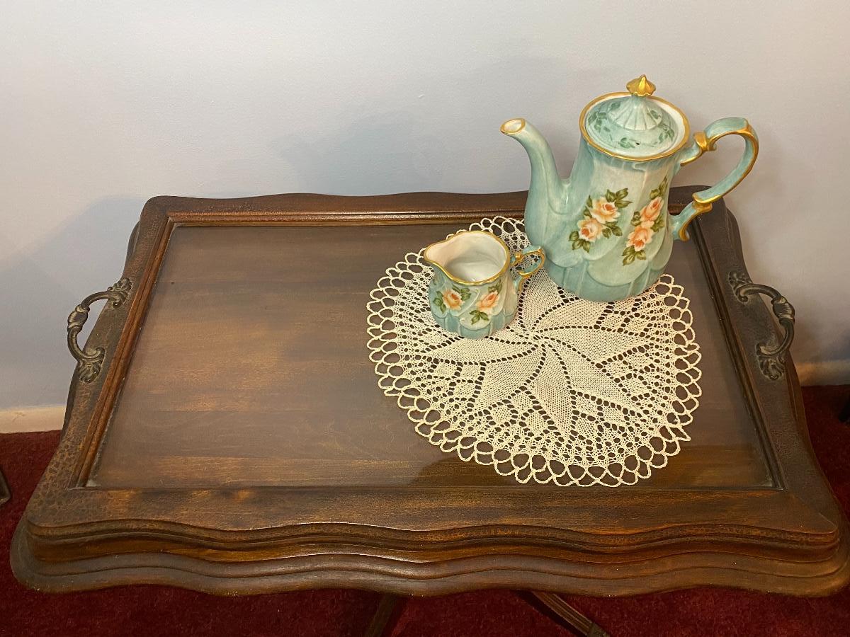 Petite side table with matching glass top tray on top. This comes with a small teapot and matching creamer. Please see all pictures as they are the best representation of the items. The pictures show condition, measurements if taken, and what is included in the lot. Due to the large amount that we photograph and the time frame, we are not always able to take measurements. All items unless noted, are pre-owned and have been used. If you purchased furniture, you must bring help. We do not allow one person to carry large furniture out on their own. Bring help, tools and a truck for the safety of our client’s homes, and your personal safety. Company policy. Thank you.