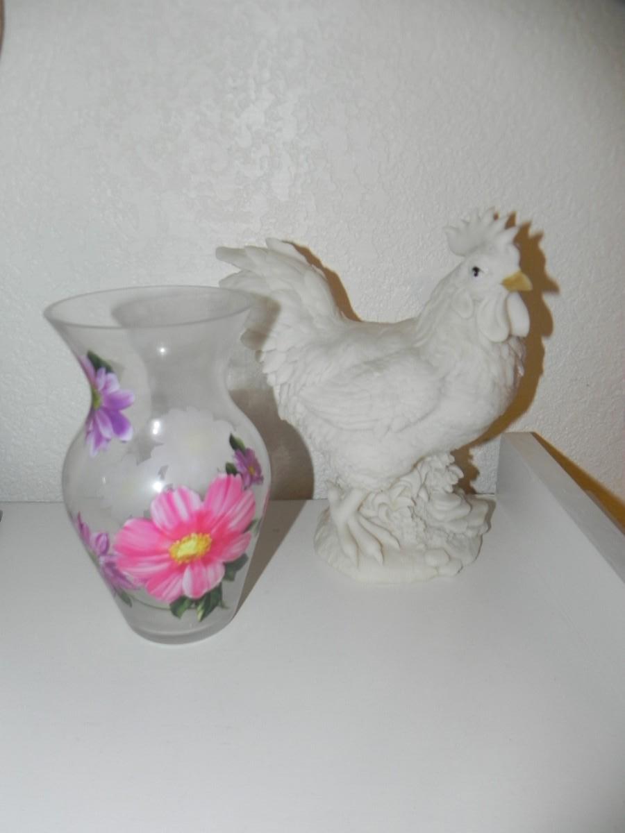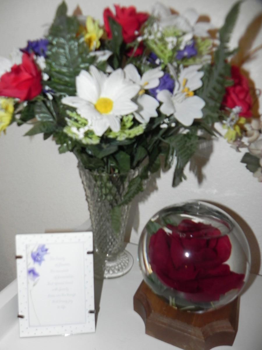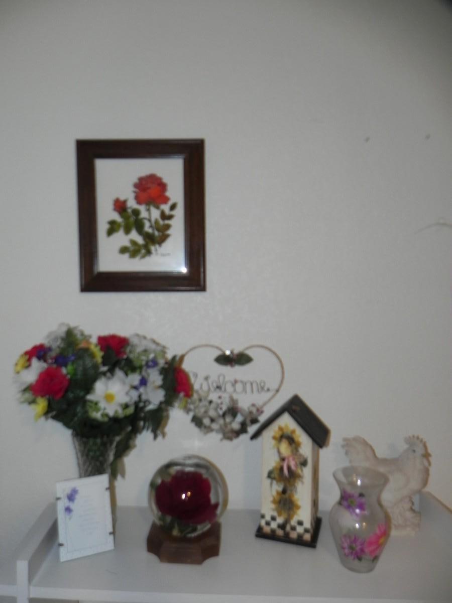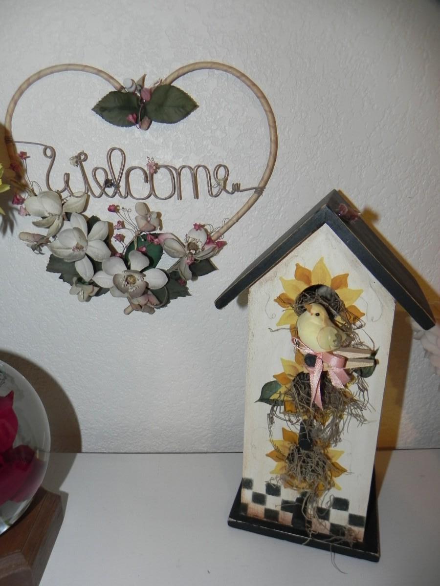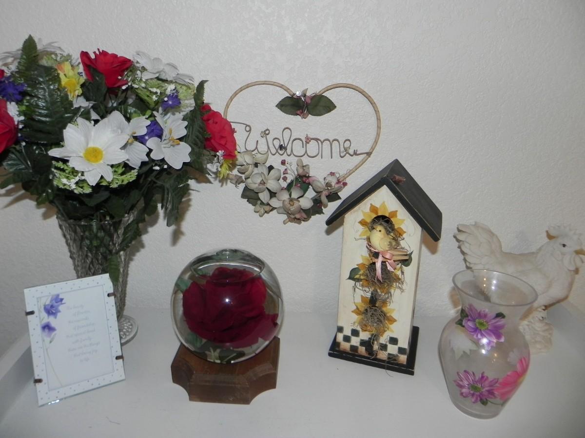 RED ROSE IN GLASS GLOBE, WOODEN BTRDHOUSE, AND FLOWER DECOR