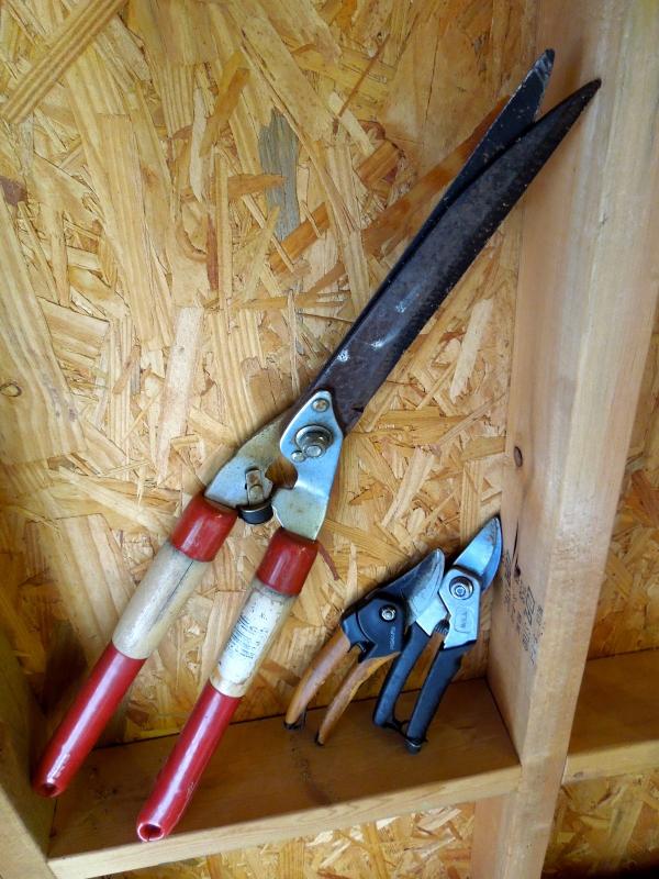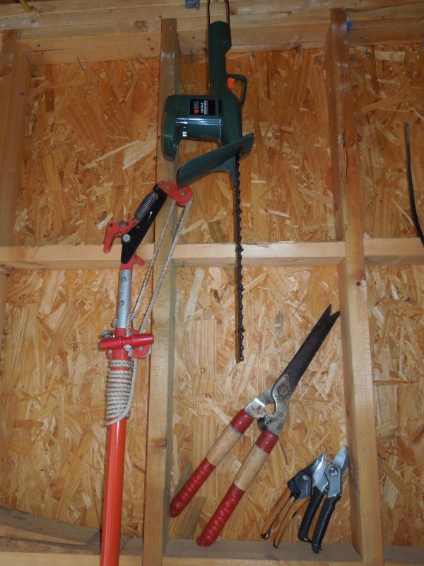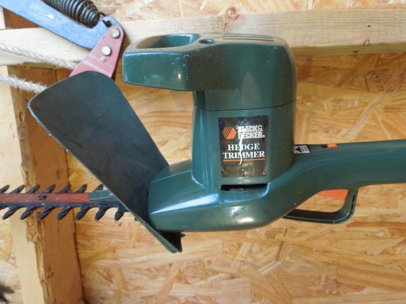 Ames 10 foot manual tree trimmer. Black and Decket electric hedge trimmer with extension cord (not pictured). Longer manual hedge shears and two pairs of manual pruning shears. Blade on tree trimming pole is missing. Blades on shears may need sharpening.