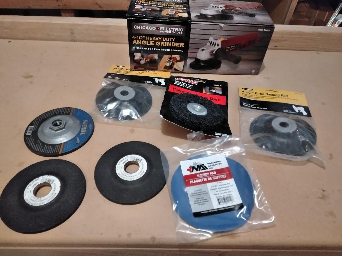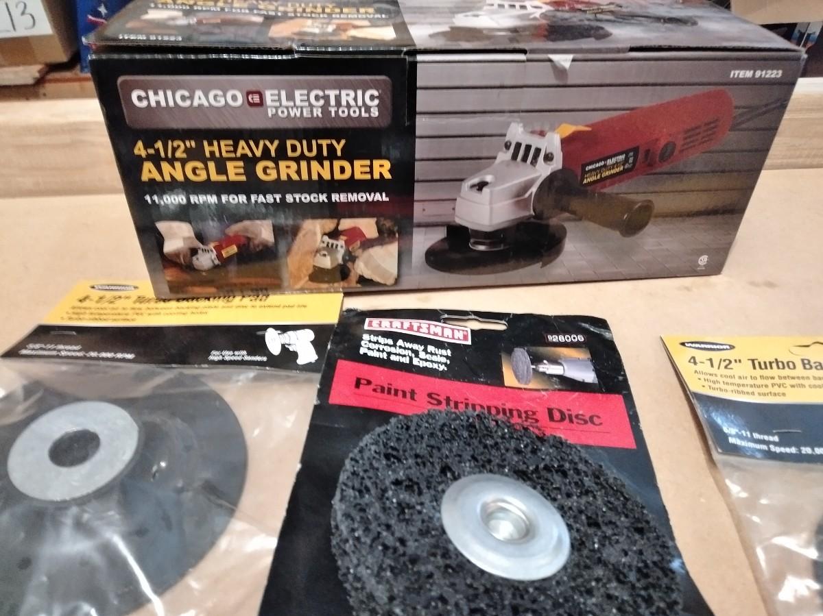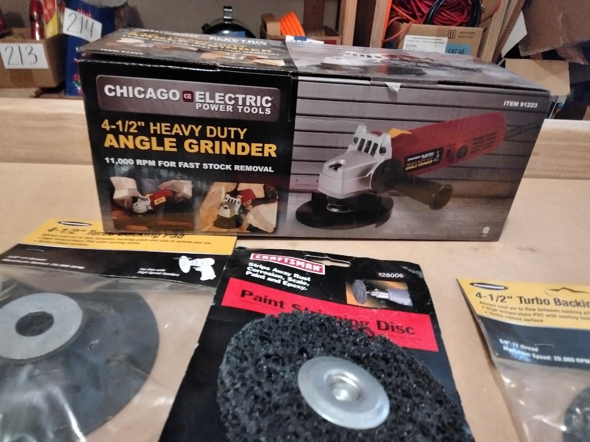 4.5" CHICAGO ELECTRIC ANGLE GRINDER AND A VARIETY OF GRINDING WHEELS.