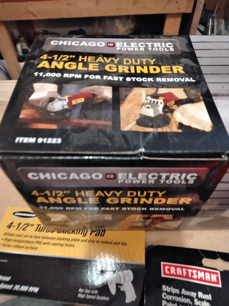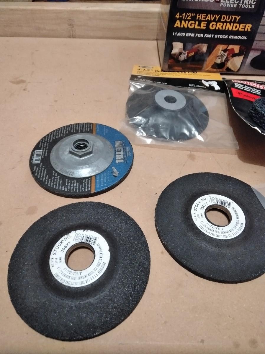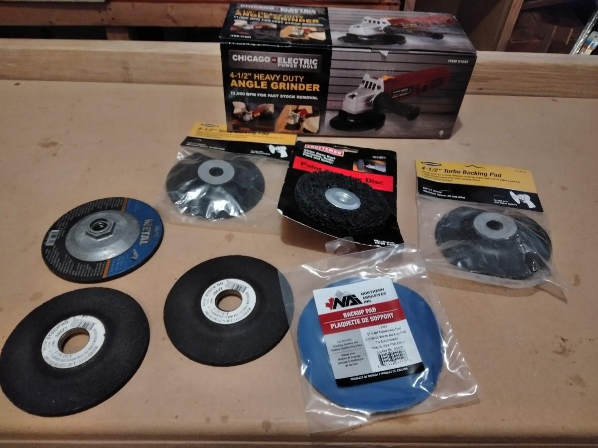 4.5" CHICAGO ELECTRIC ANGLE GRINDER AND A VARIETY OF GRINDING WHEELS.