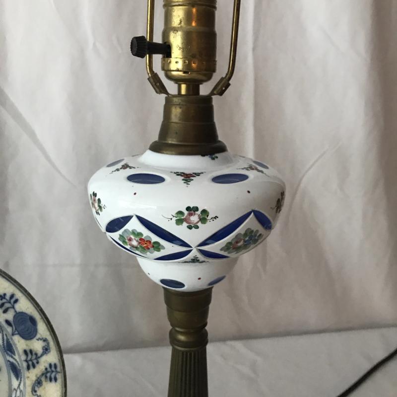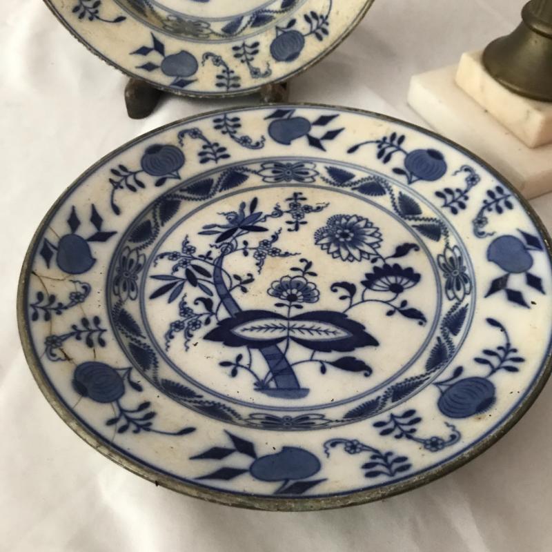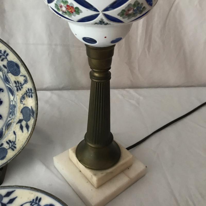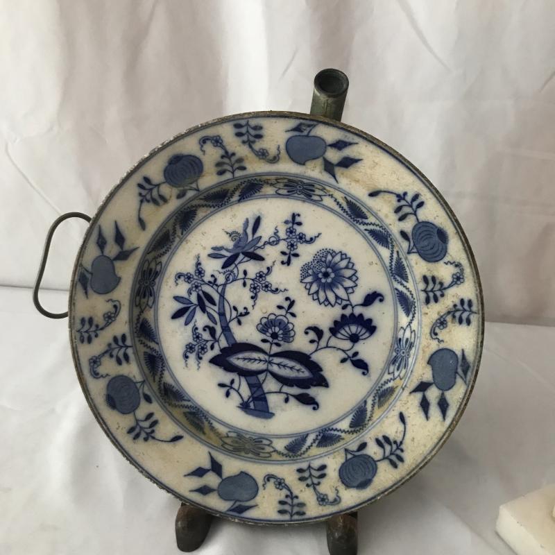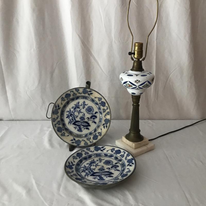 Two porcelain antique warming plates. Pour hot water in base to keep your food warm. One plate is missing spout and has some cracks in porcelain. Both missing plugs. Plates Measure 10” diameter. Lamp is on 4.5” square marble base and is beautiful blue glass and porcelain design. Works fine. Measures 26”high. Shipping available