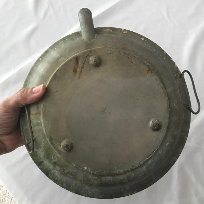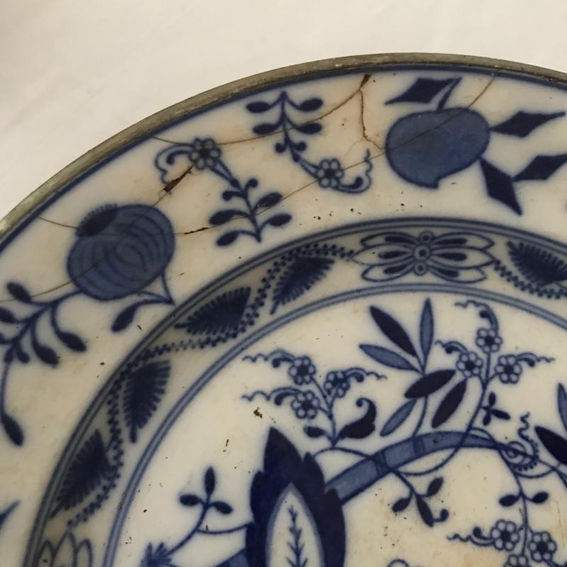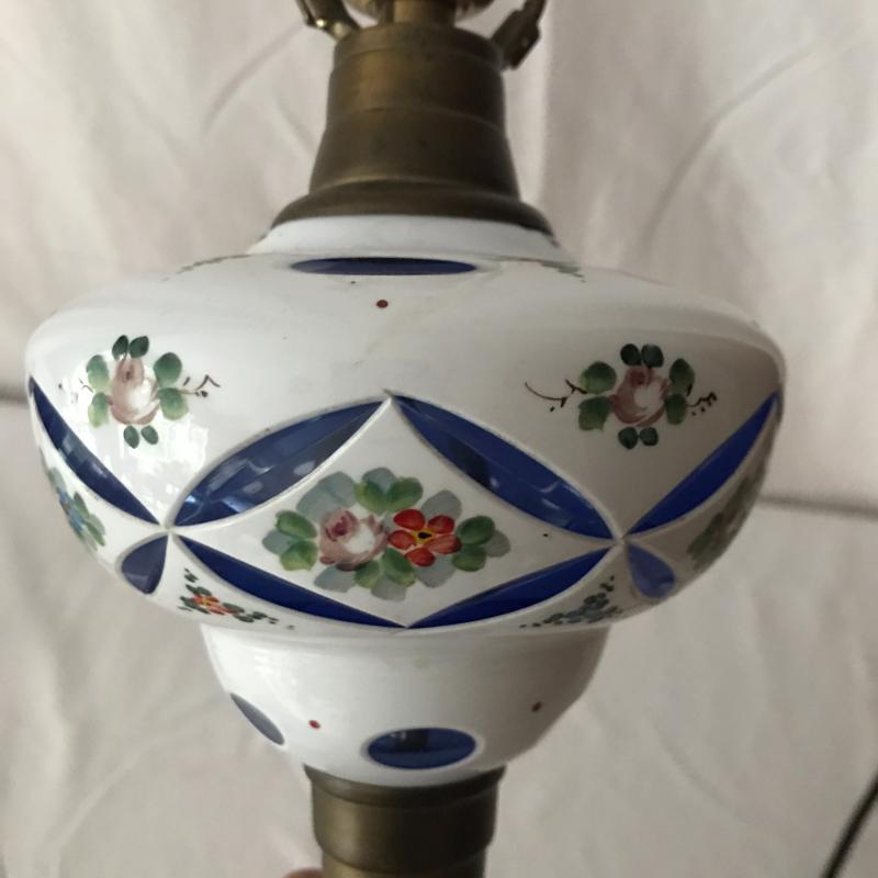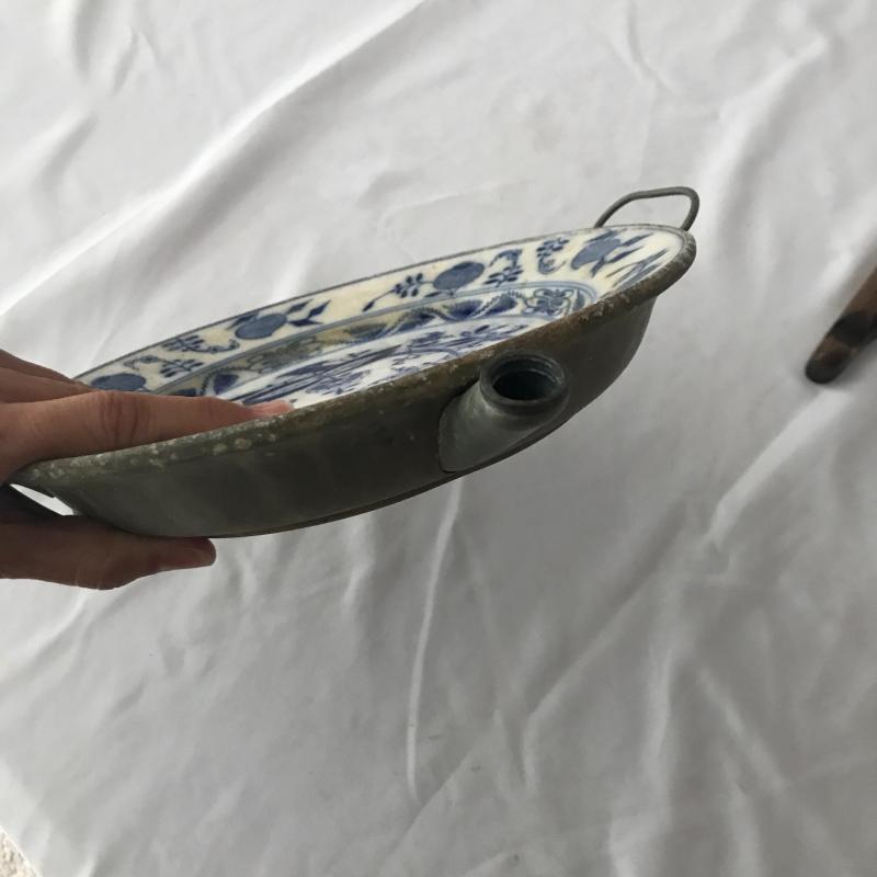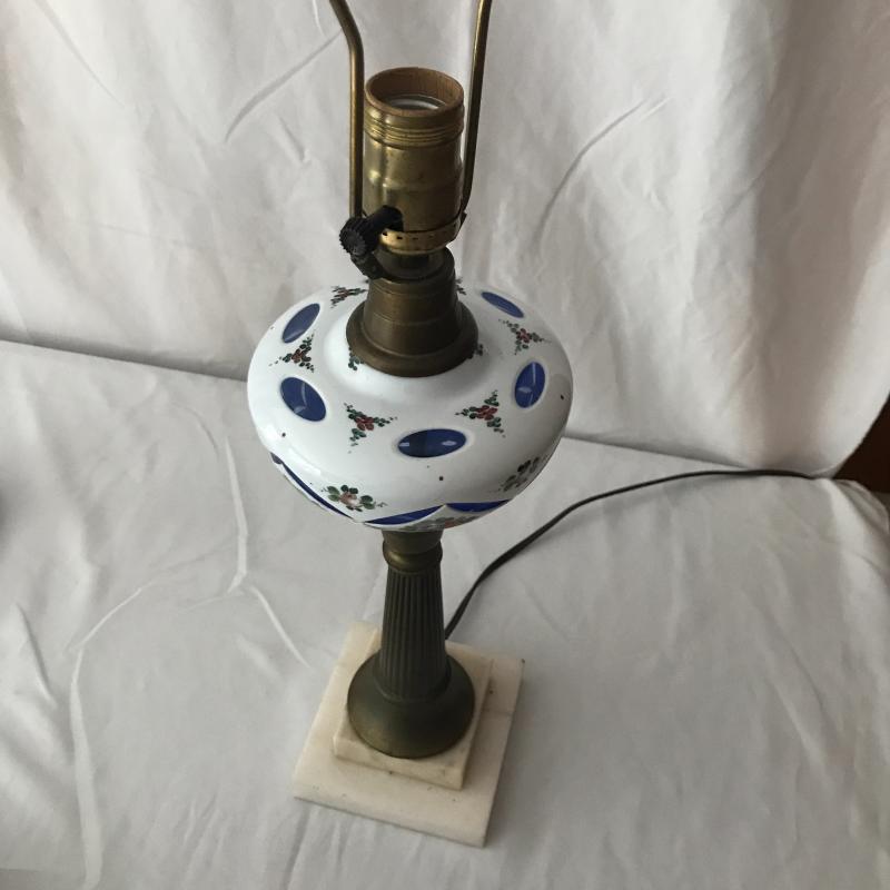 Two porcelain antique warming plates. Pour hot water in base to keep your food warm. One plate is missing spout and has some cracks in porcelain. Both missing plugs. Plates Measure 10” diameter. Lamp is on 4.5” square marble base and is beautiful blue glass and porcelain design. Works fine. Measures 26”high. Shipping available