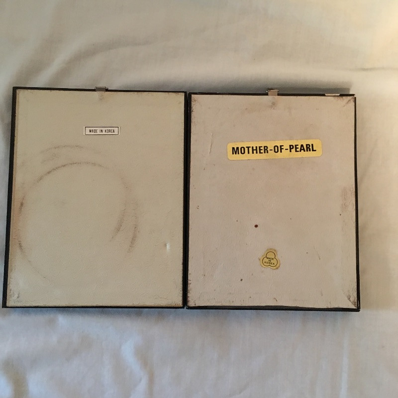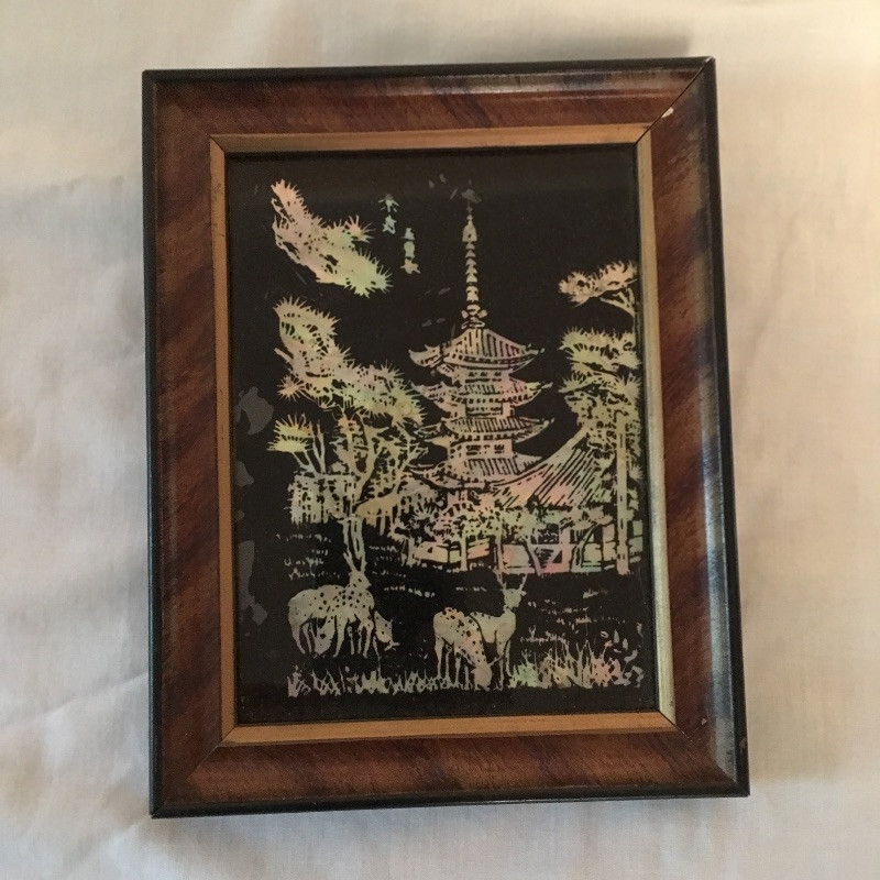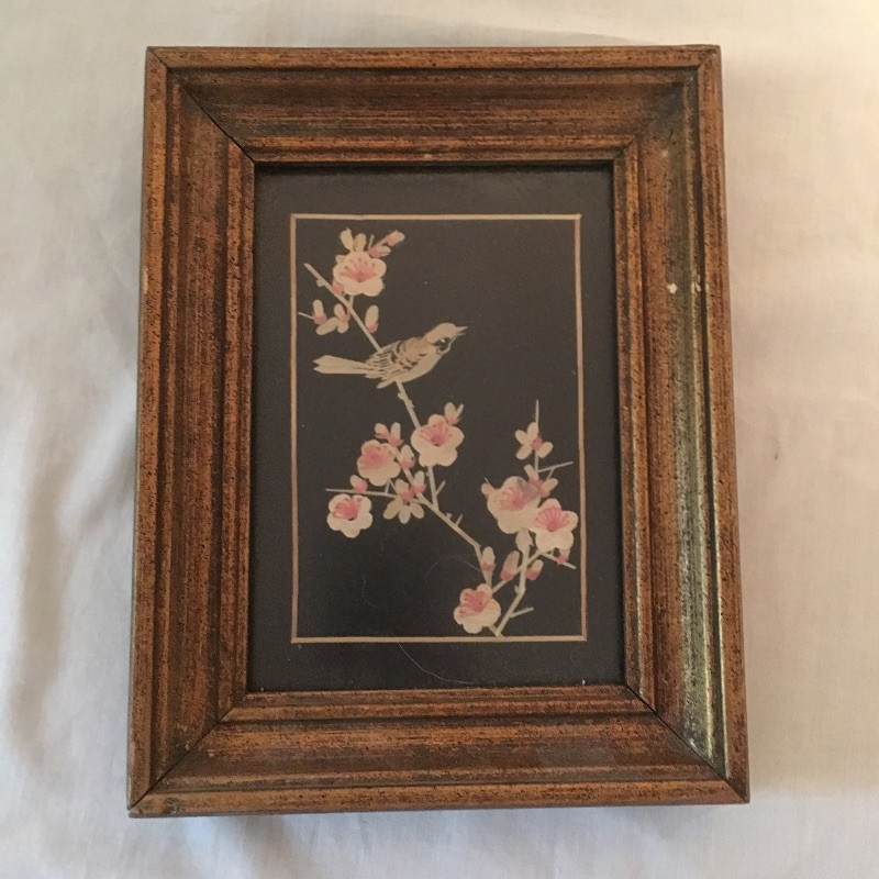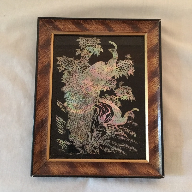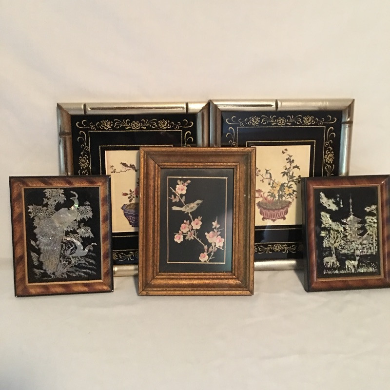 Five framed Asian pieces of art. Two are mother of pearl and the other three depict birds and flowers.