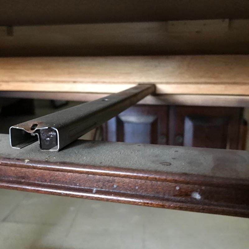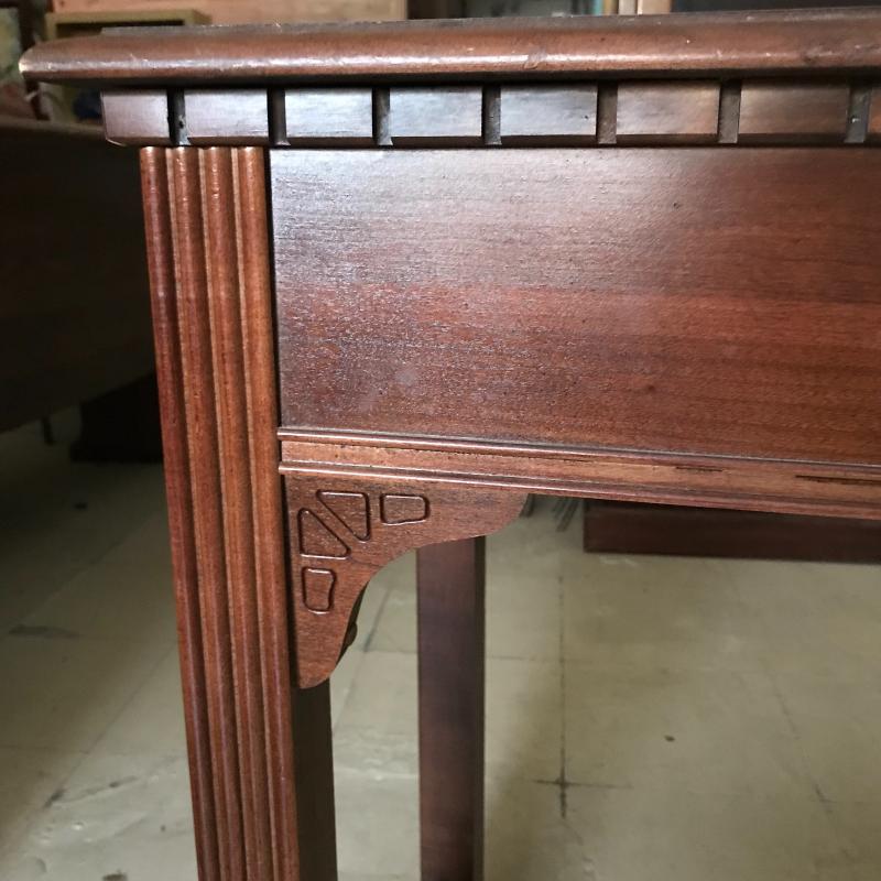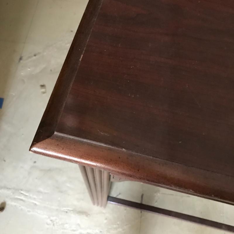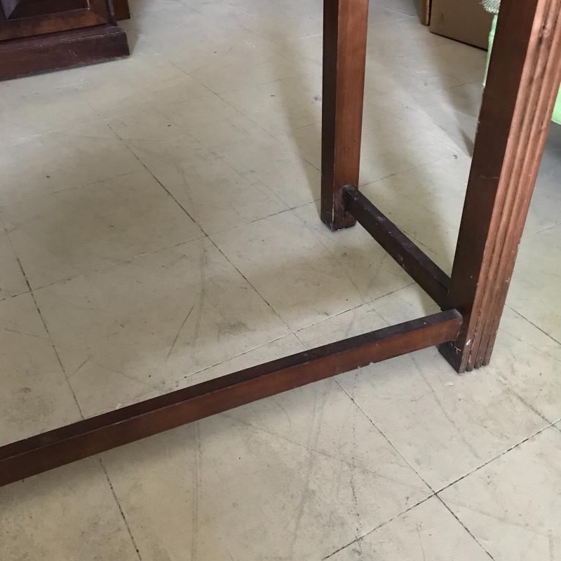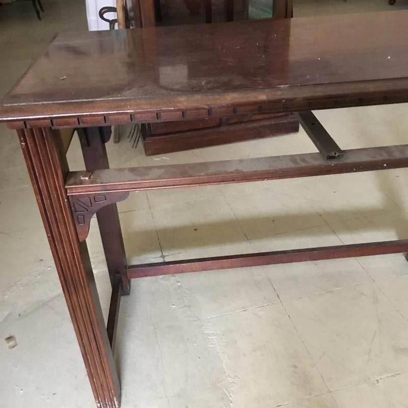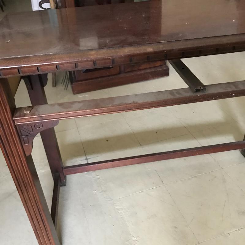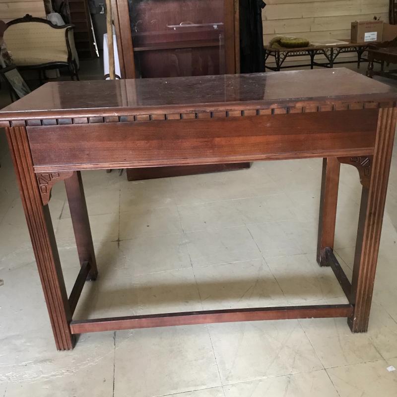 Long, shallow desk is missing drawer. That side can easily be pushed against a wall and the piece used as a side table. Approx. 41” x 19.5” x 30”. No shipping available. Local pickup only in Maggie Valley, NC.