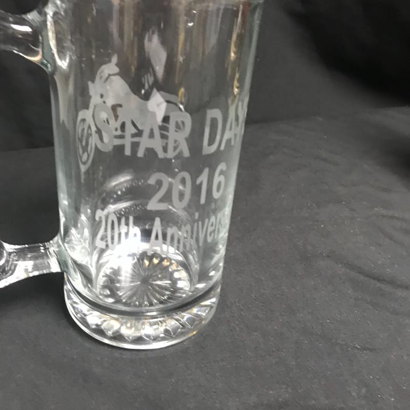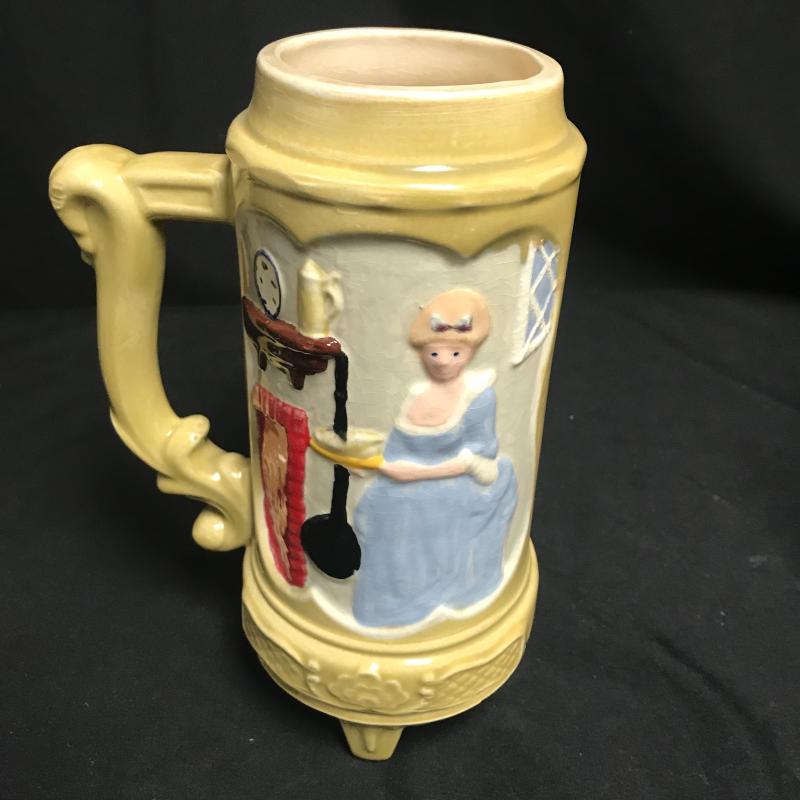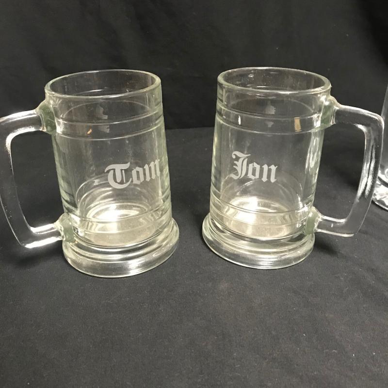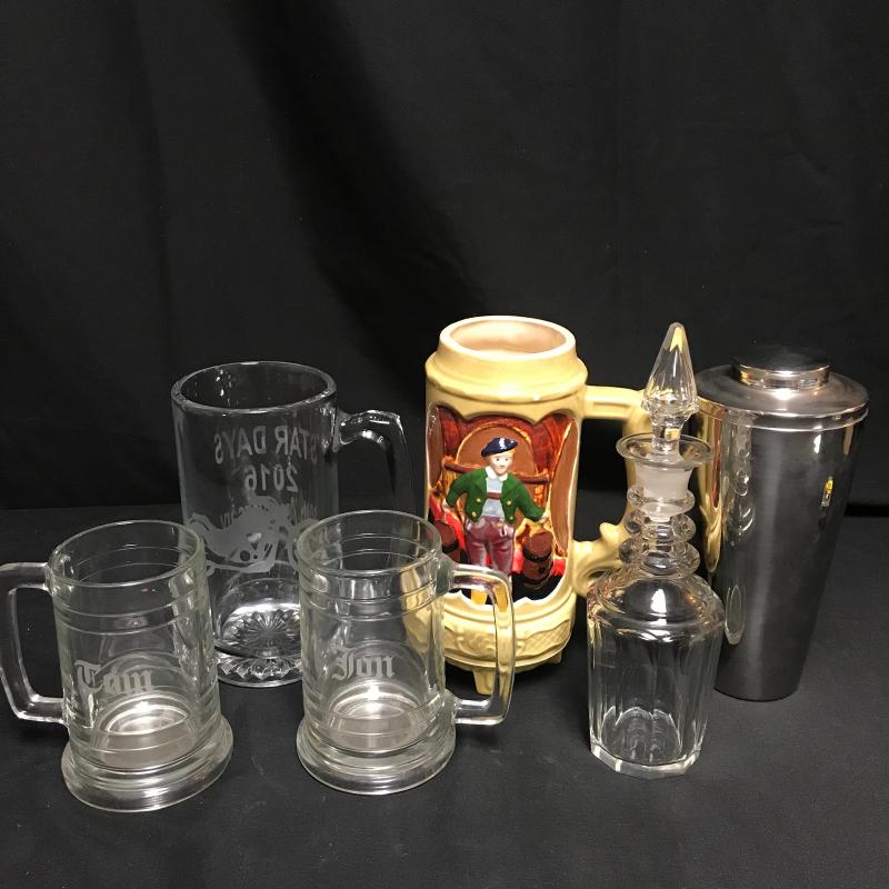 Three glass mugs with Jon and Tom etched on the smaller ones and a motorcycle on the larger one. Beautiful ceramic stein with a lady on one side and gentleman on the other. Shaker tool and stopper glass canister. Stein stands 9” tall. Local pick up only.
