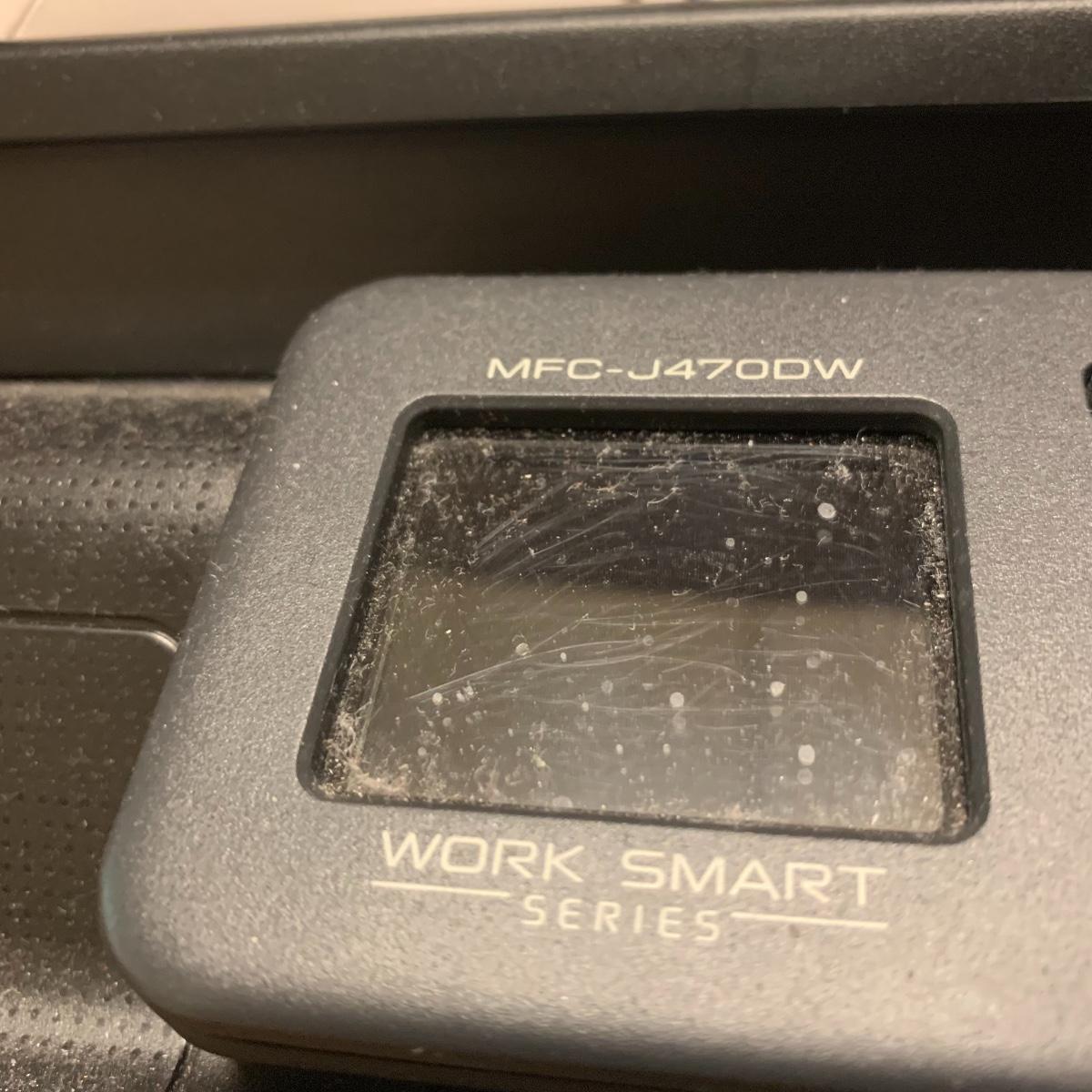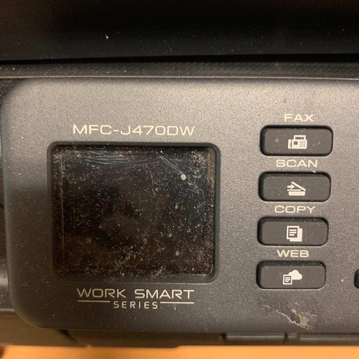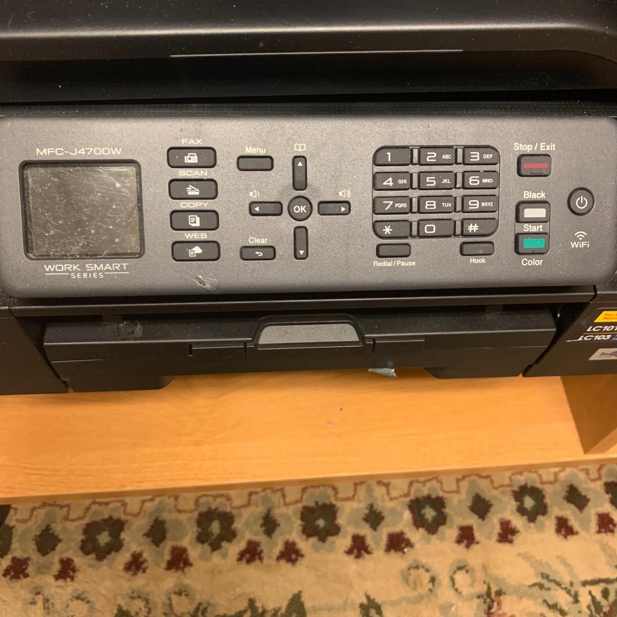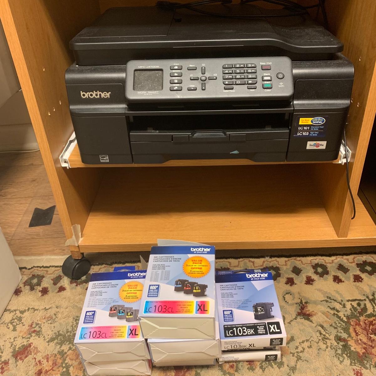 This lot includes one Brother MFC-J470DW printer and eight cartridges of Brother ink. There are five packages of colored ink cartridges and three packages of black ink cartridges. The printer screen is slightly scratched (see photos). Cannot confirm the printer works. It measures 14.5in x 16in x 8in.