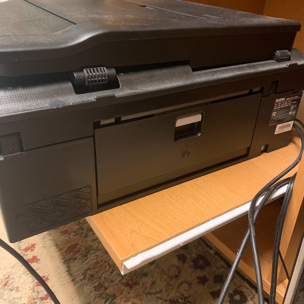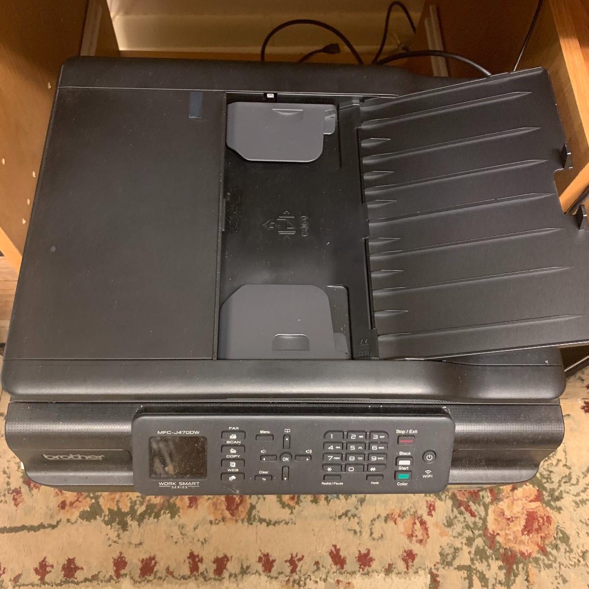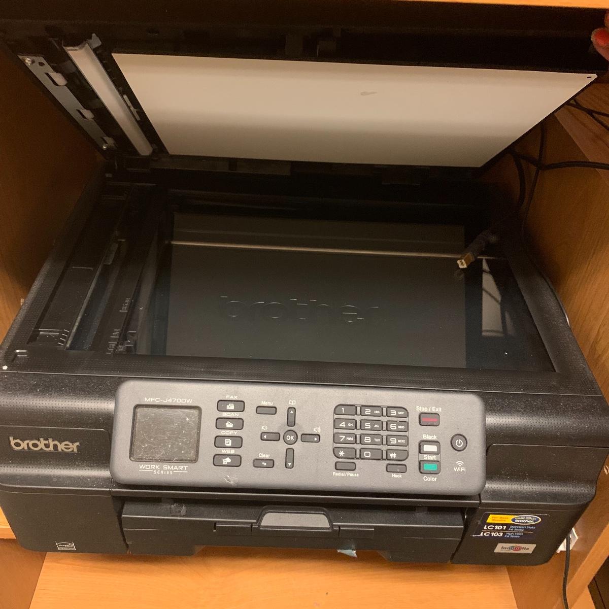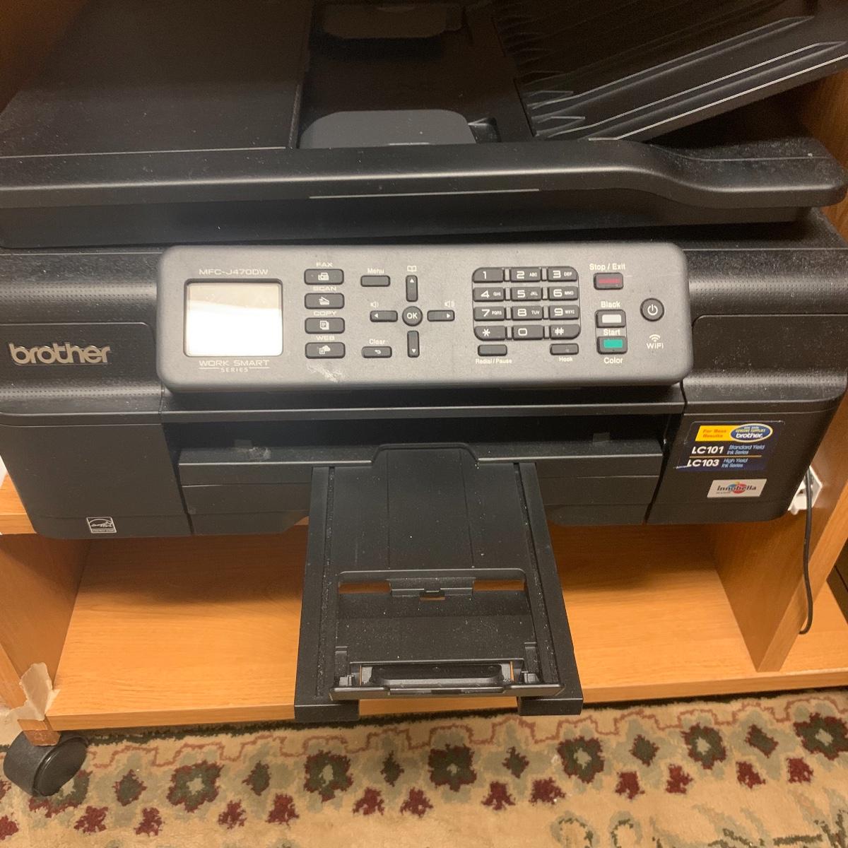 This lot includes one Brother MFC-J470DW printer and eight cartridges of Brother ink. There are five packages of colored ink cartridges and three packages of black ink cartridges. The printer screen is slightly scratched (see photos). Cannot confirm the printer works. It measures 14.5in x 16in x 8in.