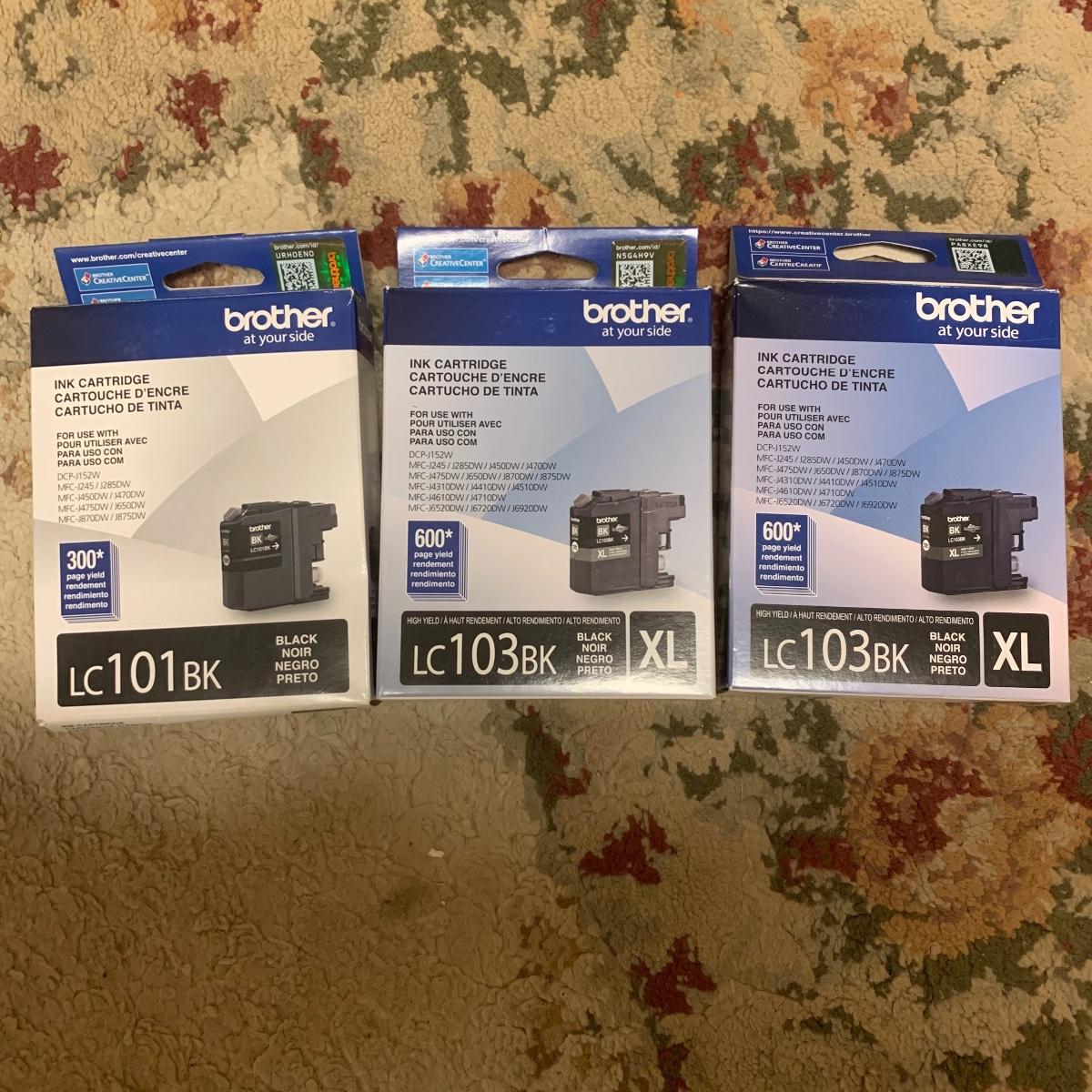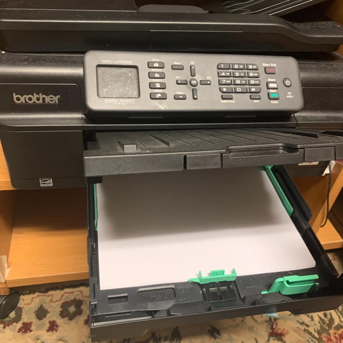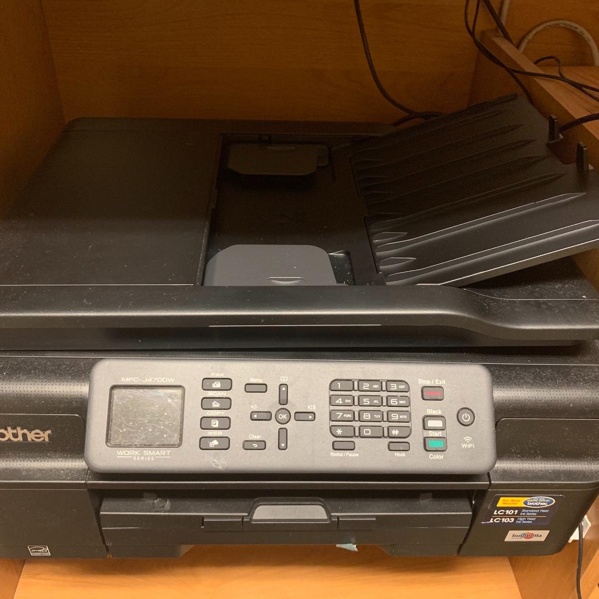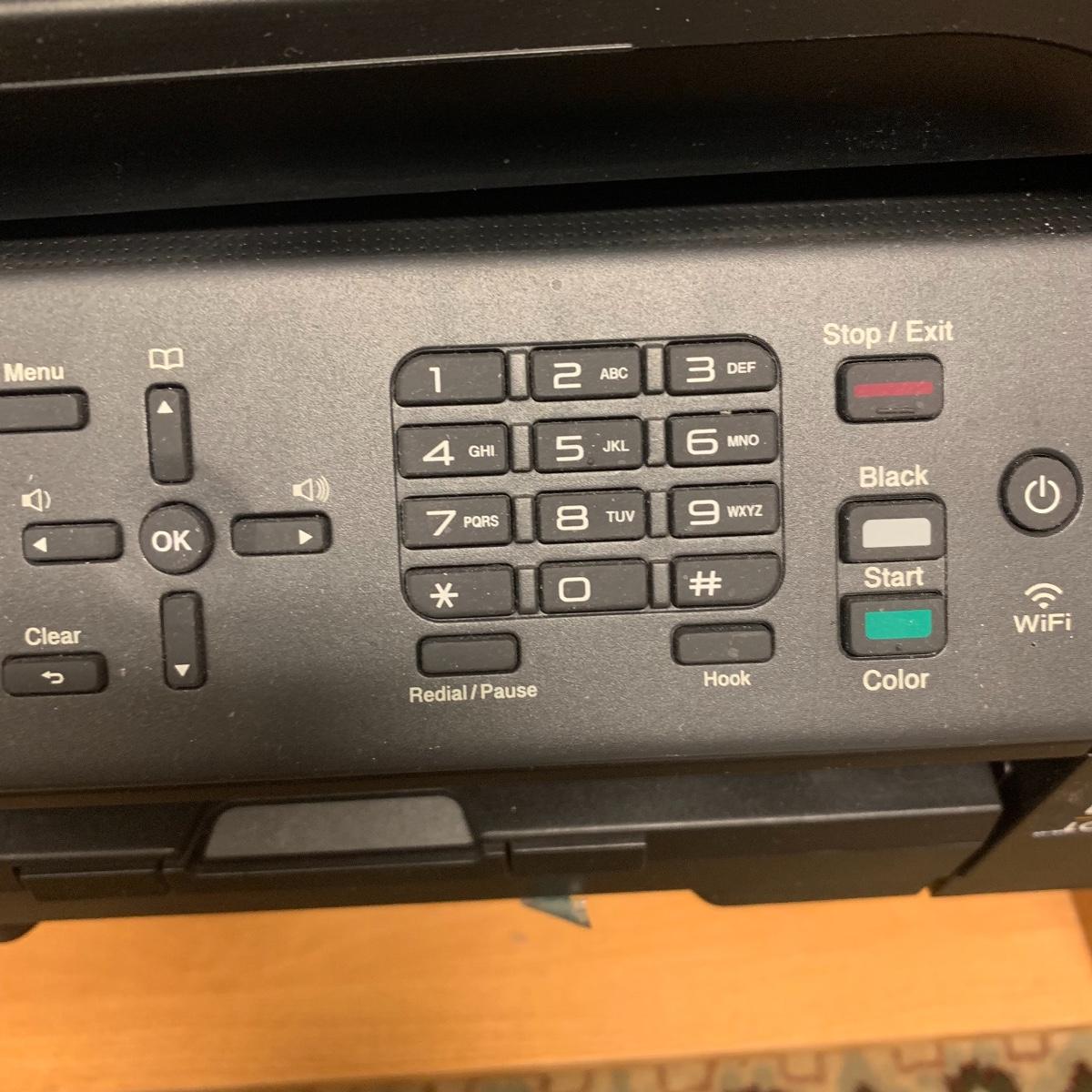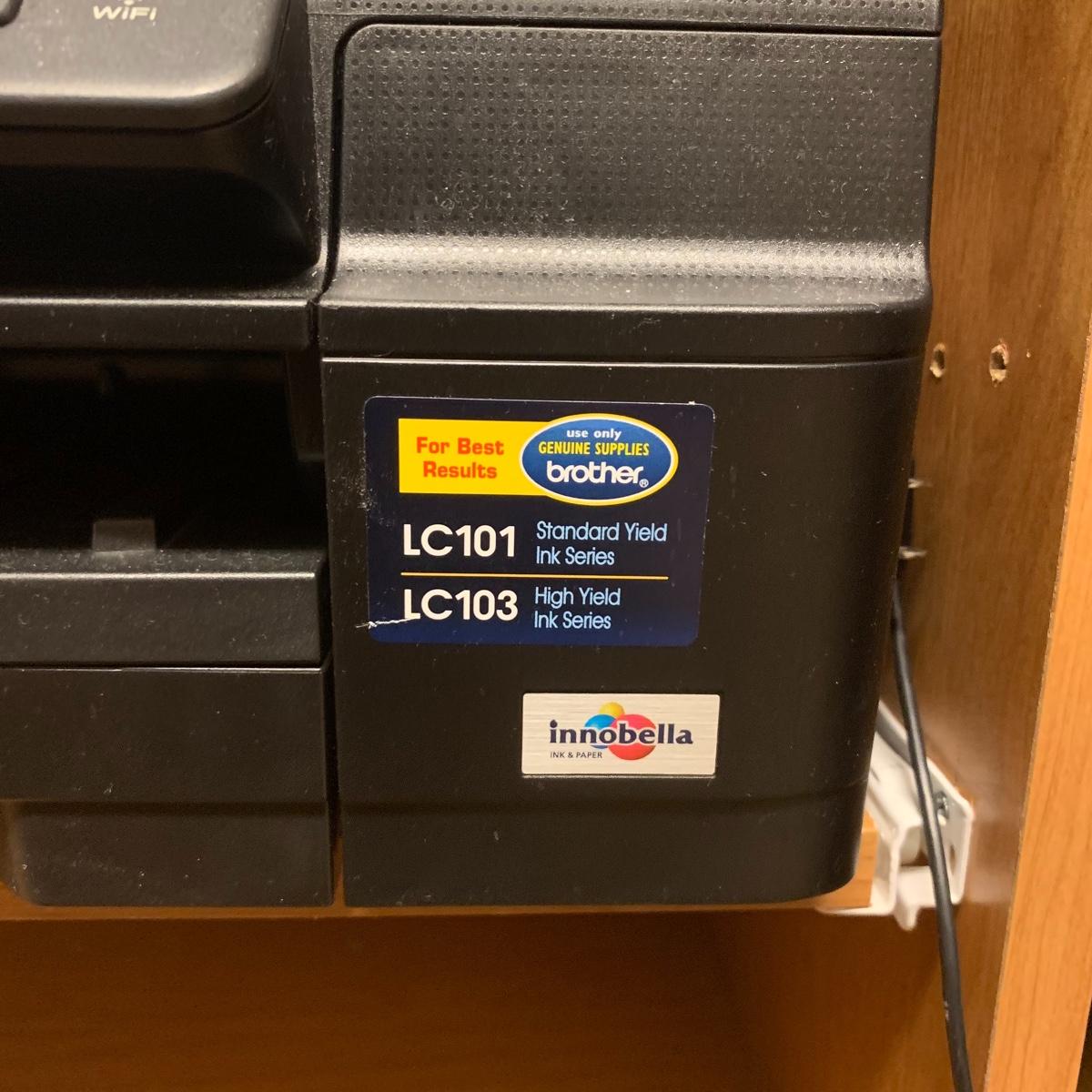 This lot includes one Brother MFC-J470DW printer and eight cartridges of Brother ink. There are five packages of colored ink cartridges and three packages of black ink cartridges. The printer screen is slightly scratched (see photos). Cannot confirm the printer works. It measures 14.5in x 16in x 8in.