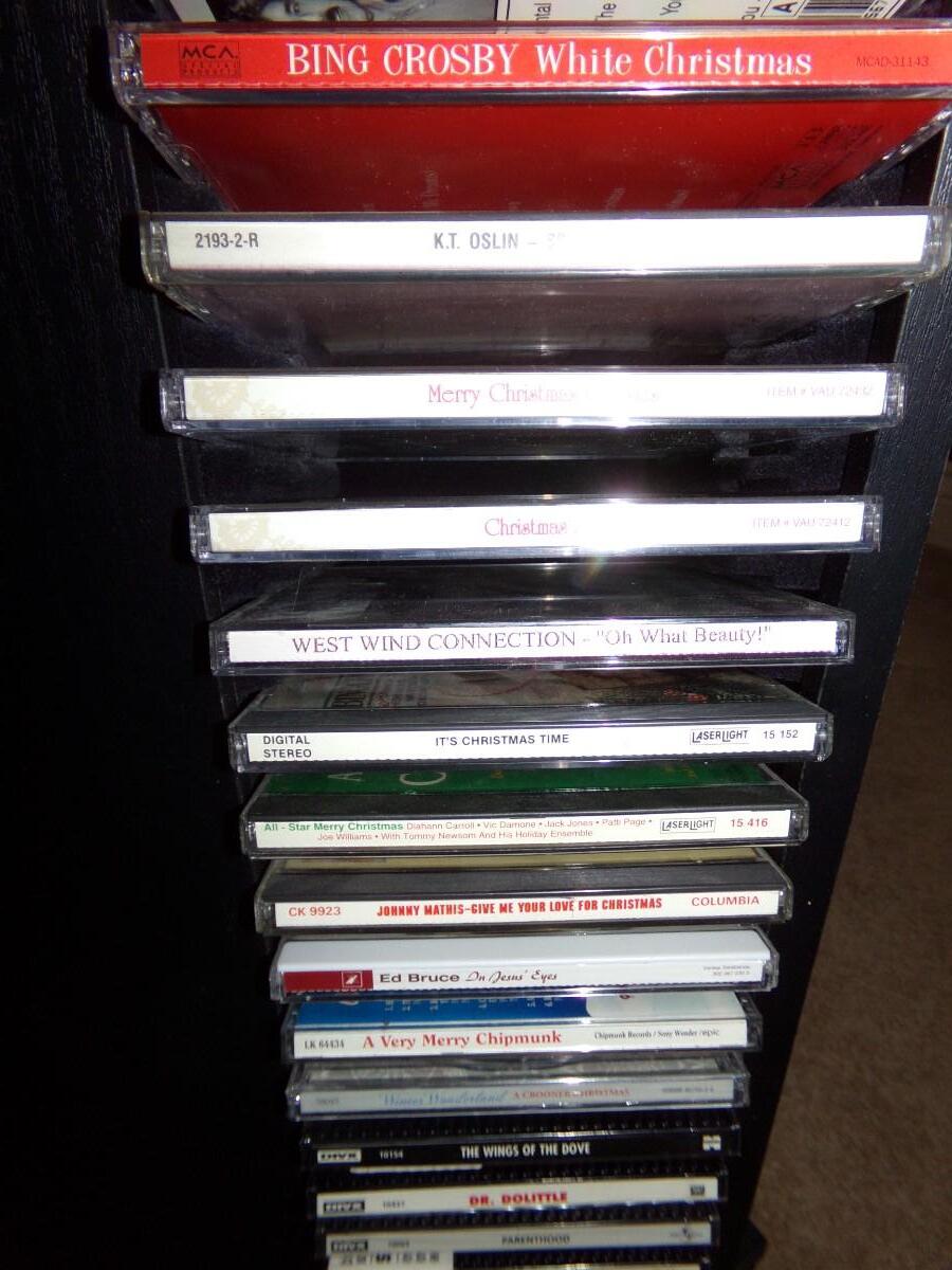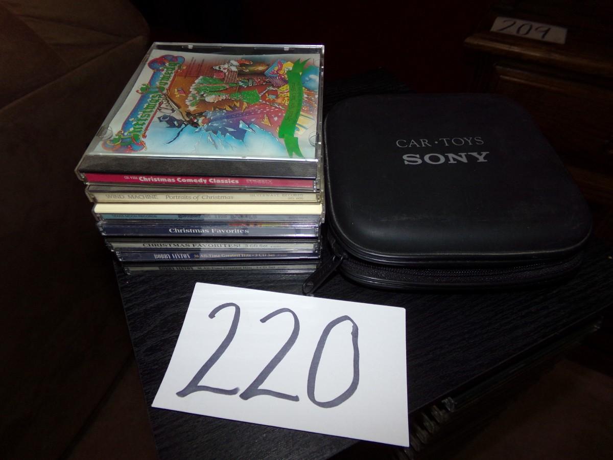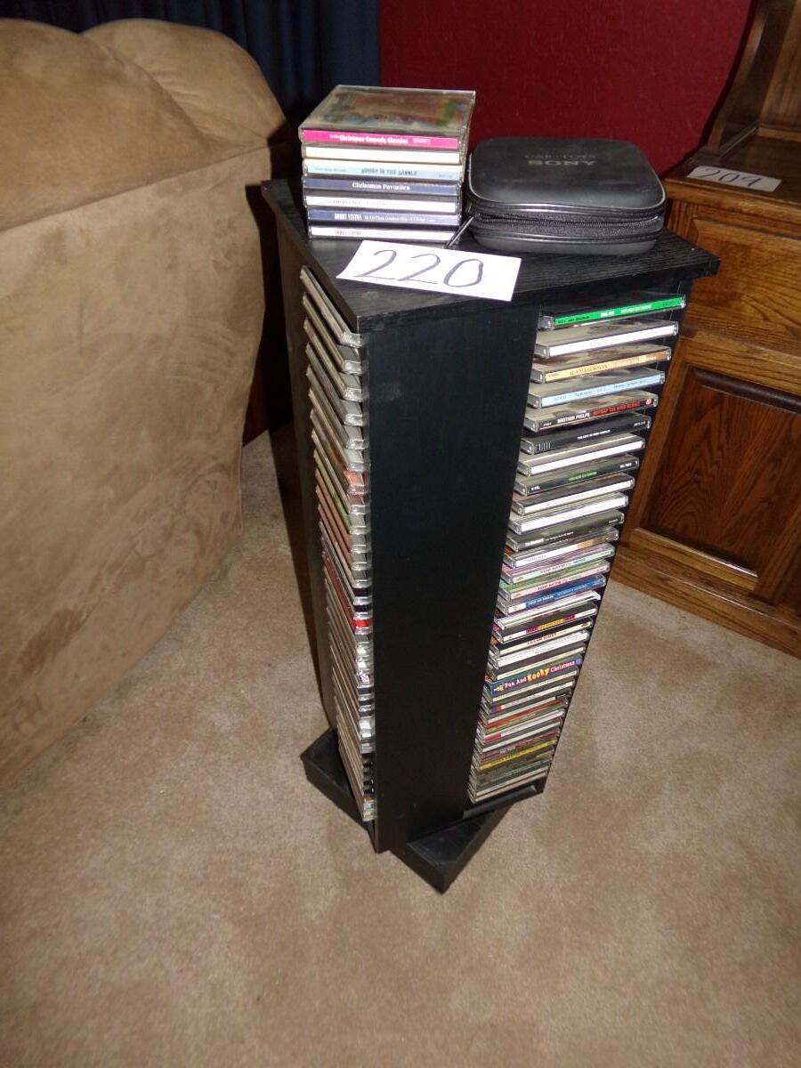 4 SIDED CD TOWER WITH VARIOUS CD'S. THERE IS ALSO A SONY CD CARRYING CASE.