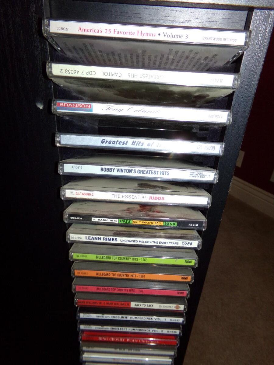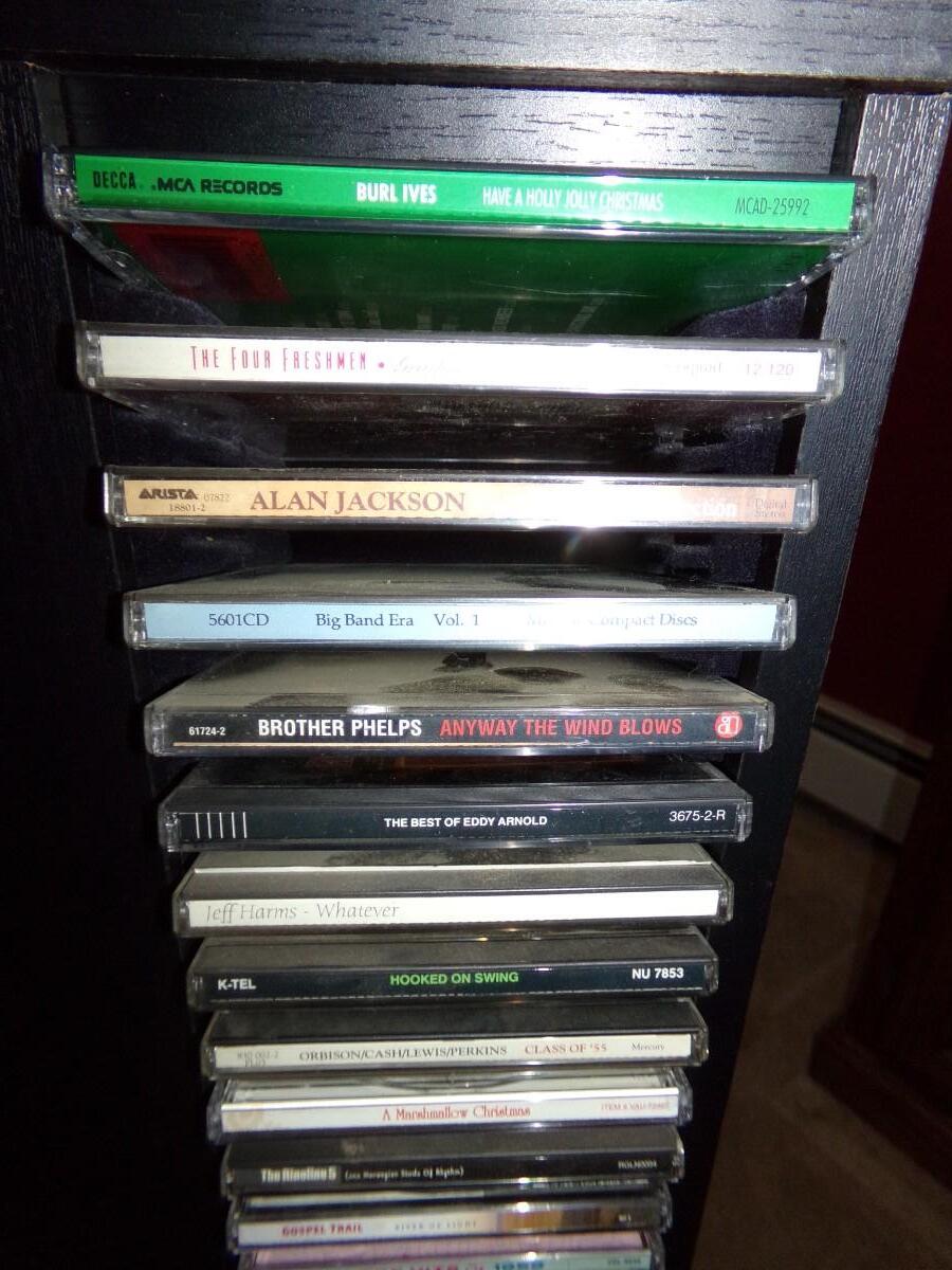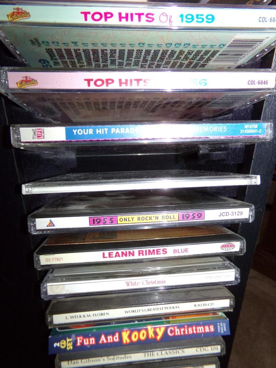 4 SIDED CD TOWER WITH VARIOUS CD'S. THERE IS ALSO A SONY CD CARRYING CASE.