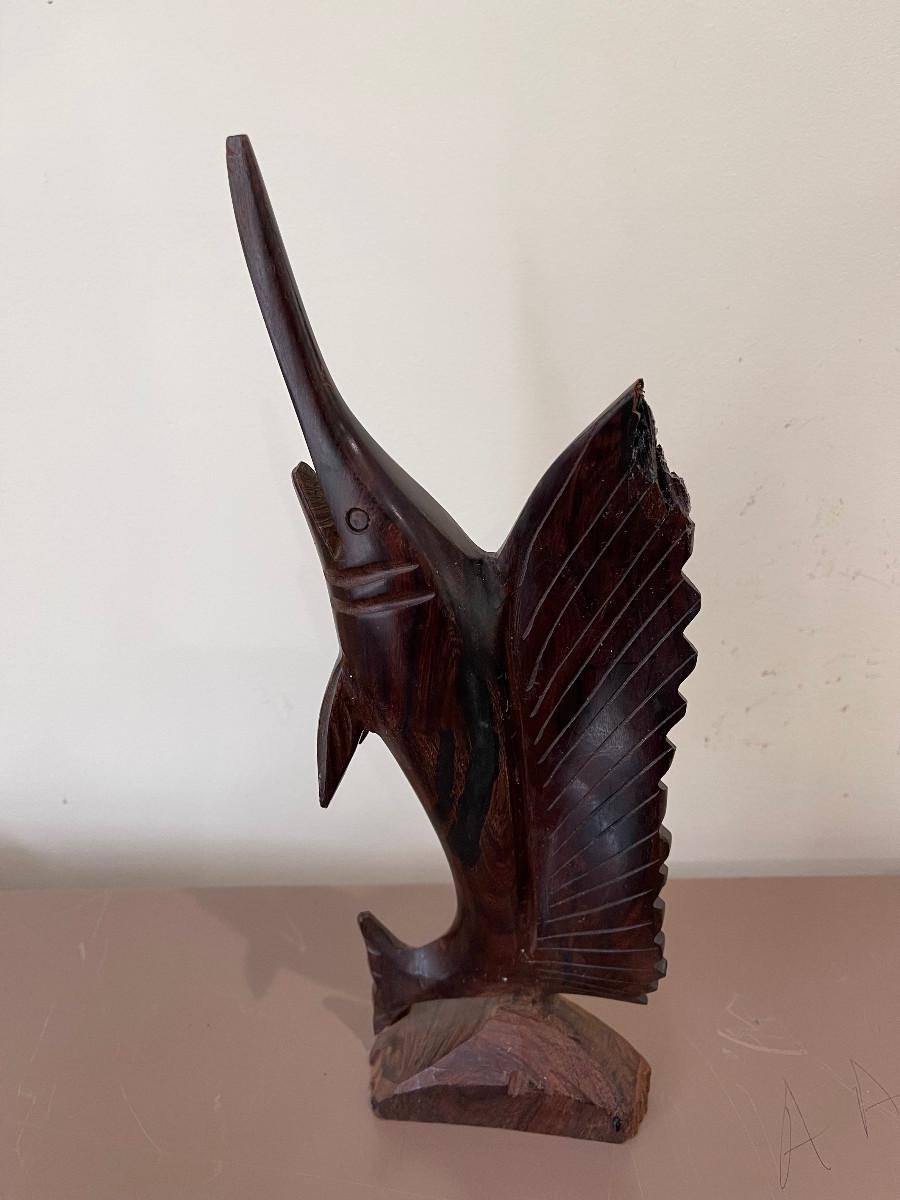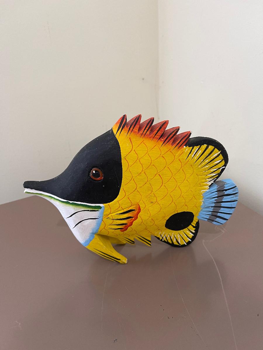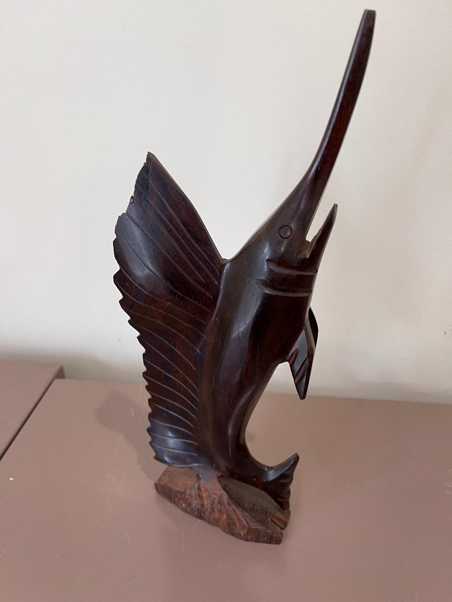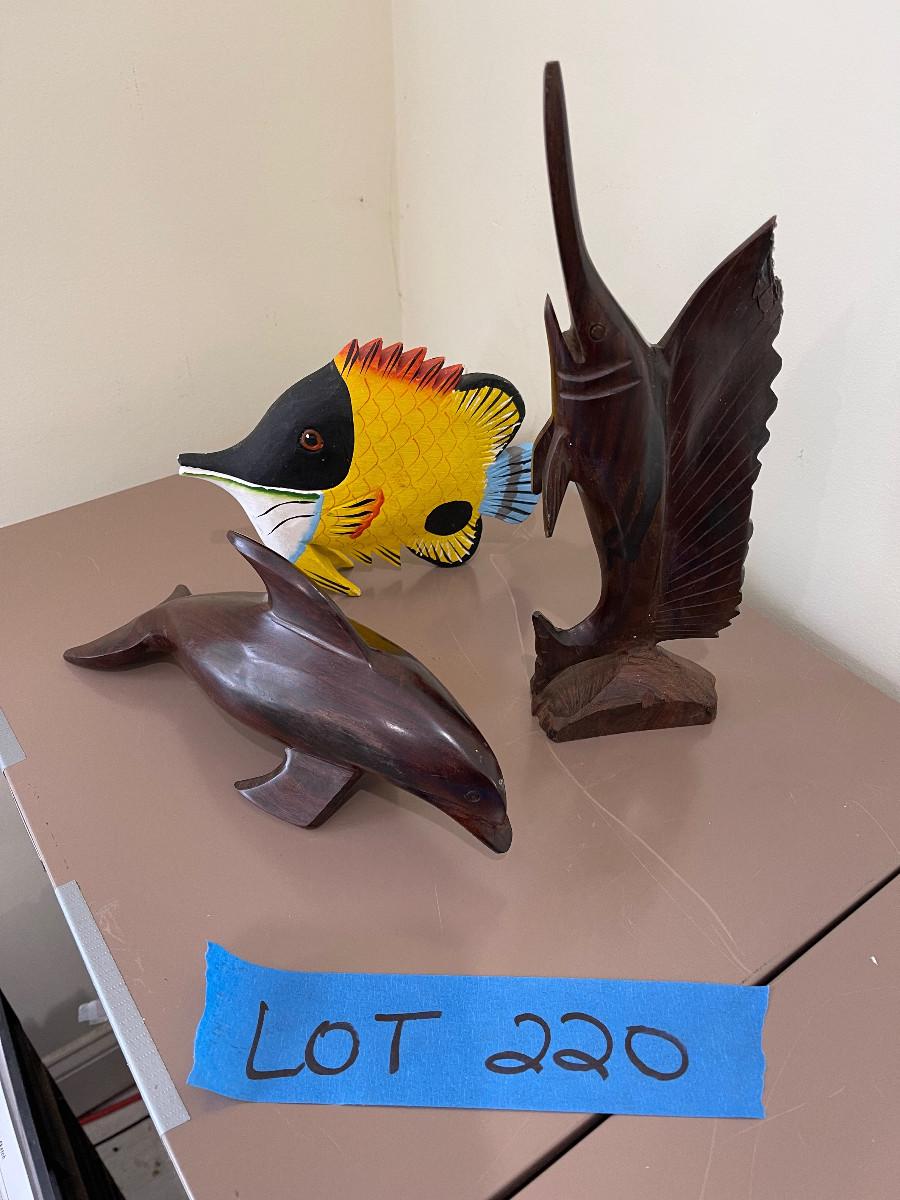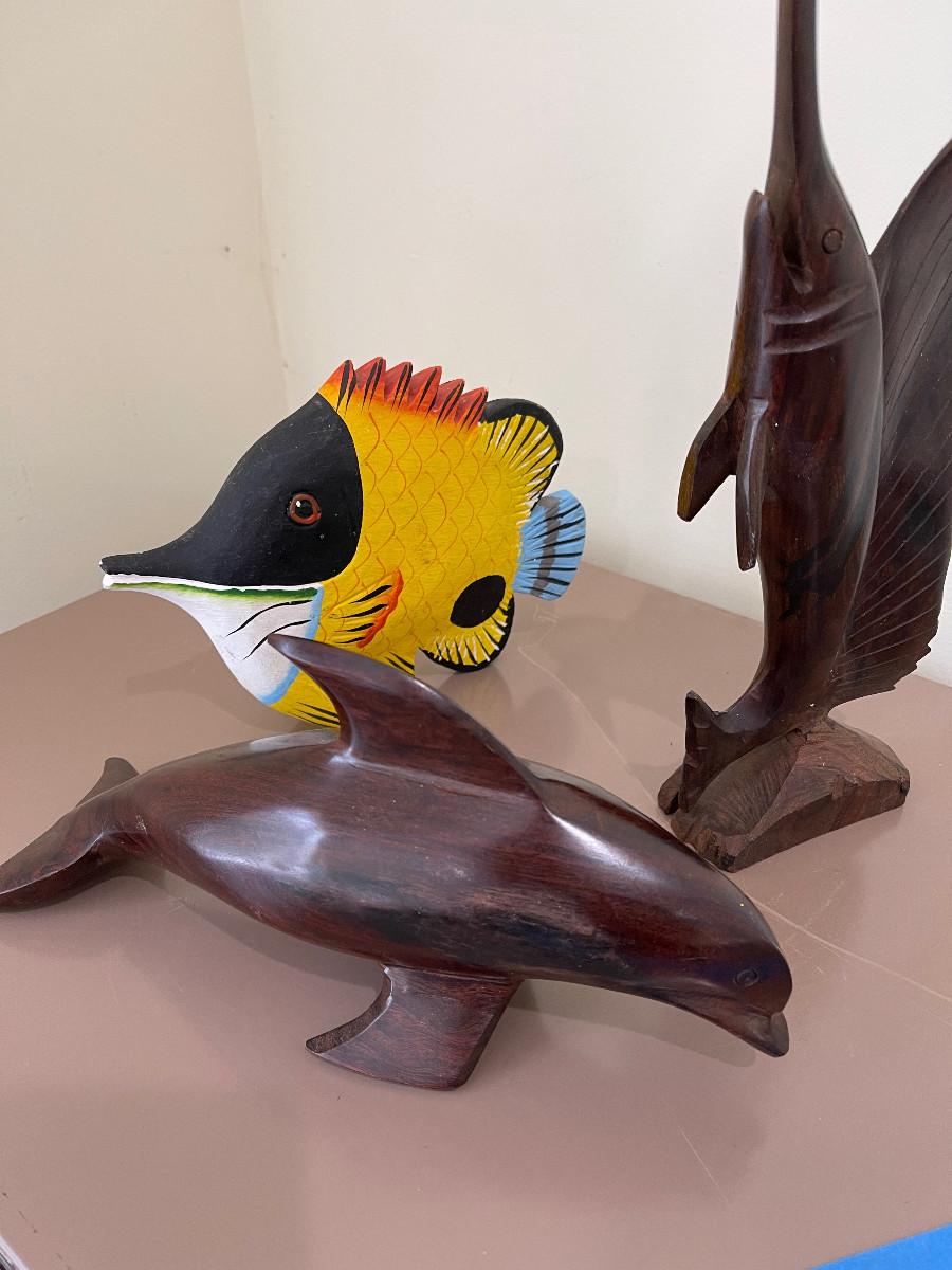 Hand Carved Dolphin, Sword Fish and Tropical Fish.