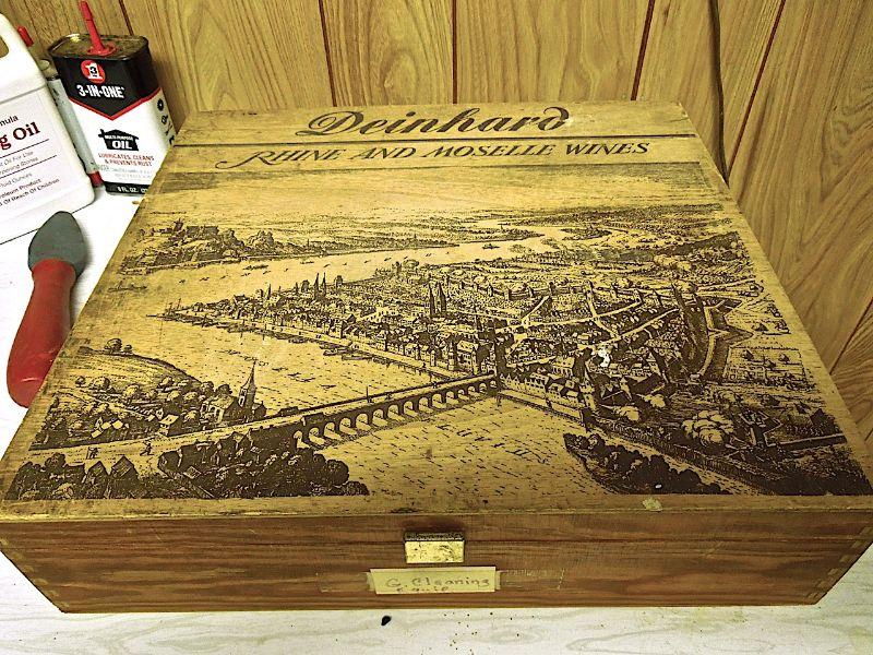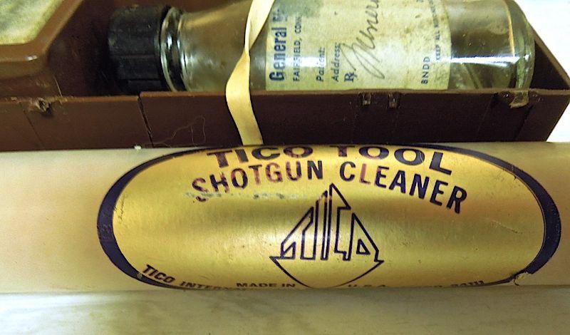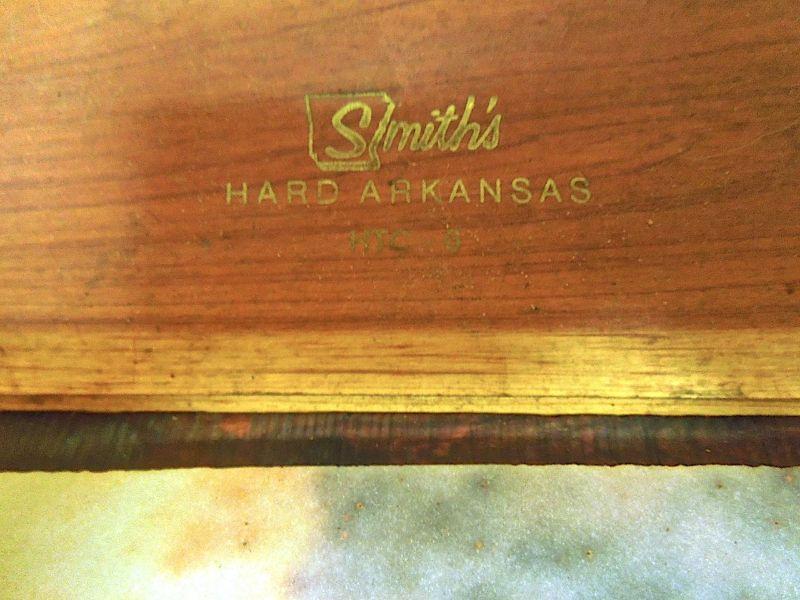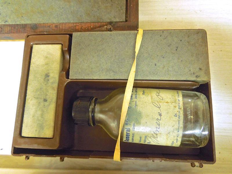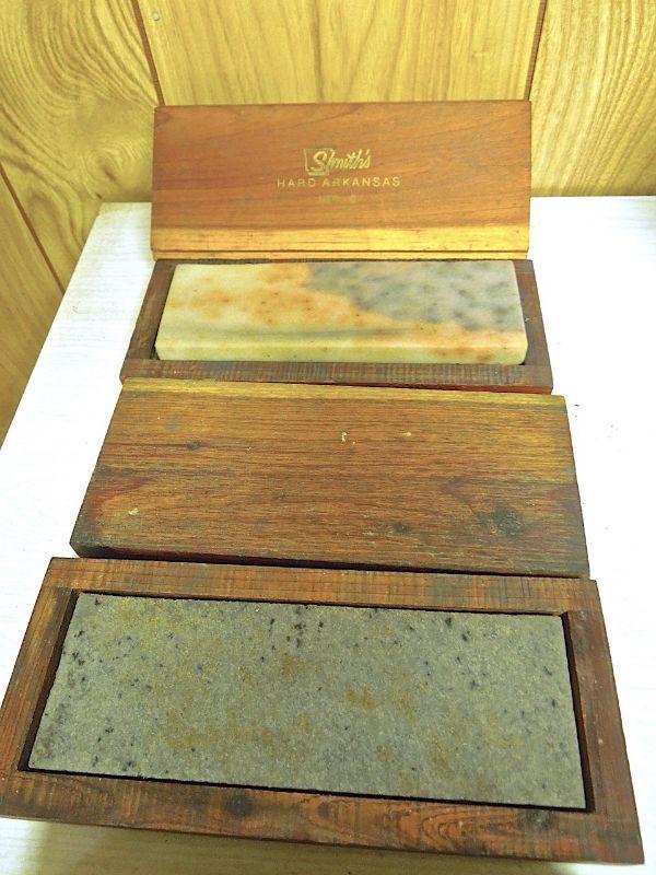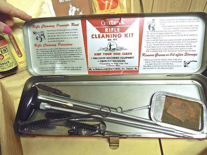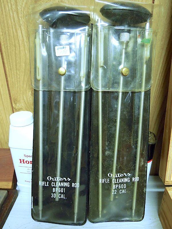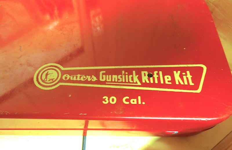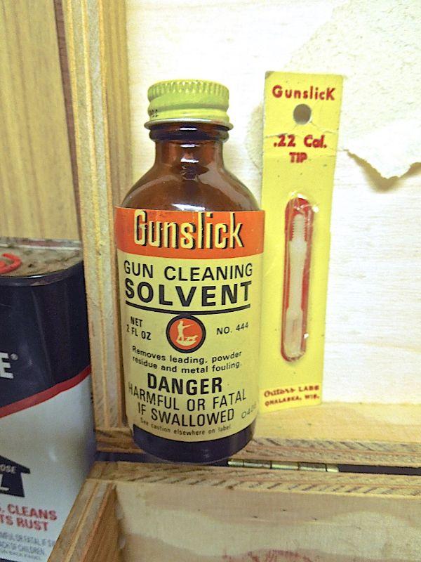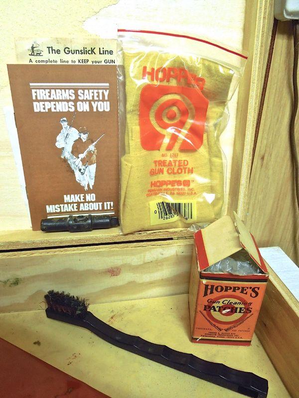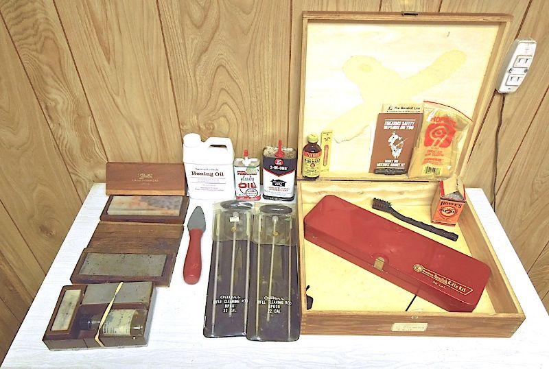 A wood collectible box with redmetal Outers Gunslick rifle cleaning kit, gunslick solvent, a shotgun Ticotool shotgun cleaning brush in plastic case, gun patches, and a braush. Also two Smith's Arkansas hard and soft sharpening stones; an additional stone kit in box; a 22 and 30 caliber rifle cleaning rods; honing oil, and more.