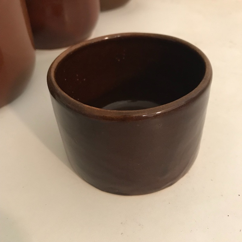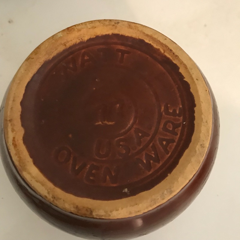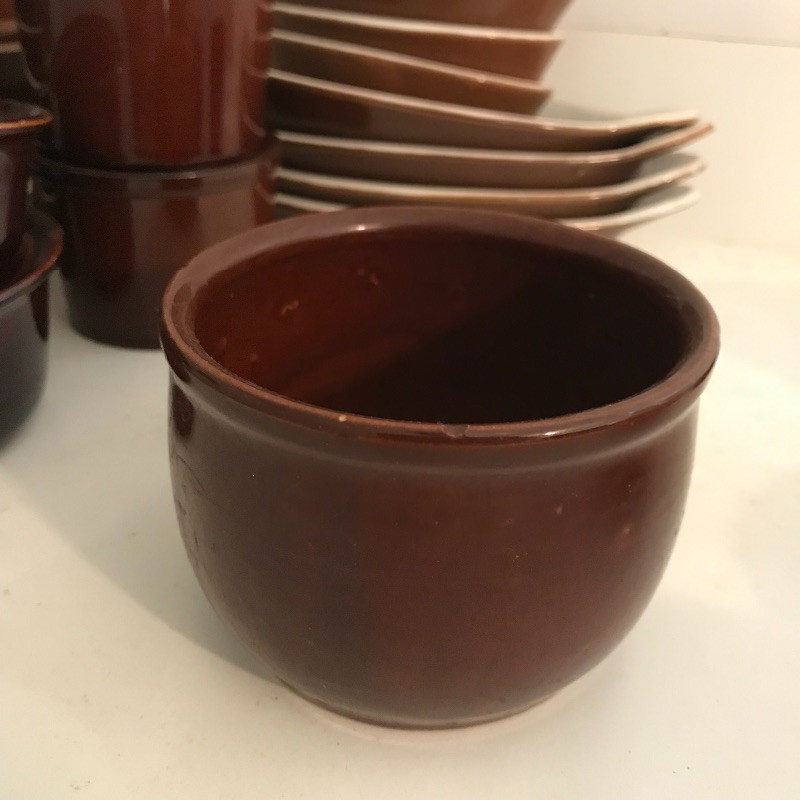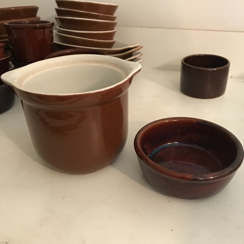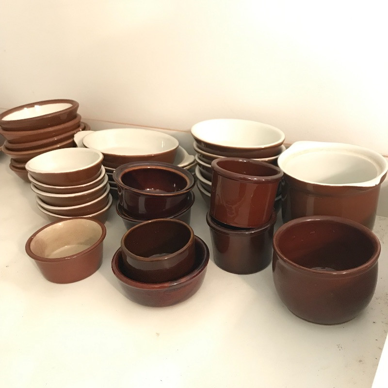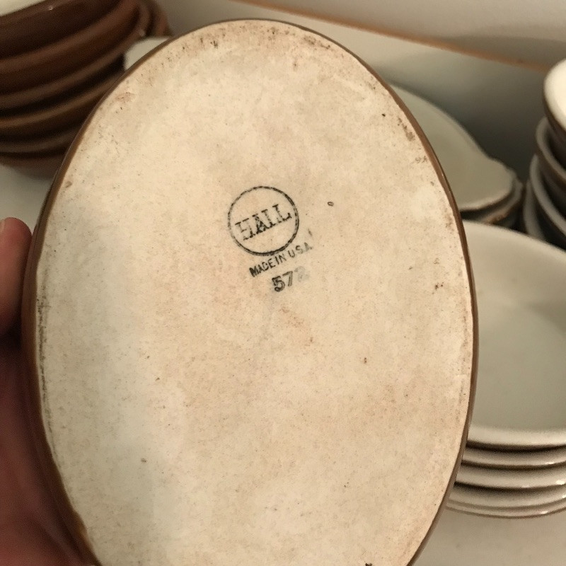 Huge collection of Hall Pottery along with some other names like Weller, Jaxton, R-1, Watt and more, see images for all that is in this lot. Items are cream and brown and only one brown piece does not have a known mark or stamp. The large Hall bowl is 5.5”d x 4.5” and the longest handled dishes are 10” x 5.5” x 1.5”. Local Pickup Only.