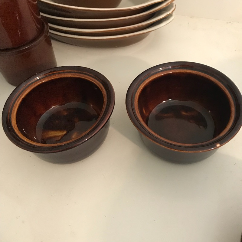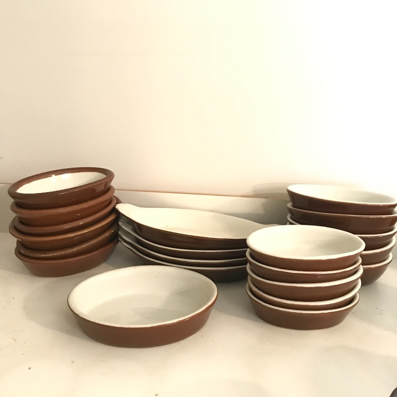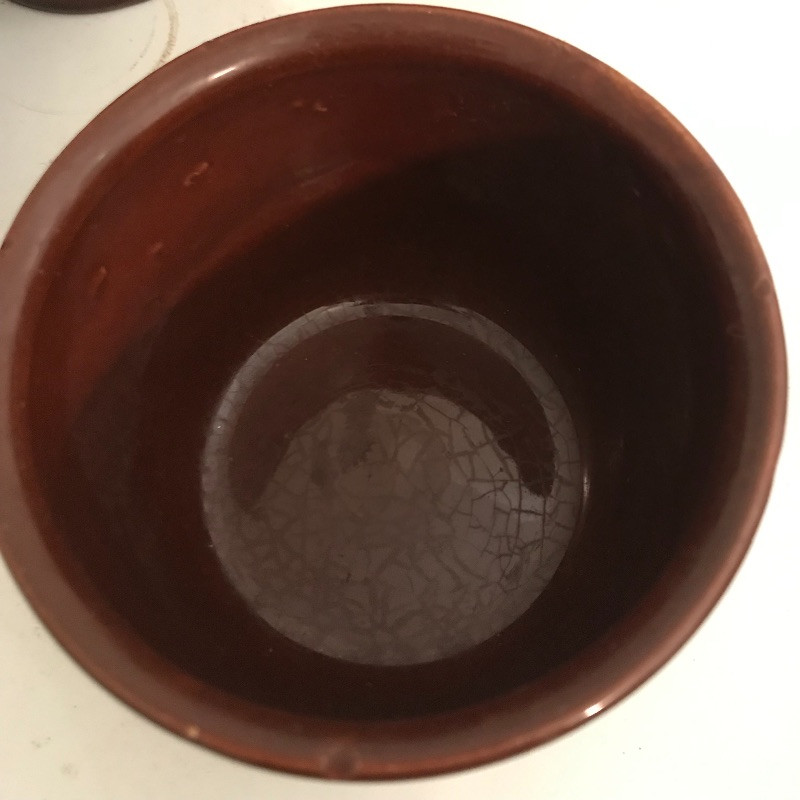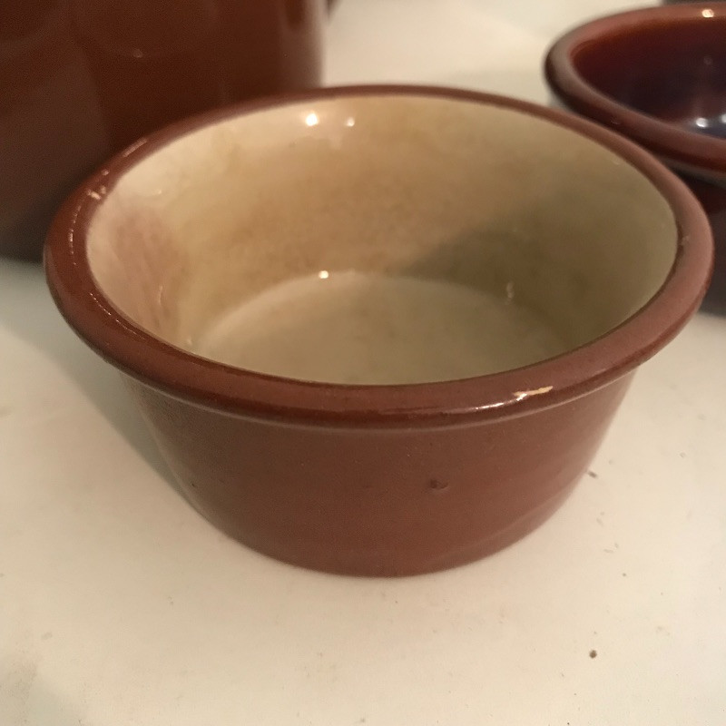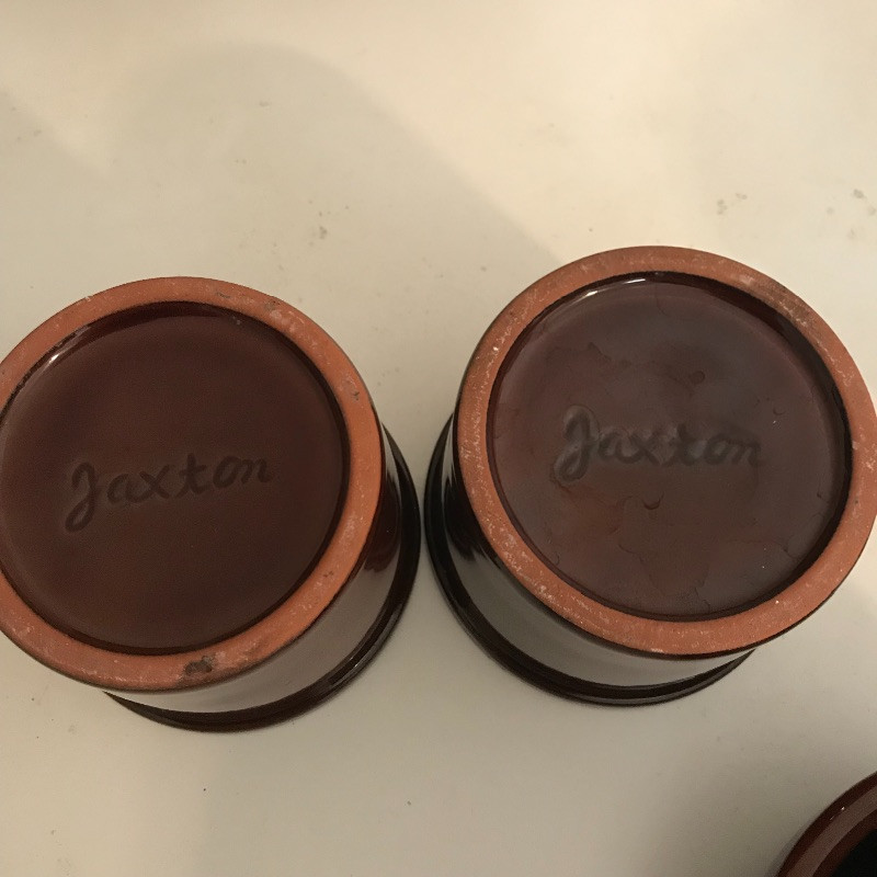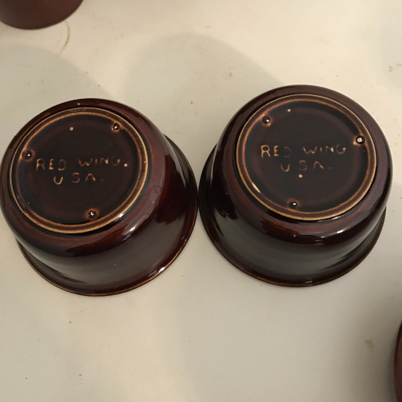 Huge collection of Hall Pottery along with some other names like Weller, Jaxton, R-1, Watt and more, see images for all that is in this lot. Items are cream and brown and only one brown piece does not have a known mark or stamp. The large Hall bowl is 5.5”d x 4.5” and the longest handled dishes are 10” x 5.5” x 1.5”. Local Pickup Only.