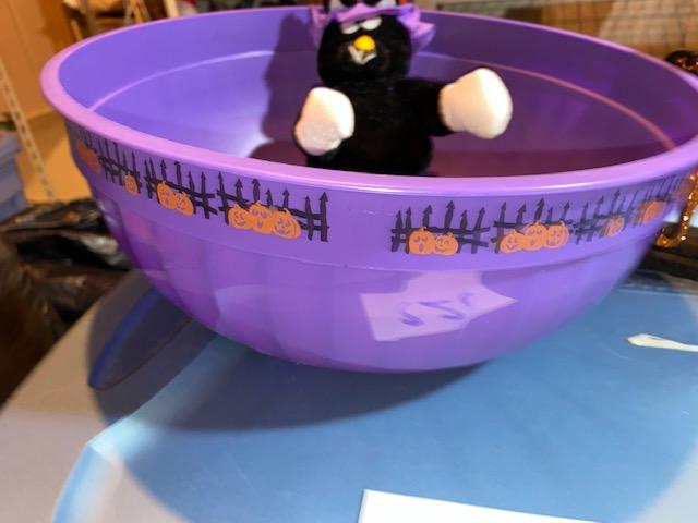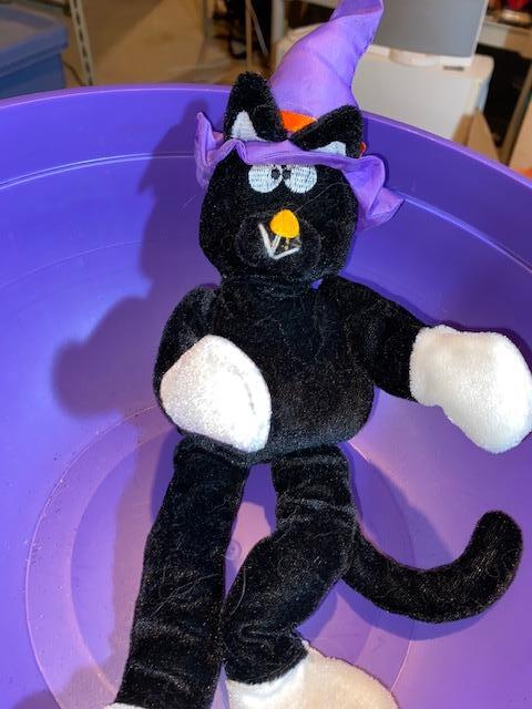 two bowls, plush cat, and dec