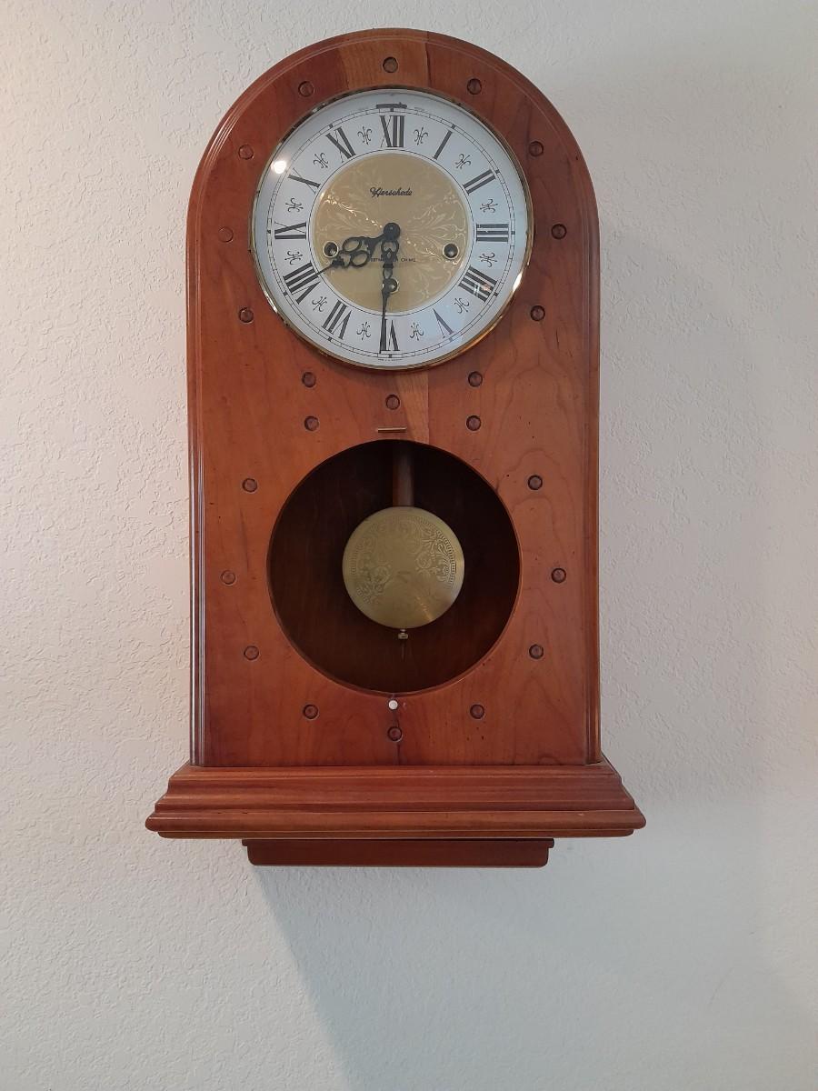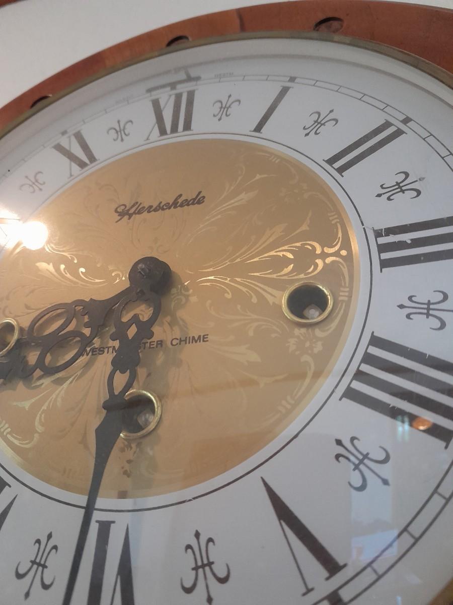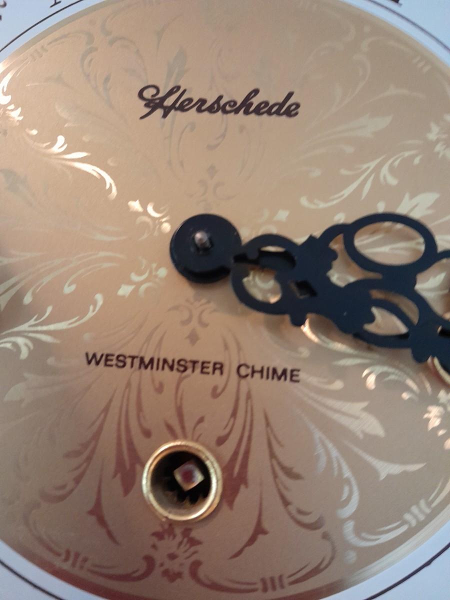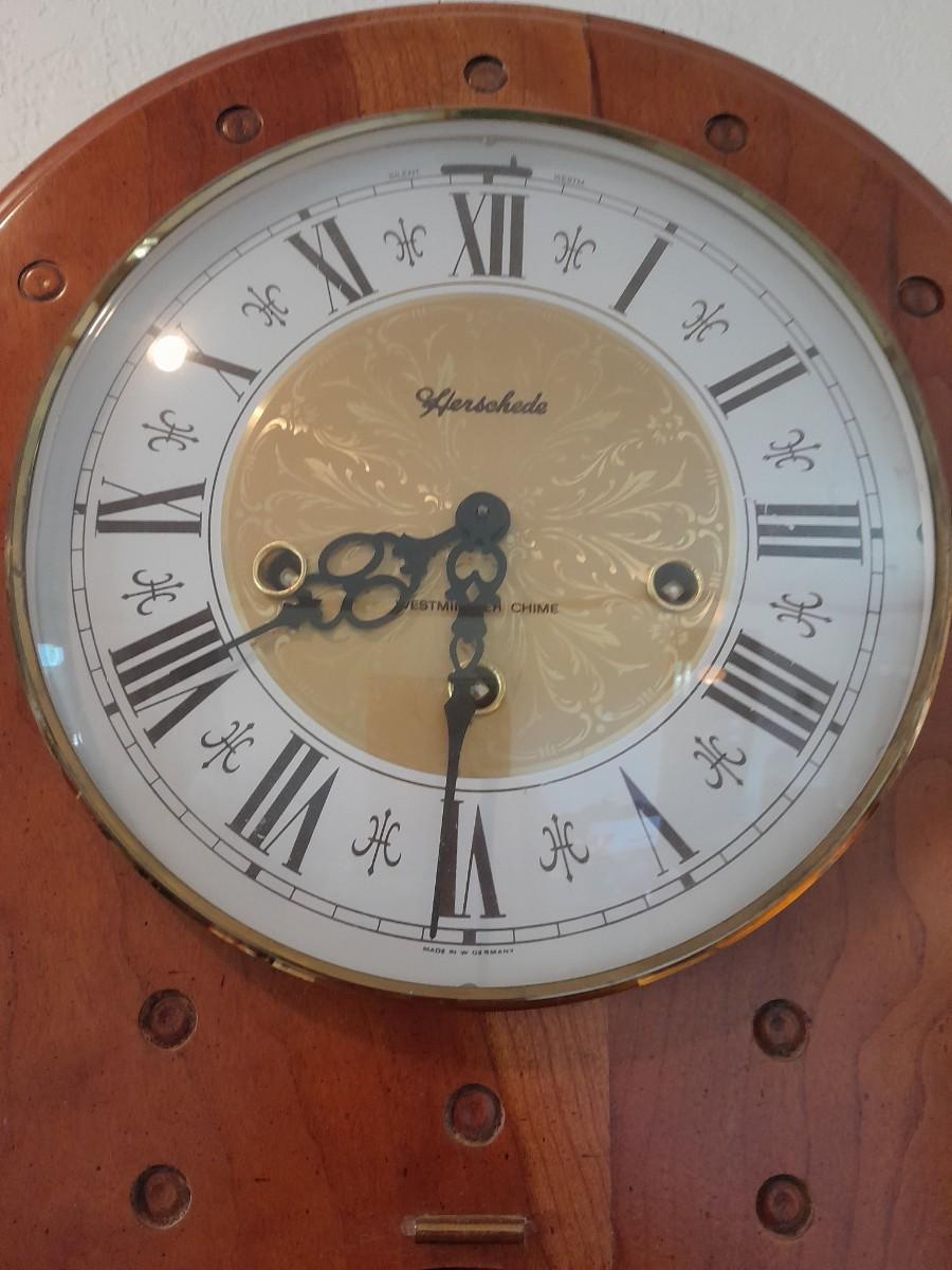 HERSCHEDE GOLD METAL PENDULUM WALL CLOCK WITH WESTMINSTER CHIME AND KEY 24" X 13.5"