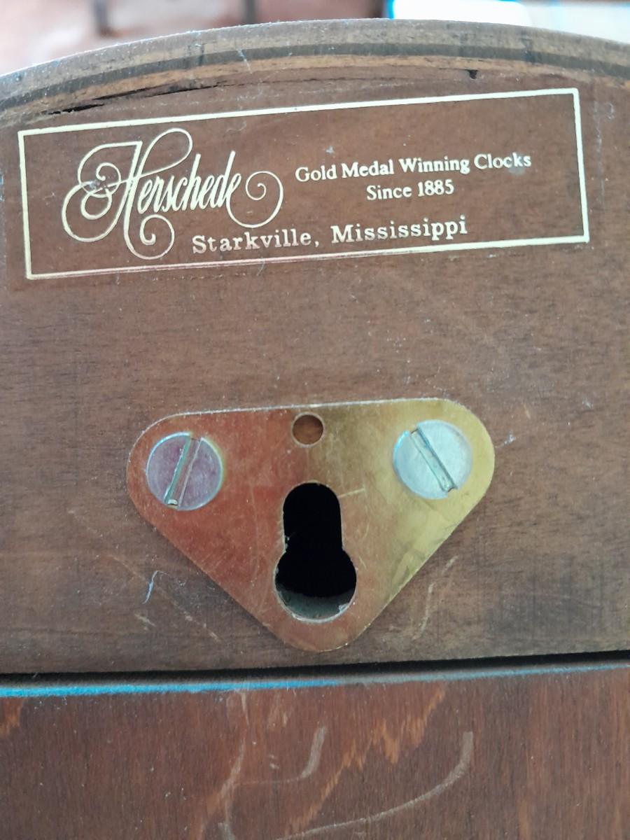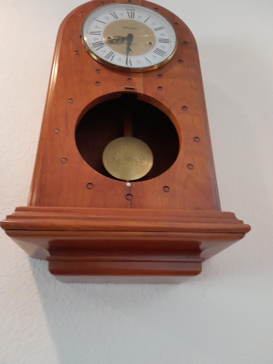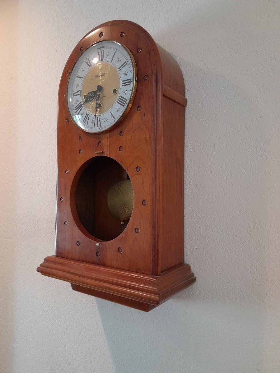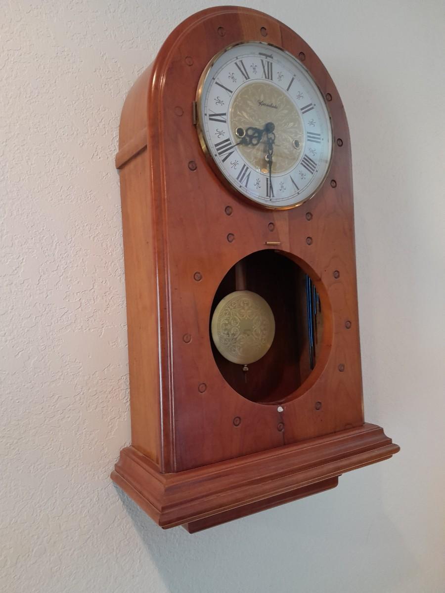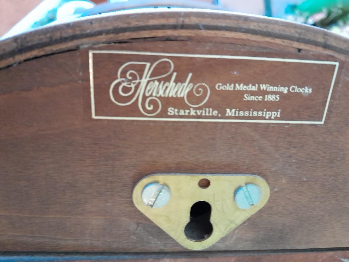 HERSCHEDE GOLD METAL PENDULUM WALL CLOCK WITH WESTMINSTER CHIME AND KEY 24" X 13.5"