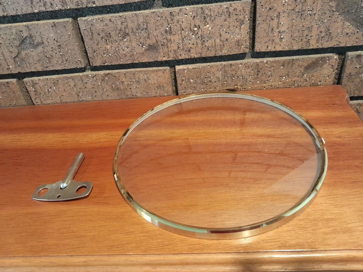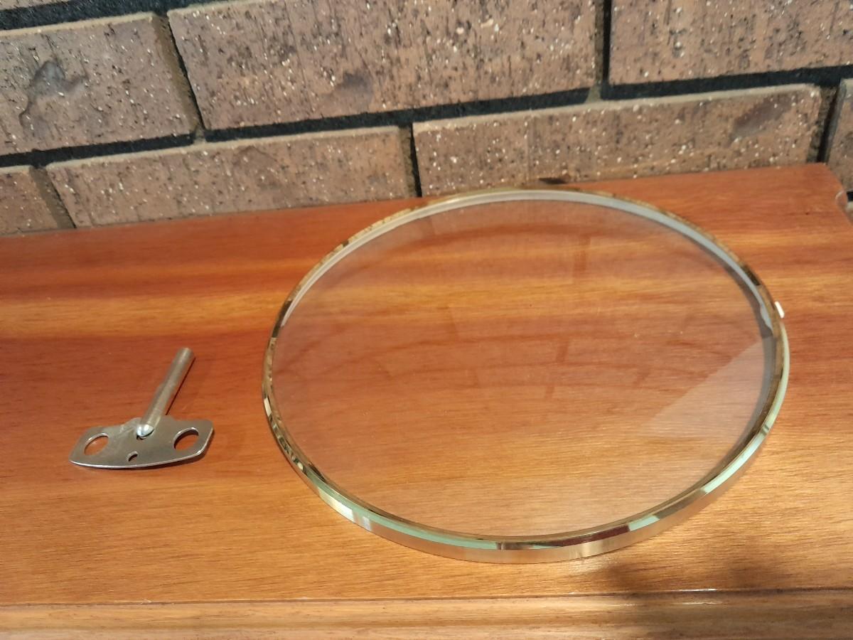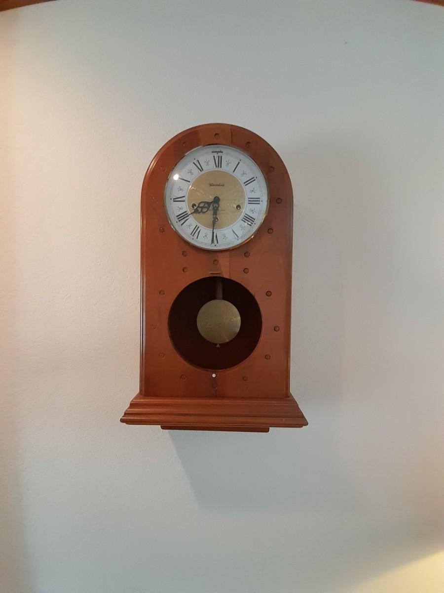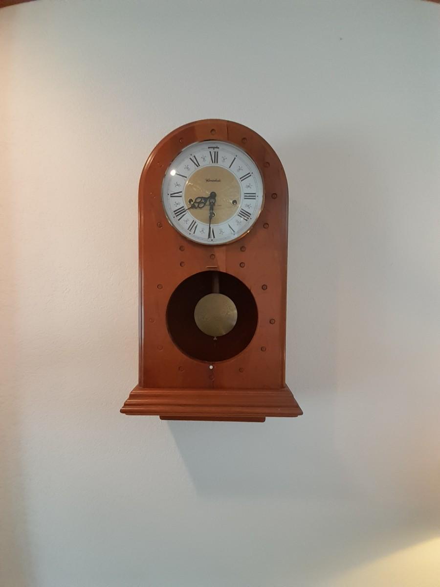 HERSCHEDE GOLD METAL PENDULUM WALL CLOCK WITH WESTMINSTER CHIME AND KEY 24" X 13.5"