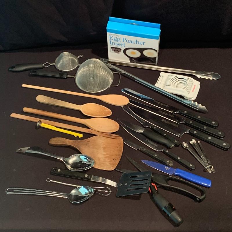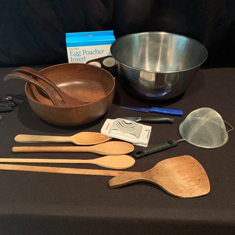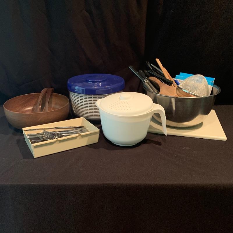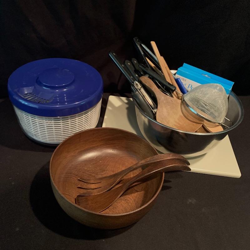 This lot includes all the kitchen utensils you could ever need, and more! Lot features six Henkel kitchen knives. There is a 29-piece set of Oneida cutlery, a nice hand turned wooden salad bowl with wooden serving utensils, a hefty cutting board, and a salad spinner. There are also two metal bowls. The large metal bowl is filled with utensils, like tongs, metal strainers, kitchen scissors with a swivel handle, measuring spoons, spatulas, wooden spoons, a variety of other knives, and more. Local pickup only.