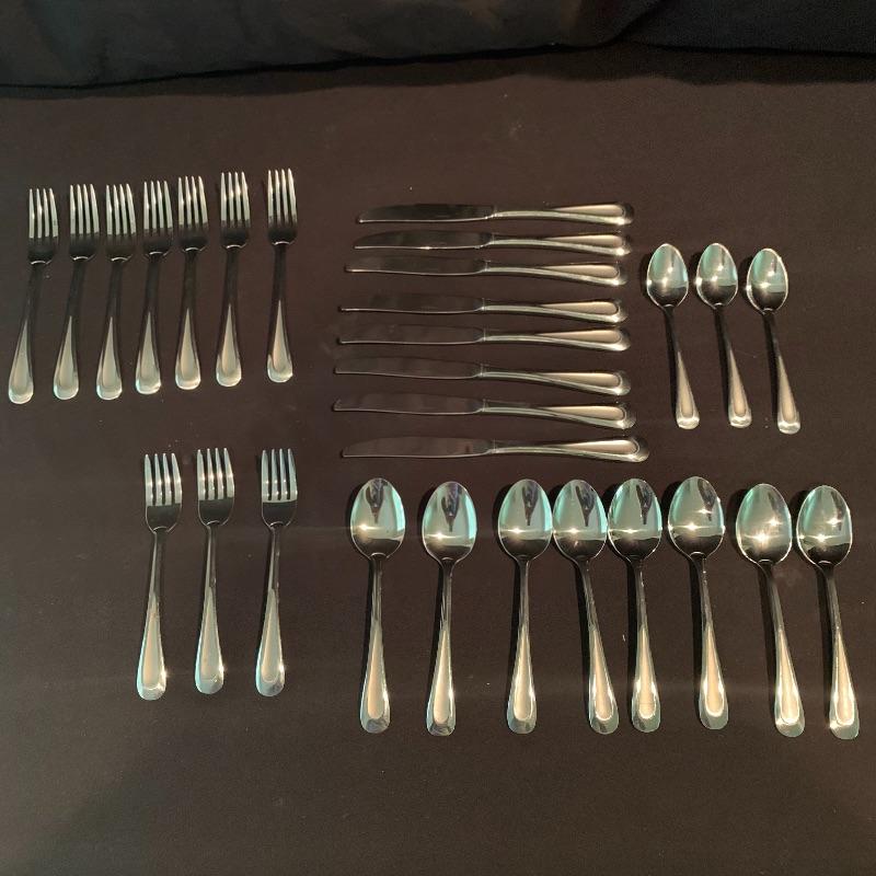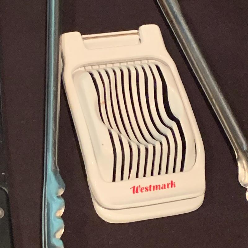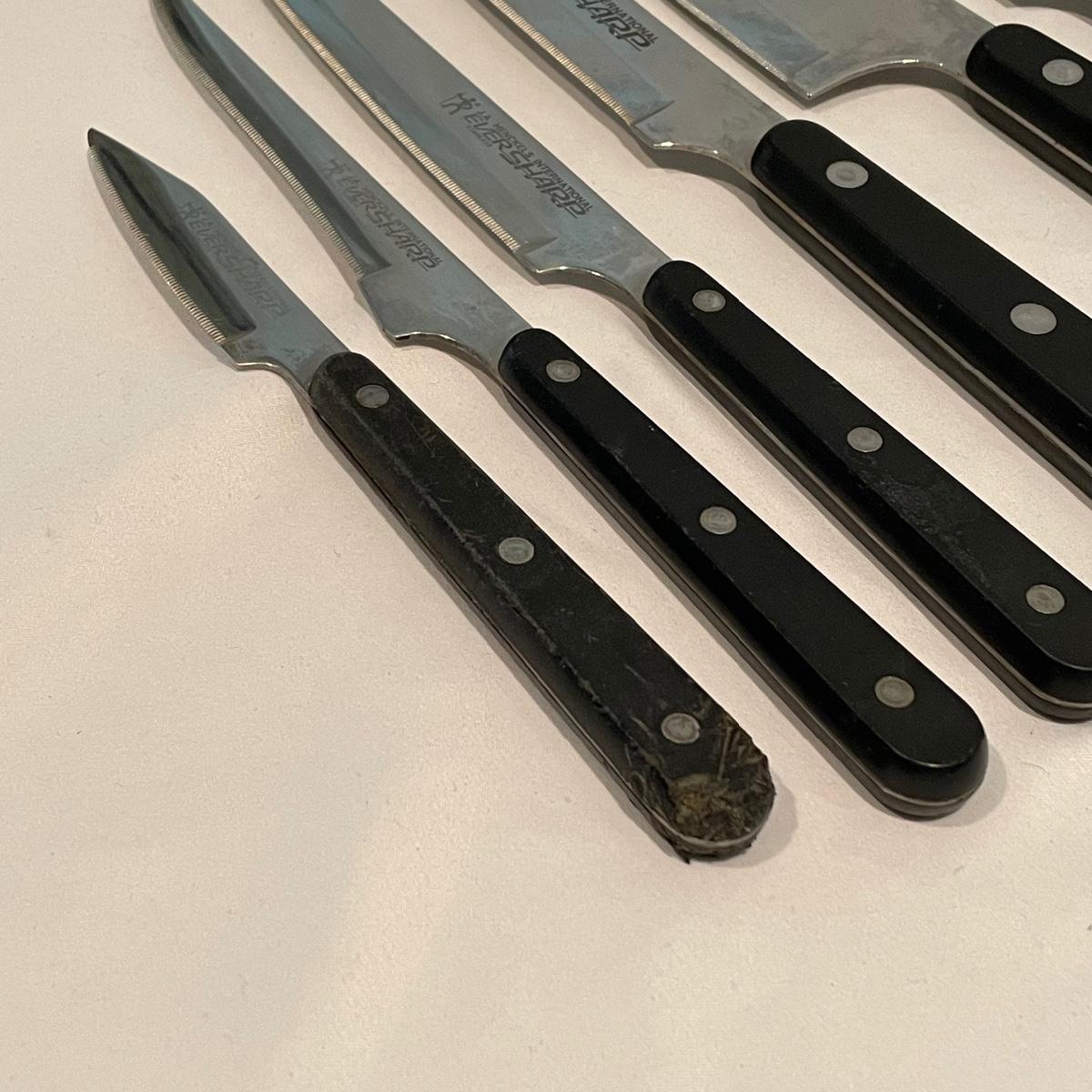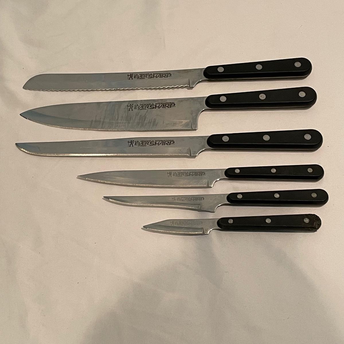 This lot includes all the kitchen utensils you could ever need, and more! Lot features six Henkel kitchen knives. There is a 29-piece set of Oneida cutlery, a nice hand turned wooden salad bowl with wooden serving utensils, a hefty cutting board, and a salad spinner. There are also two metal bowls. The large metal bowl is filled with utensils, like tongs, metal strainers, kitchen scissors with a swivel handle, measuring spoons, spatulas, wooden spoons, a variety of other knives, and more. Local pickup only.