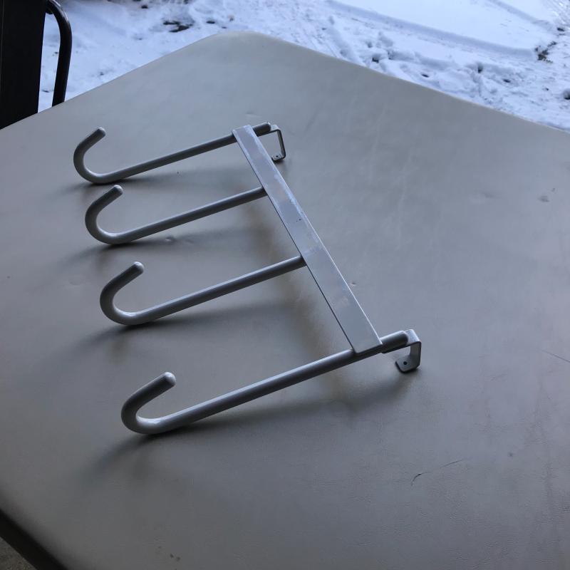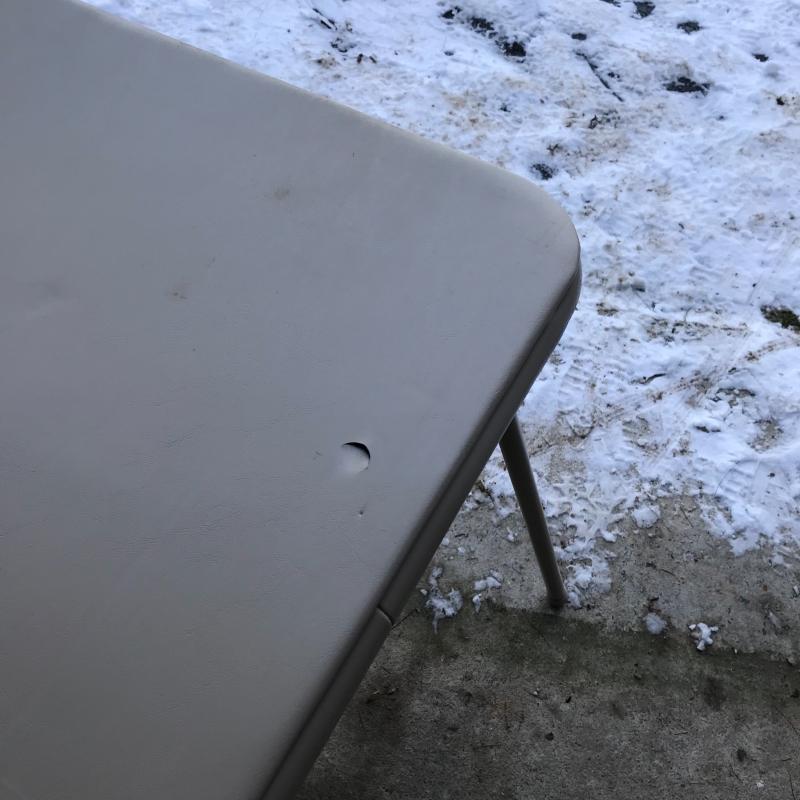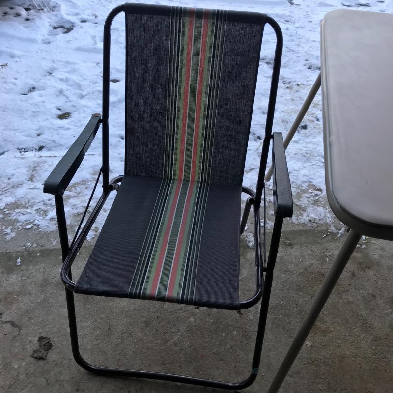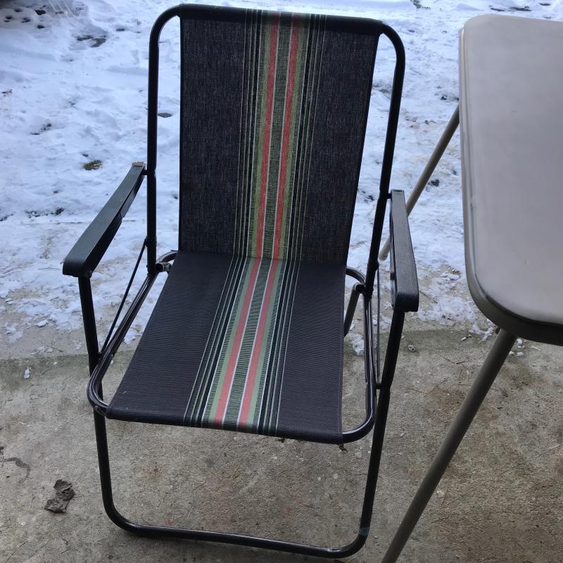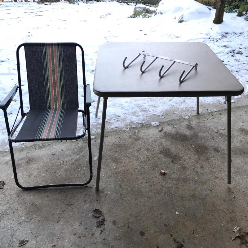 Folding lawn chair, folding table and metal door hooks. Lot available for local pick up in Flat Rock, NC only.