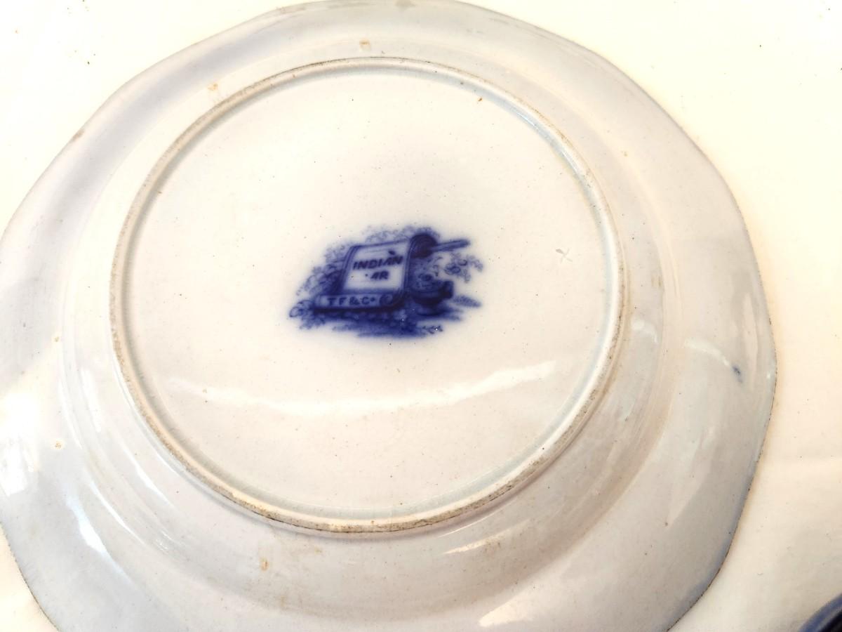 Attic Find! Lot of 3 Flow Blue English plates, ca. 1850. 2 matching small plates are 7.5" across - pattern is "Amoy". Larger plate is 8.25" across - one OLD chigger to rim (has turned brown) - pattern is "Indian Air." These look beautiful displayed on the wall OR in a cabinet.