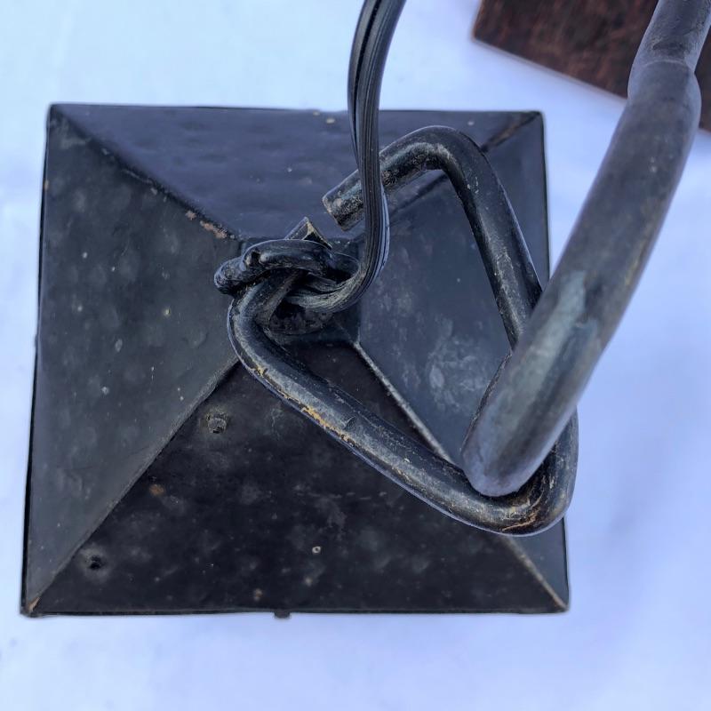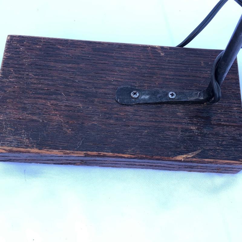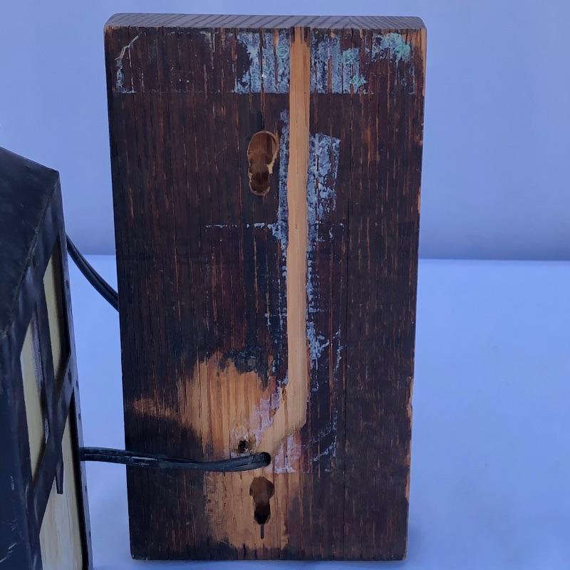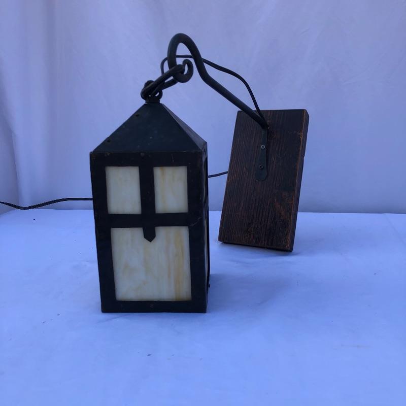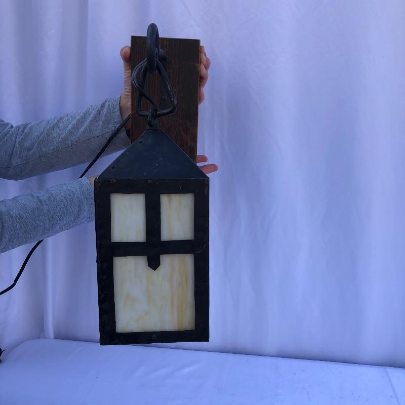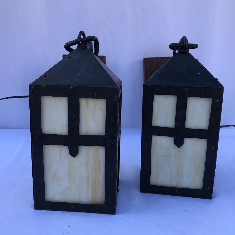 Pair of rustic mission style wall sconces with stained glass, metal and wood to mount and hang.