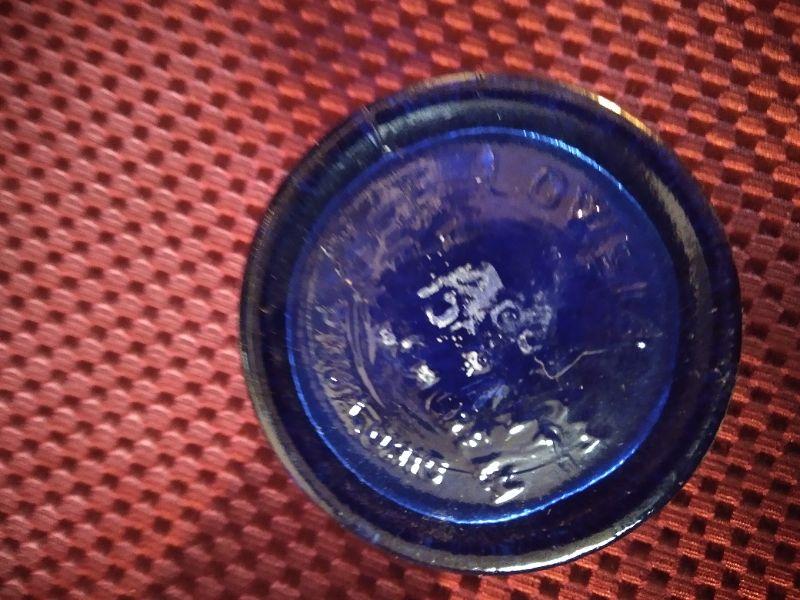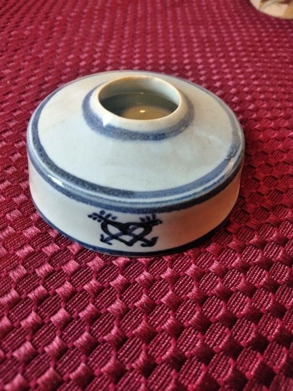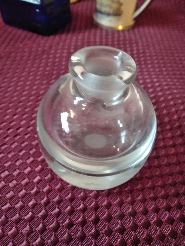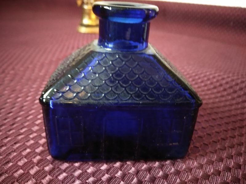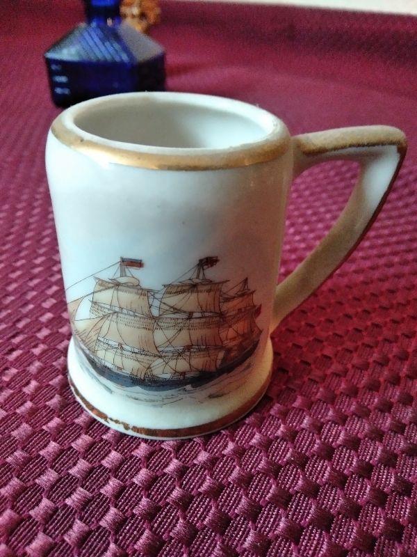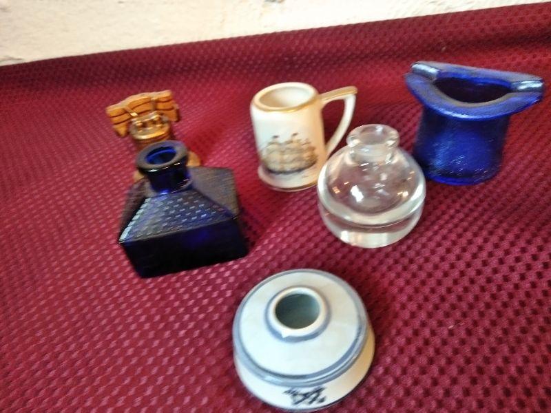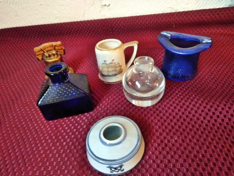 3 INK WELLS, BLUE GLASS TOP HAT, SMALL MUG WITH CLIPPER SHIP