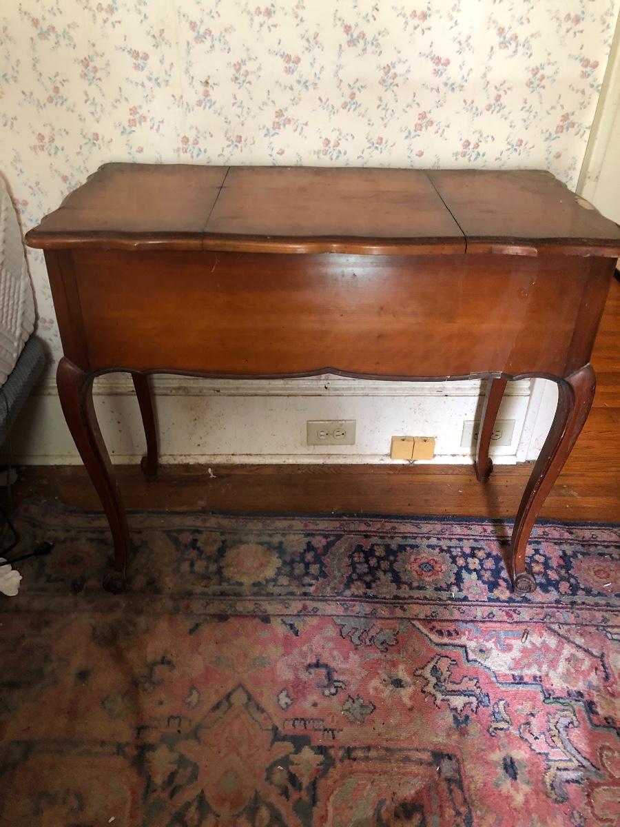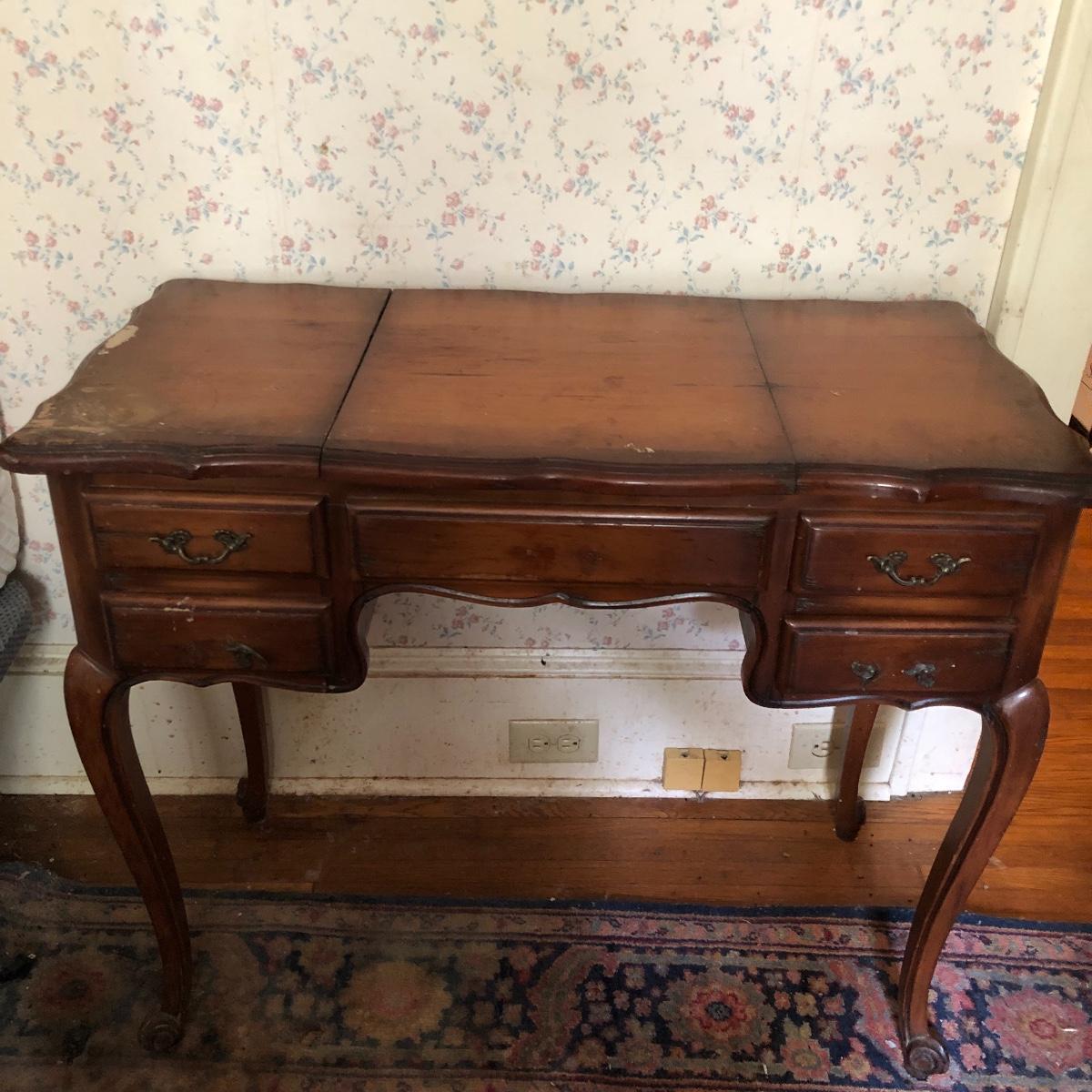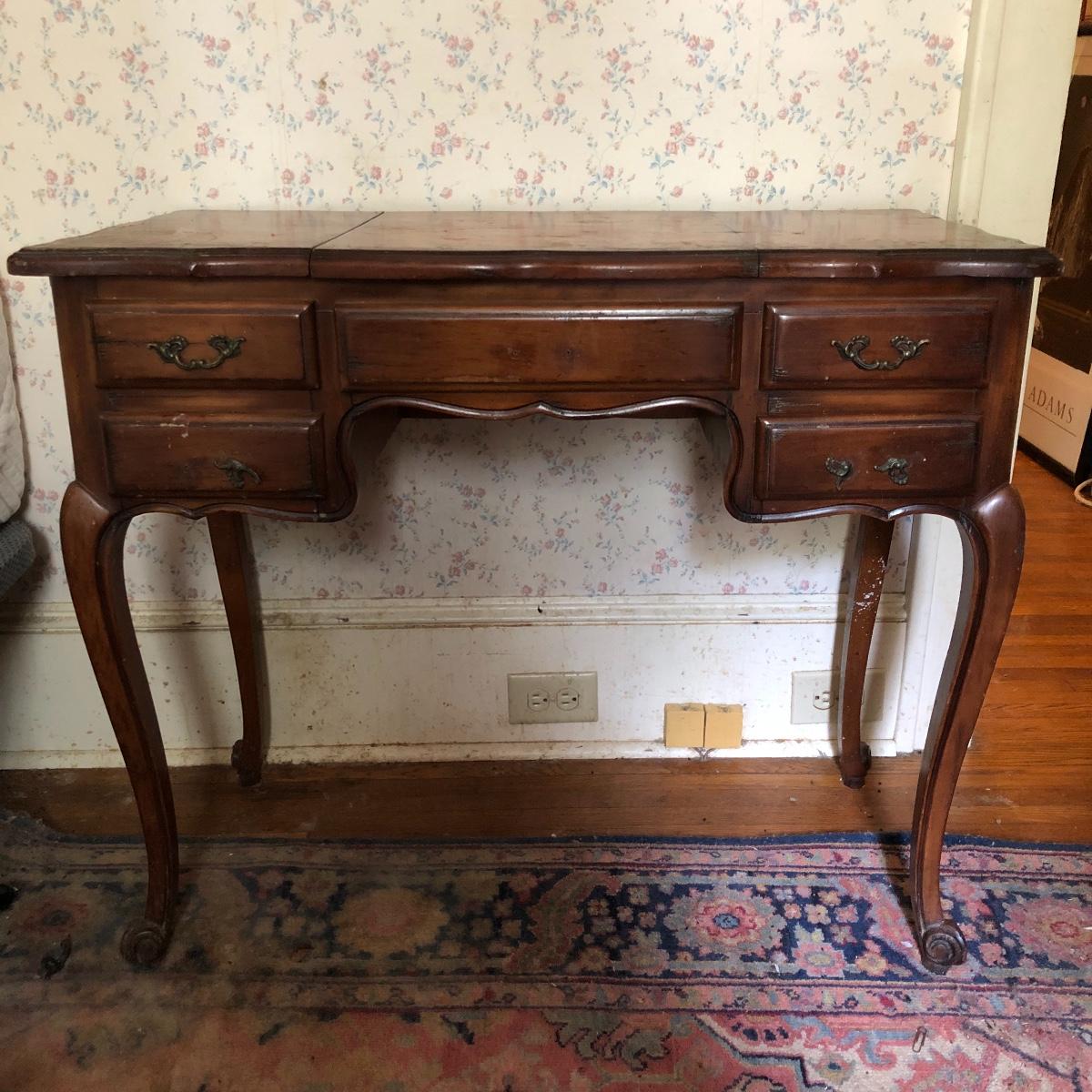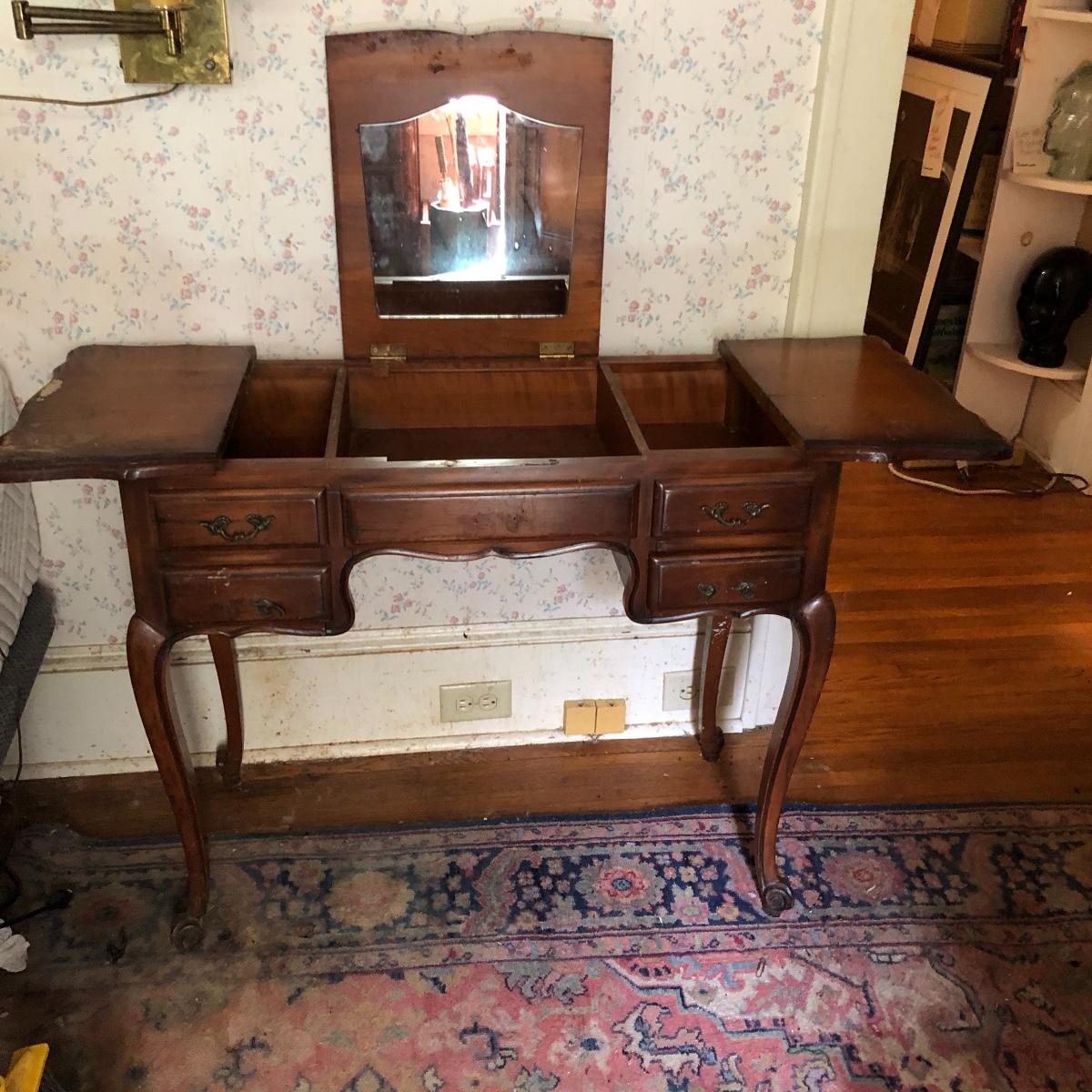 Stop sharing a bathroom and create your beautifying space anywhere in your house! This vanity table has a mirror in the folding top and the sides open to reveal compartments on each side. Vanity also has one dovetailed drawer and decorative feet. Vanity has some scratches and nicks and paper stuck on top, see pictures. There are some metal pulls missing too, grab a new set and make it really your own. Table measures 17.5” x 34” x 28”.