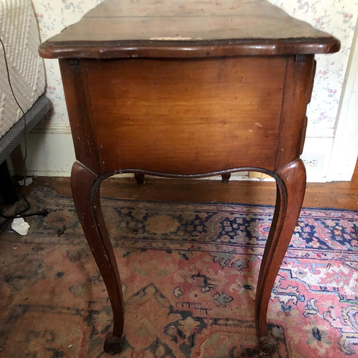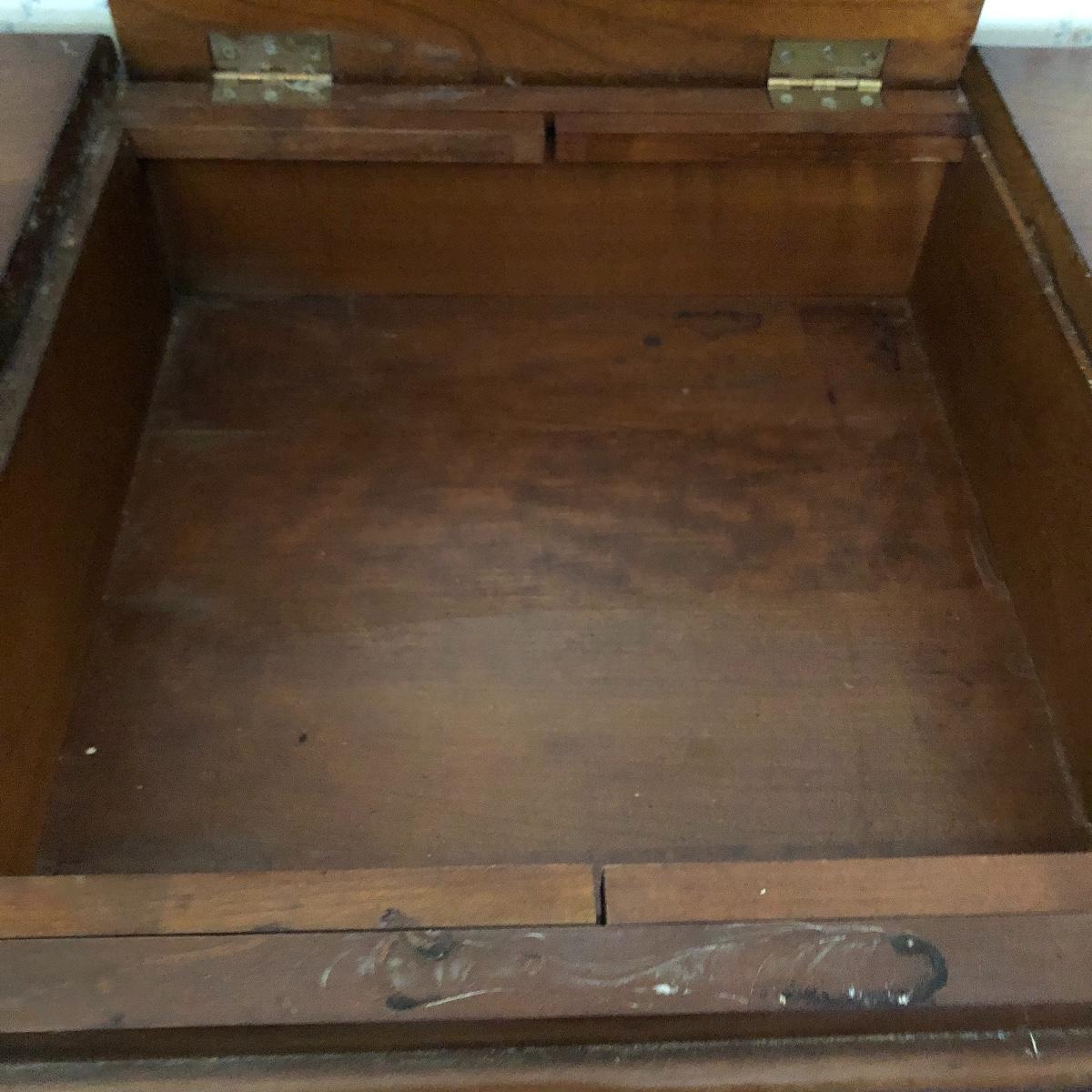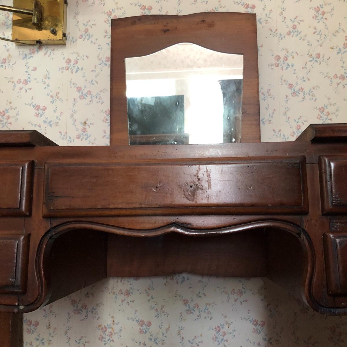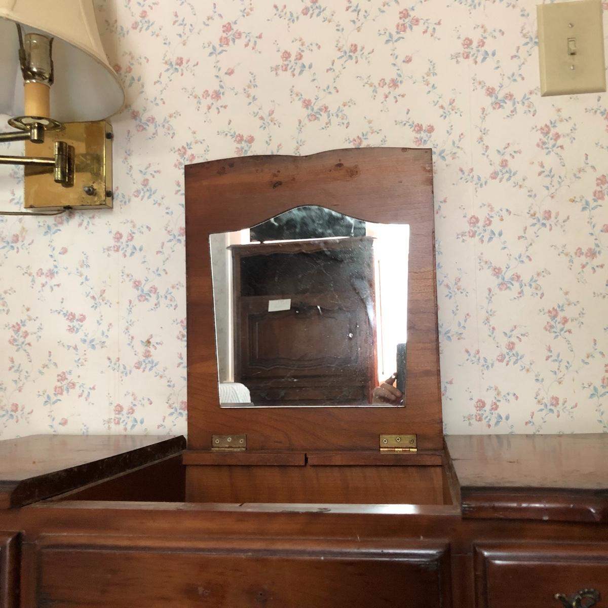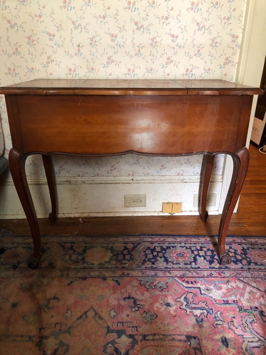 Stop sharing a bathroom and create your beautifying space anywhere in your house! This vanity table has a mirror in the folding top and the sides open to reveal compartments on each side. Vanity also has one dovetailed drawer and decorative feet. Vanity has some scratches and nicks and paper stuck on top, see pictures. There are some metal pulls missing too, grab a new set and make it really your own. Table measures 17.5” x 34” x 28”.