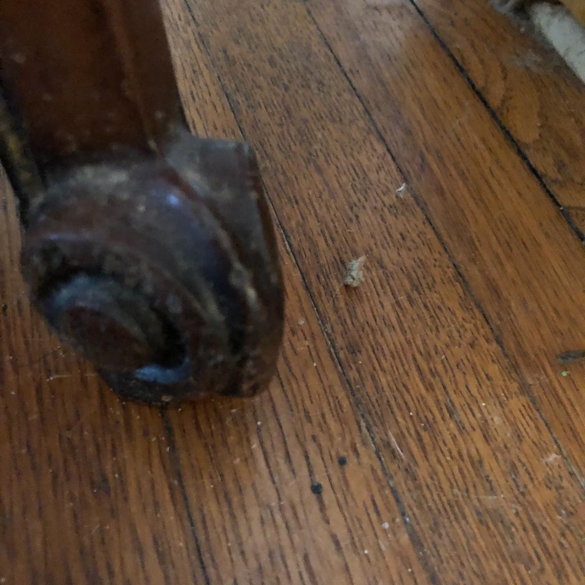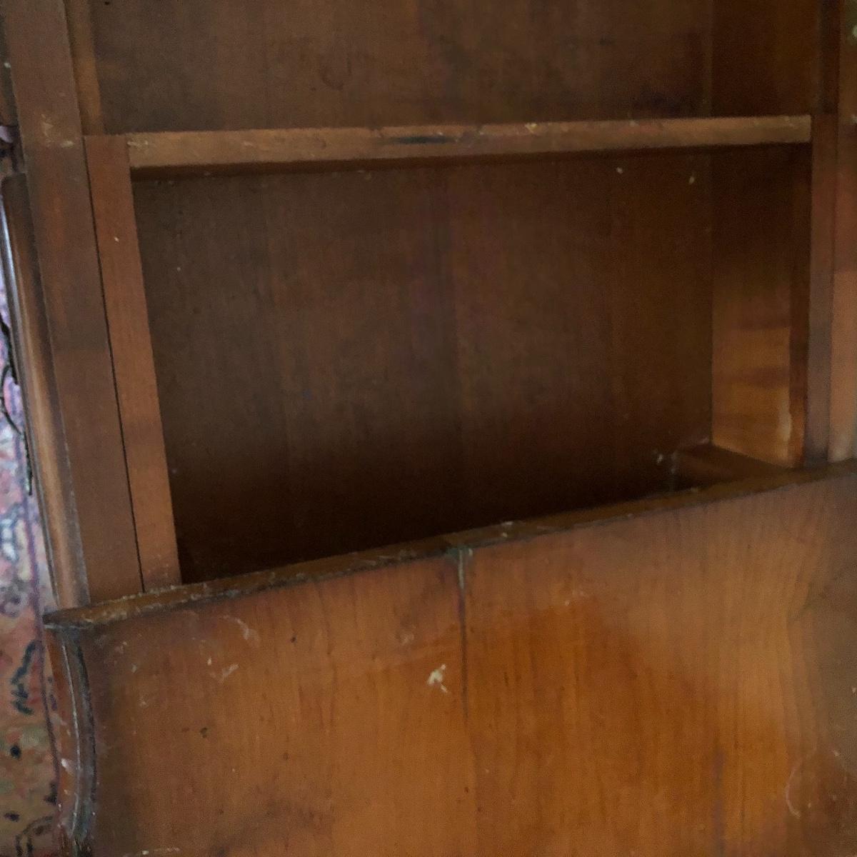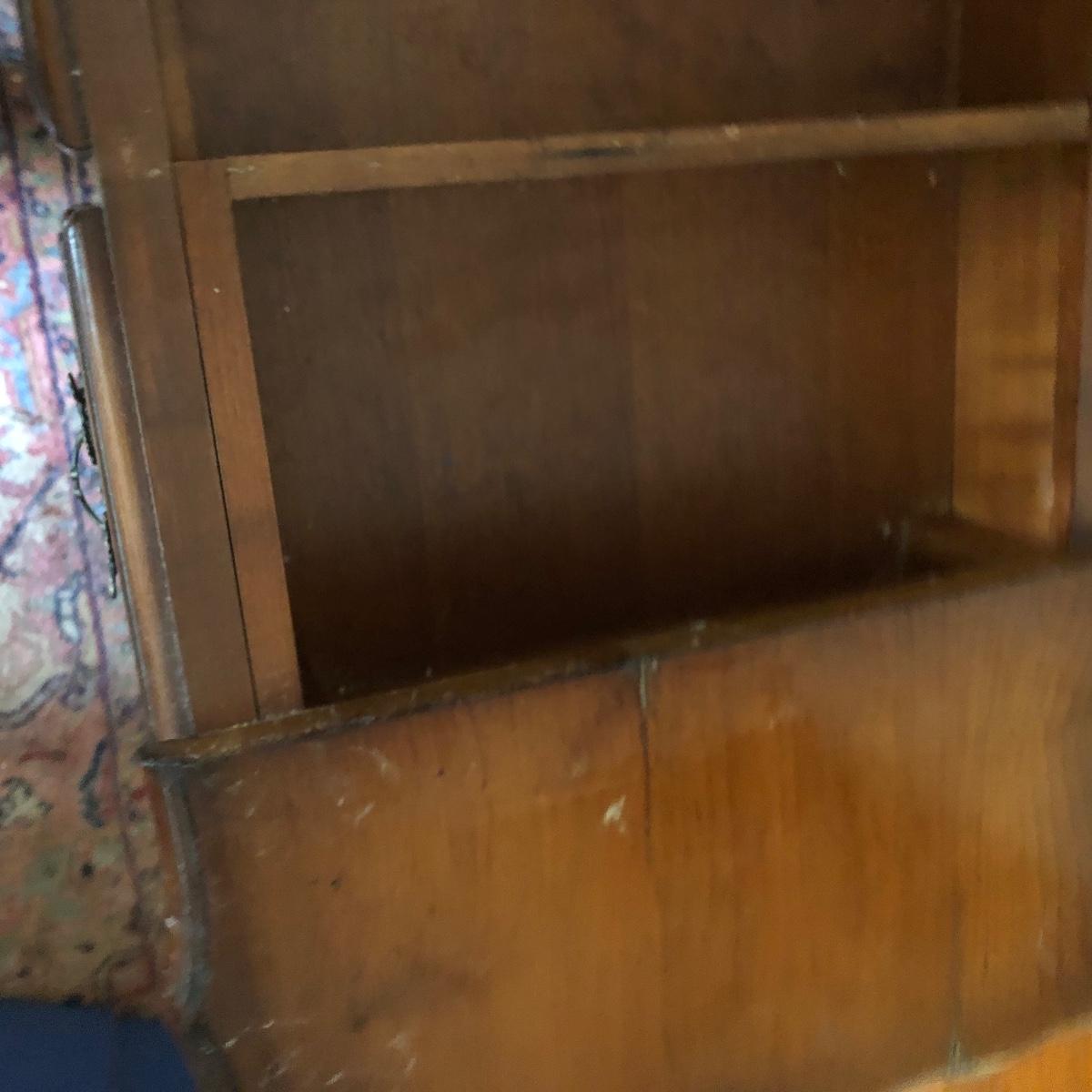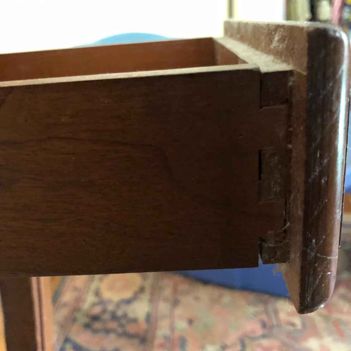 Stop sharing a bathroom and create your beautifying space anywhere in your house! This vanity table has a mirror in the folding top and the sides open to reveal compartments on each side. Vanity also has one dovetailed drawer and decorative feet. Vanity has some scratches and nicks and paper stuck on top, see pictures. There are some metal pulls missing too, grab a new set and make it really your own. Table measures 17.5” x 34” x 28”.