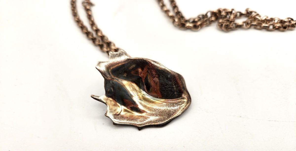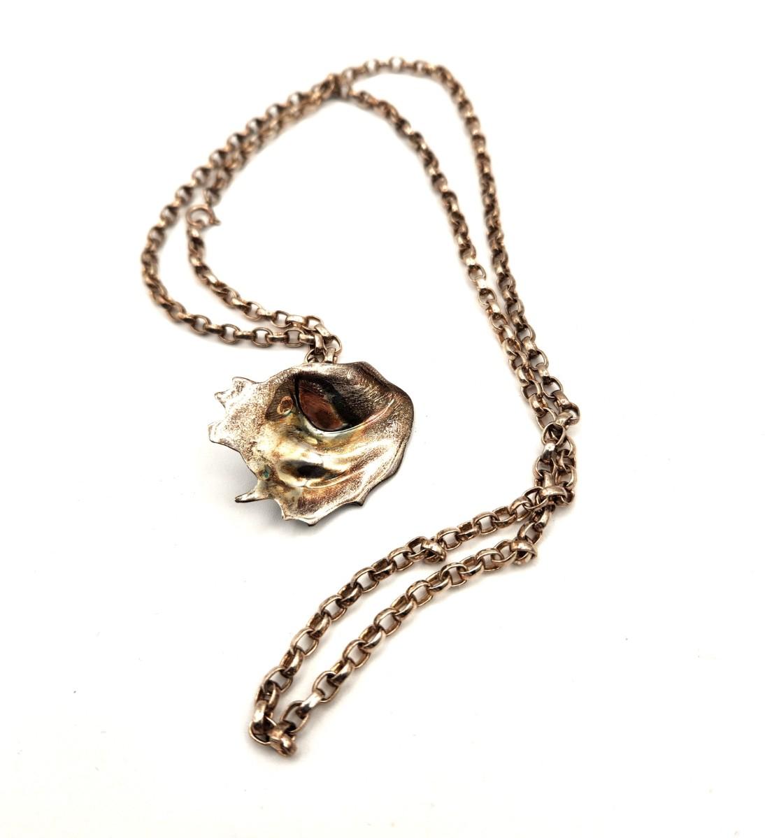 Vintage Mignon Faget (old mark) Shell Pendant (sterling) on heavy sterling chain. (30") Pendant is about 1.5" long. We did not polish - will leave that to you. About 1.4 ounces of silver.