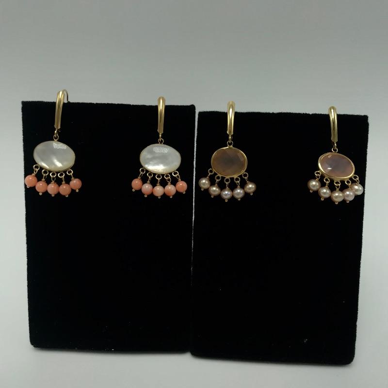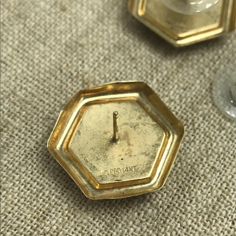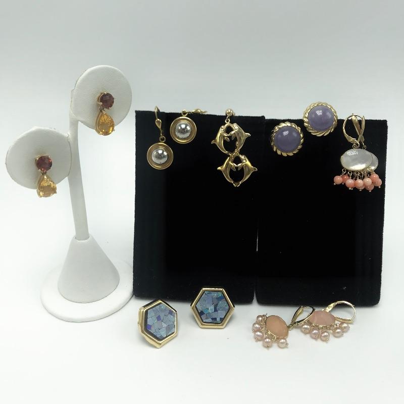 Sweet selection of mostly 14K/585 gold earrings with delicate gems and pearly accents. The pair of earrings with white gold centers are marked 750. The fun mosaic style earrings are slightly out of shape, but appear to be easily reshaped. Starting price based on melt value.