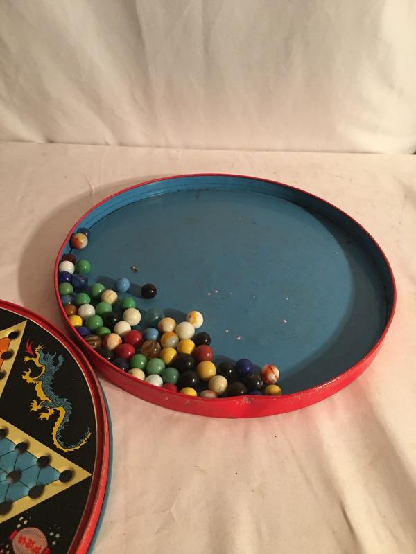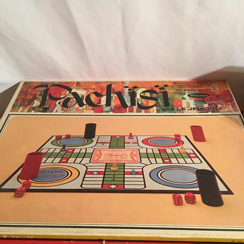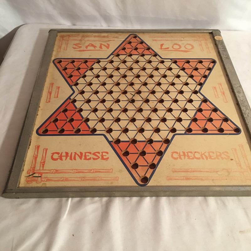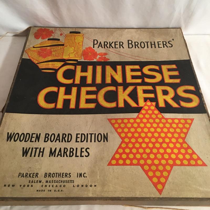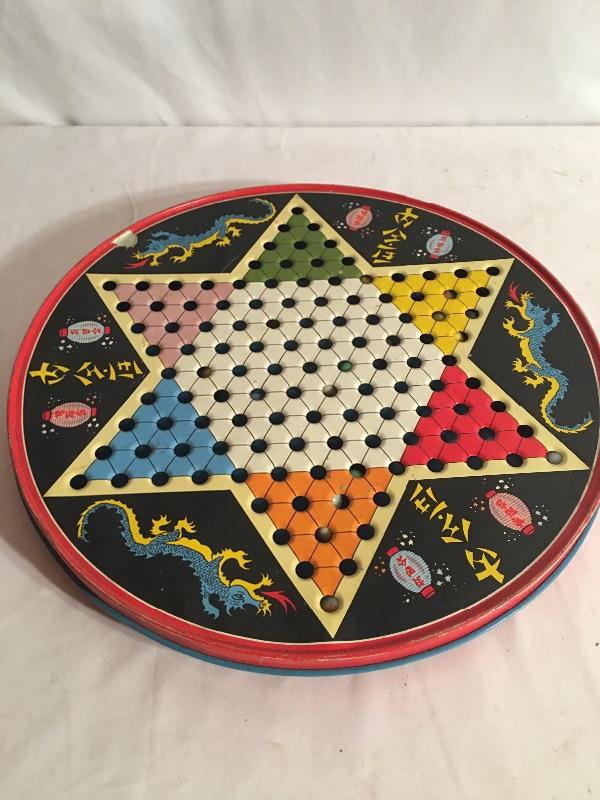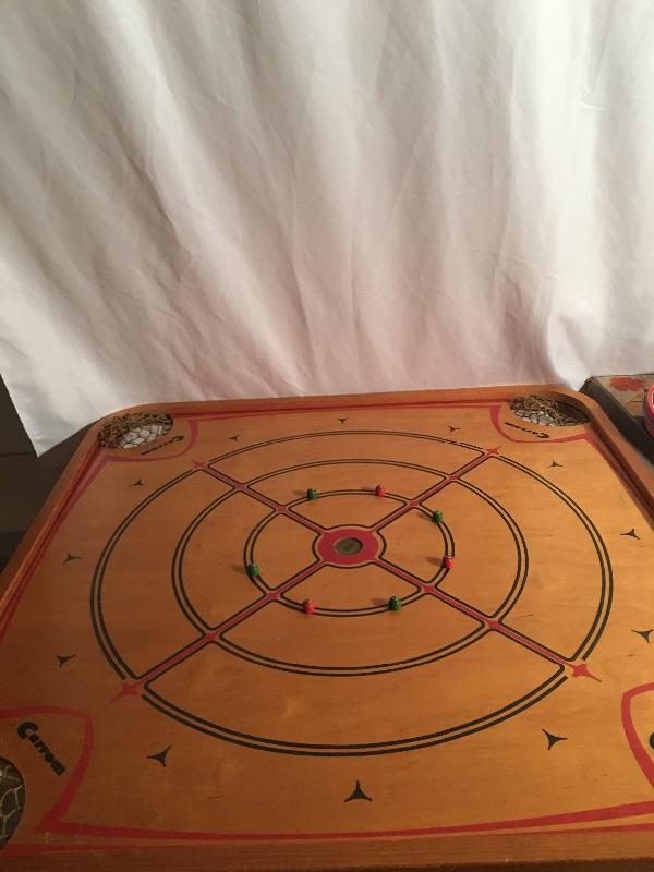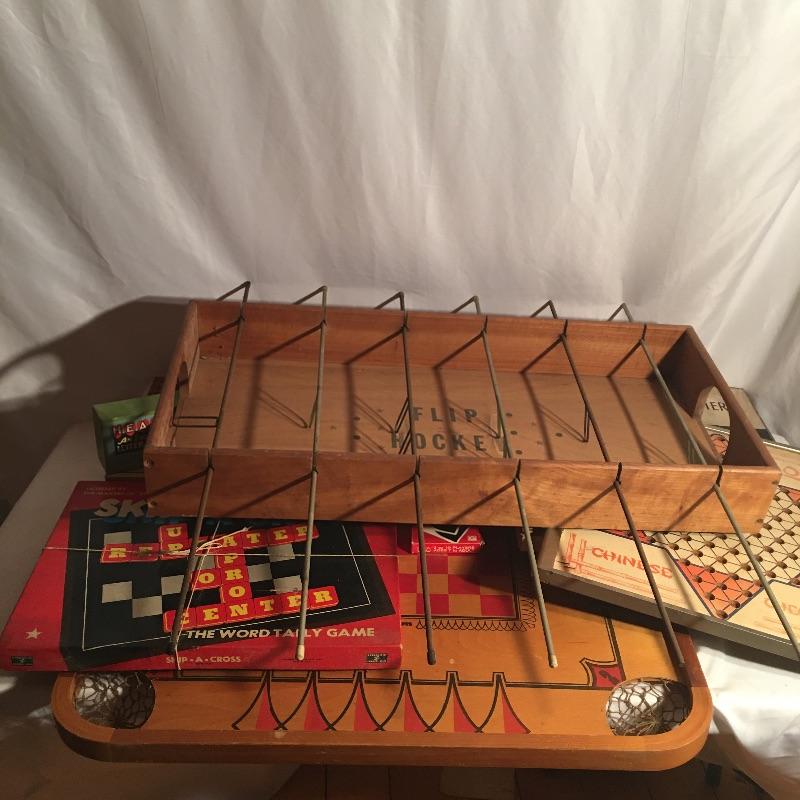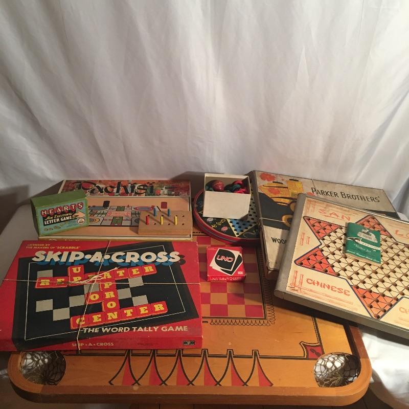A great collection of vintage board games that includes Chinese checkers, Skip-A-Cross, Carrom wooden double sided game board, Pachisi, Hearts and Flip Hockey.
