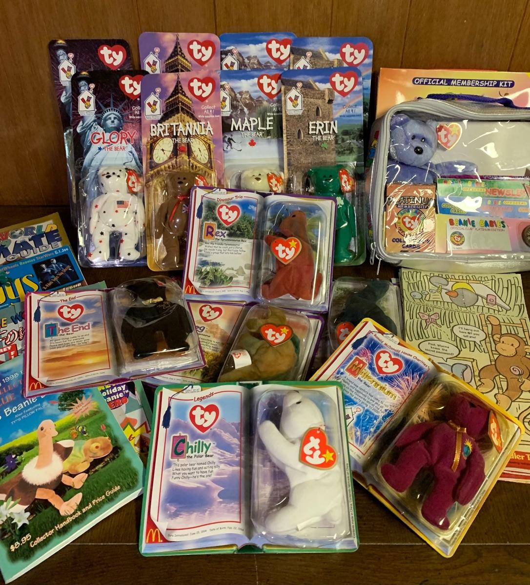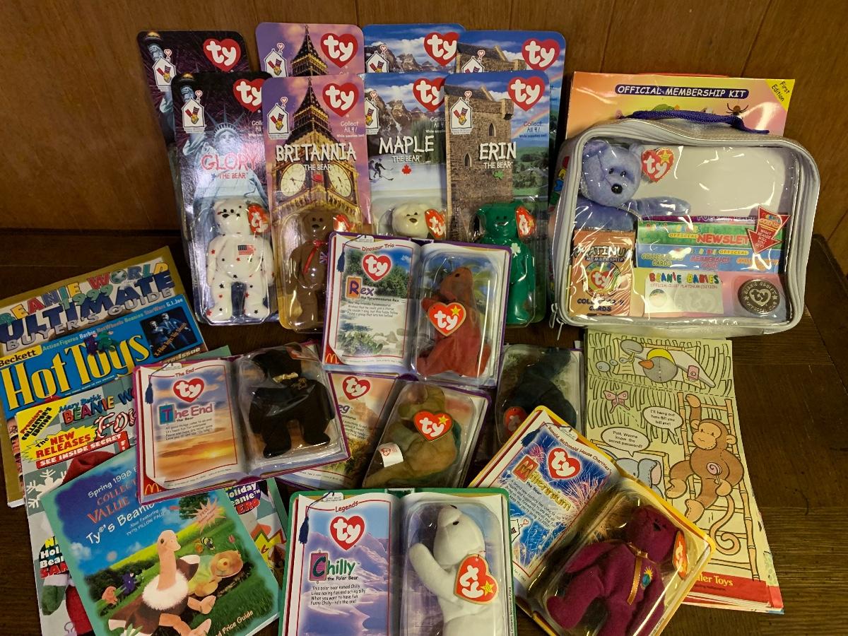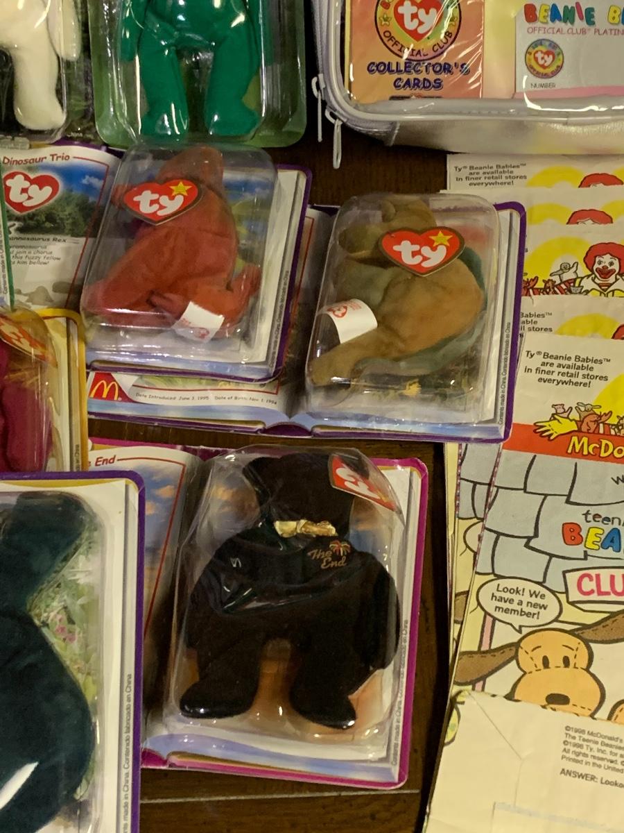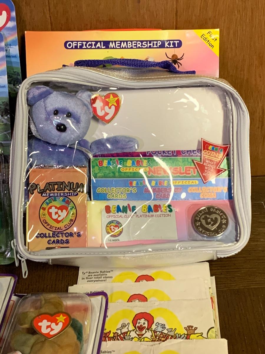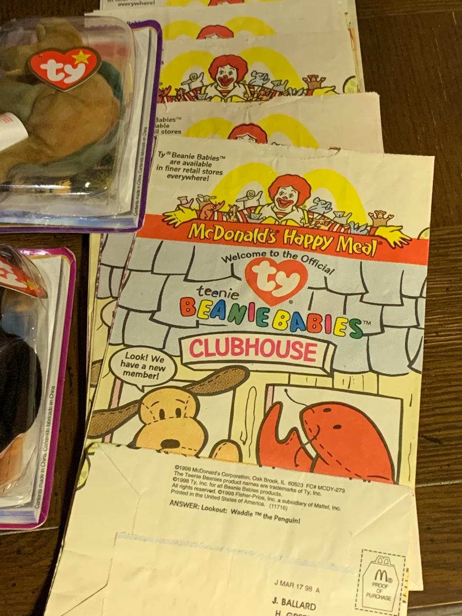 Collectible McDonald Beanie Babies along with magazines, original paper Happy Meal Bags, Official Fan Club Membership Kit (this has been opened -may or may not be complete).