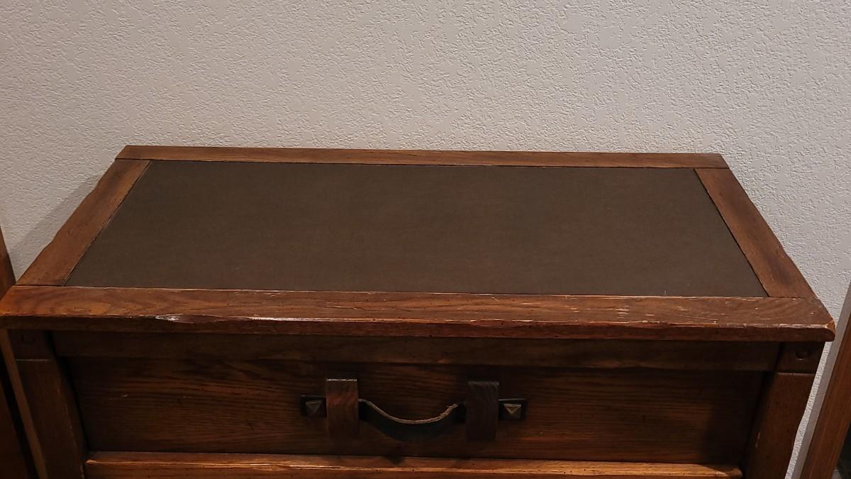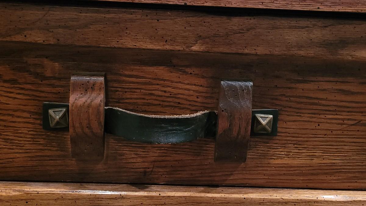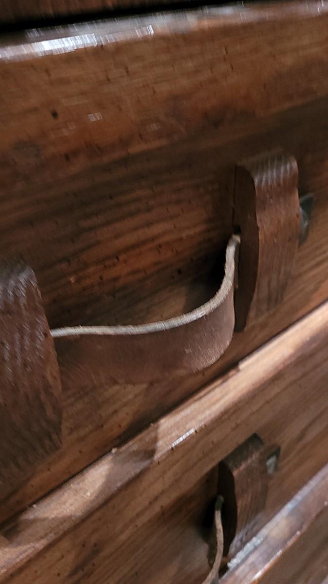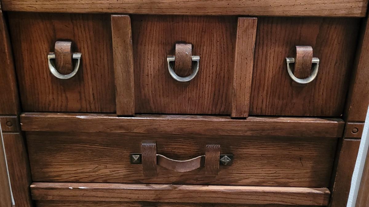 Lot 221: Vintage Mid Century Leather Top & Handle Dresser