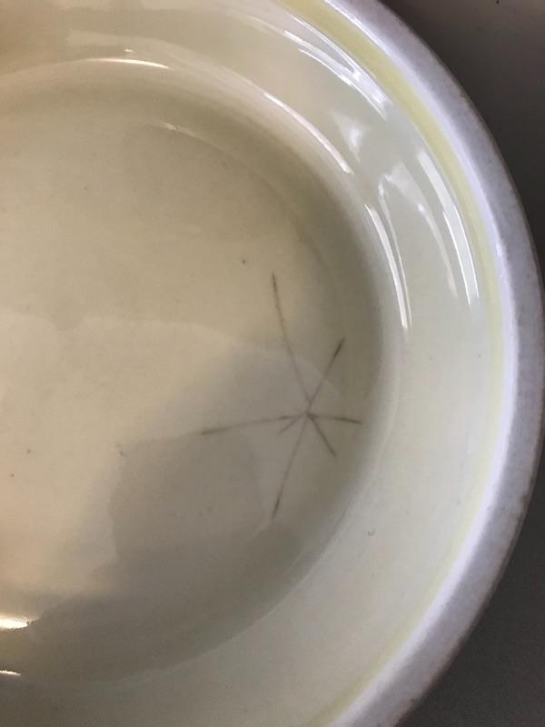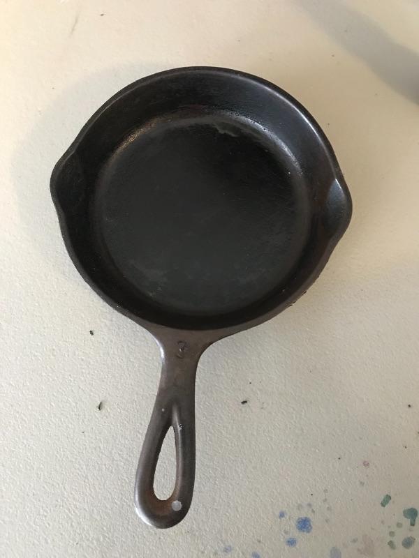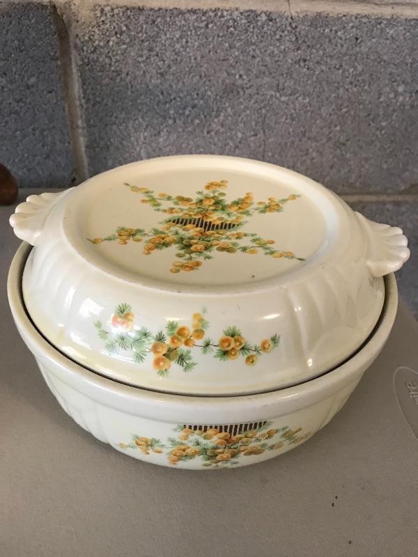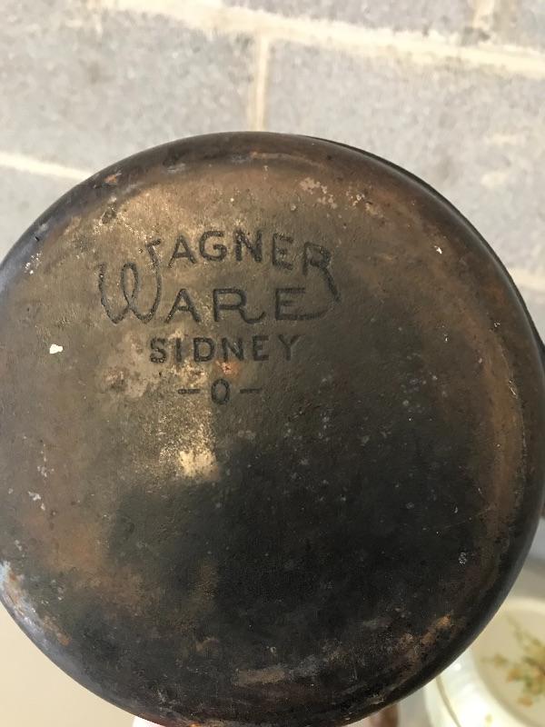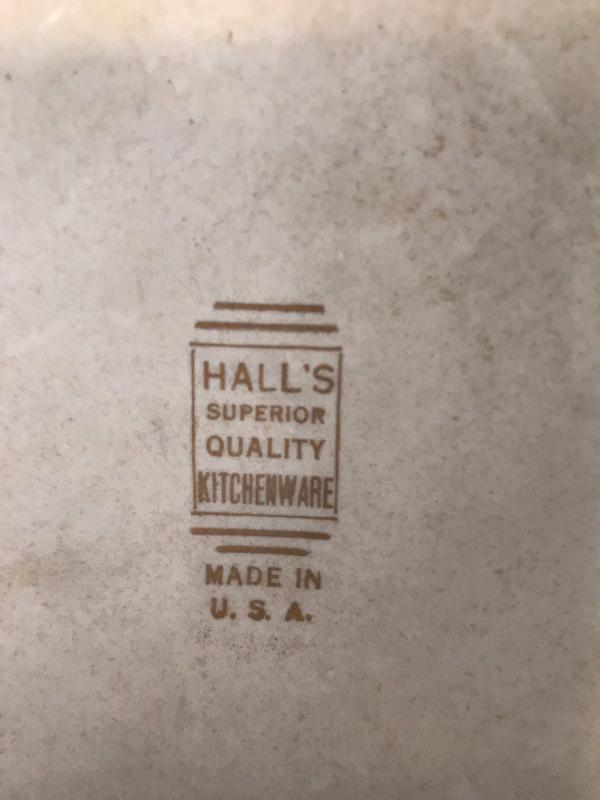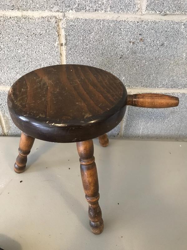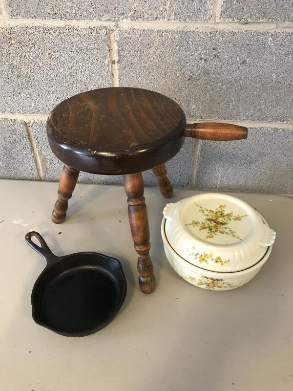 Three legged wooden milking stool, Wagnerware Sidney iron skillet and floral Hall’s Cassarole Dish with lid. Shipping available.