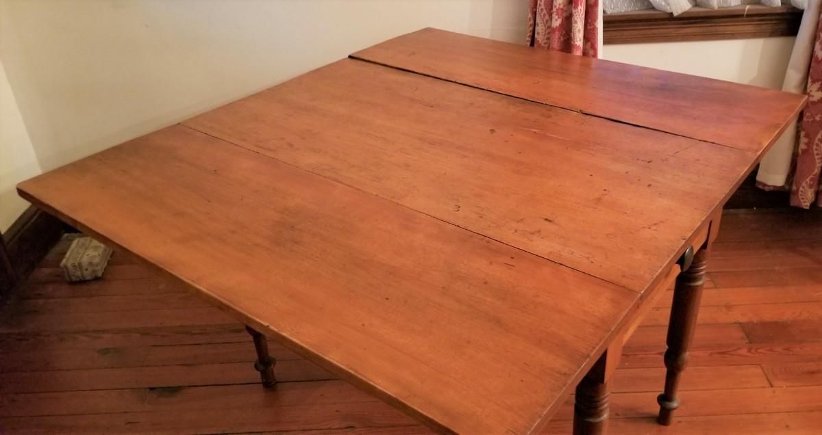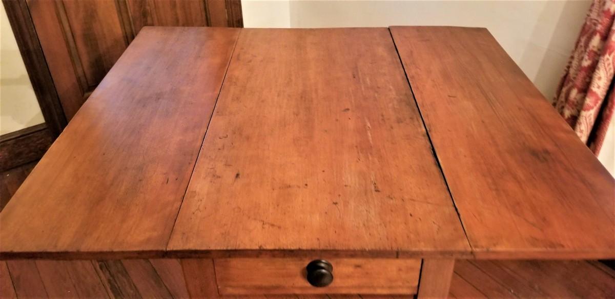 Nice antique primitive drop leaf table - one drawer (has replaced knob). Antique condition. 22" across when in the "down" position, 47.5" across when fully extended. x 42". 28.75" tall. Solid wood.