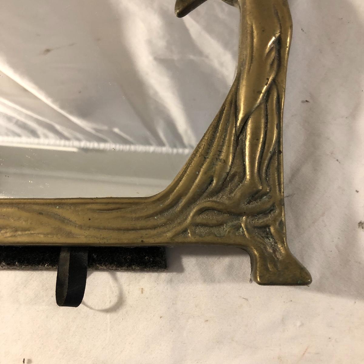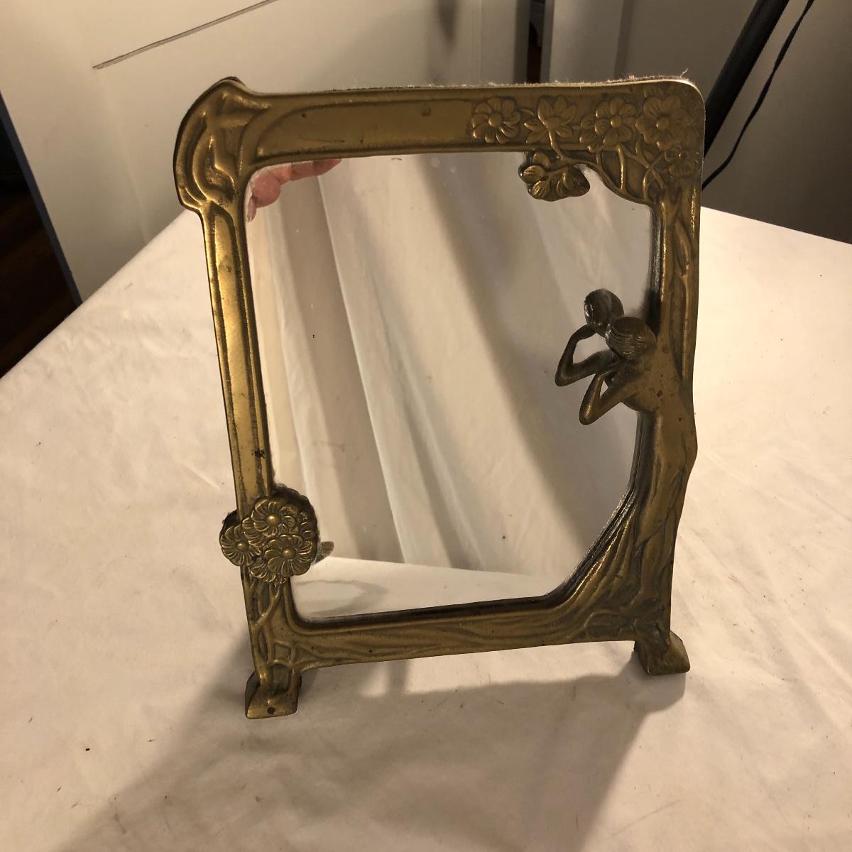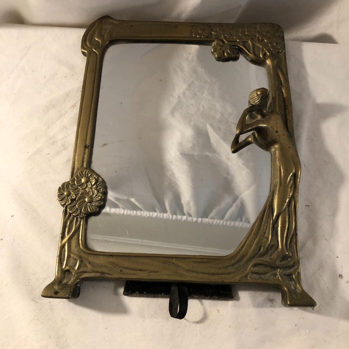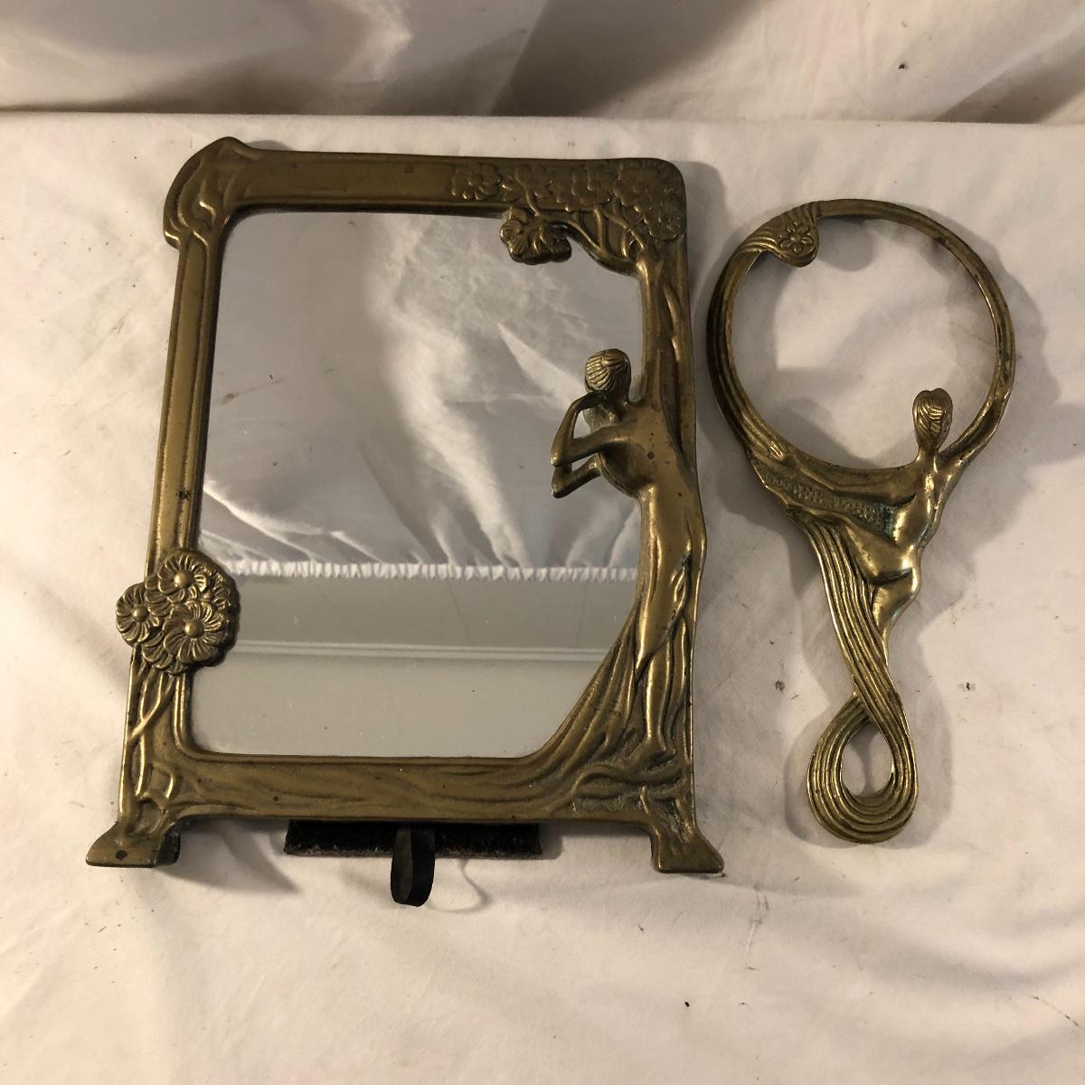 Step back in time with this pair of Art Nouveau pieces. Lot includes Art Nouveau brass mirror and a brass hand mirror handle that is missing mirror. Framed mirror measures 8.5” x 11.5”.