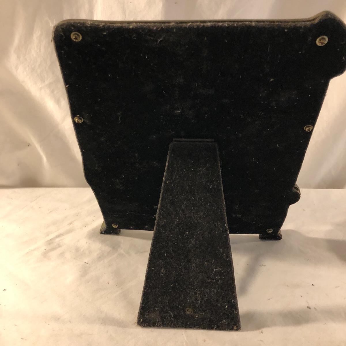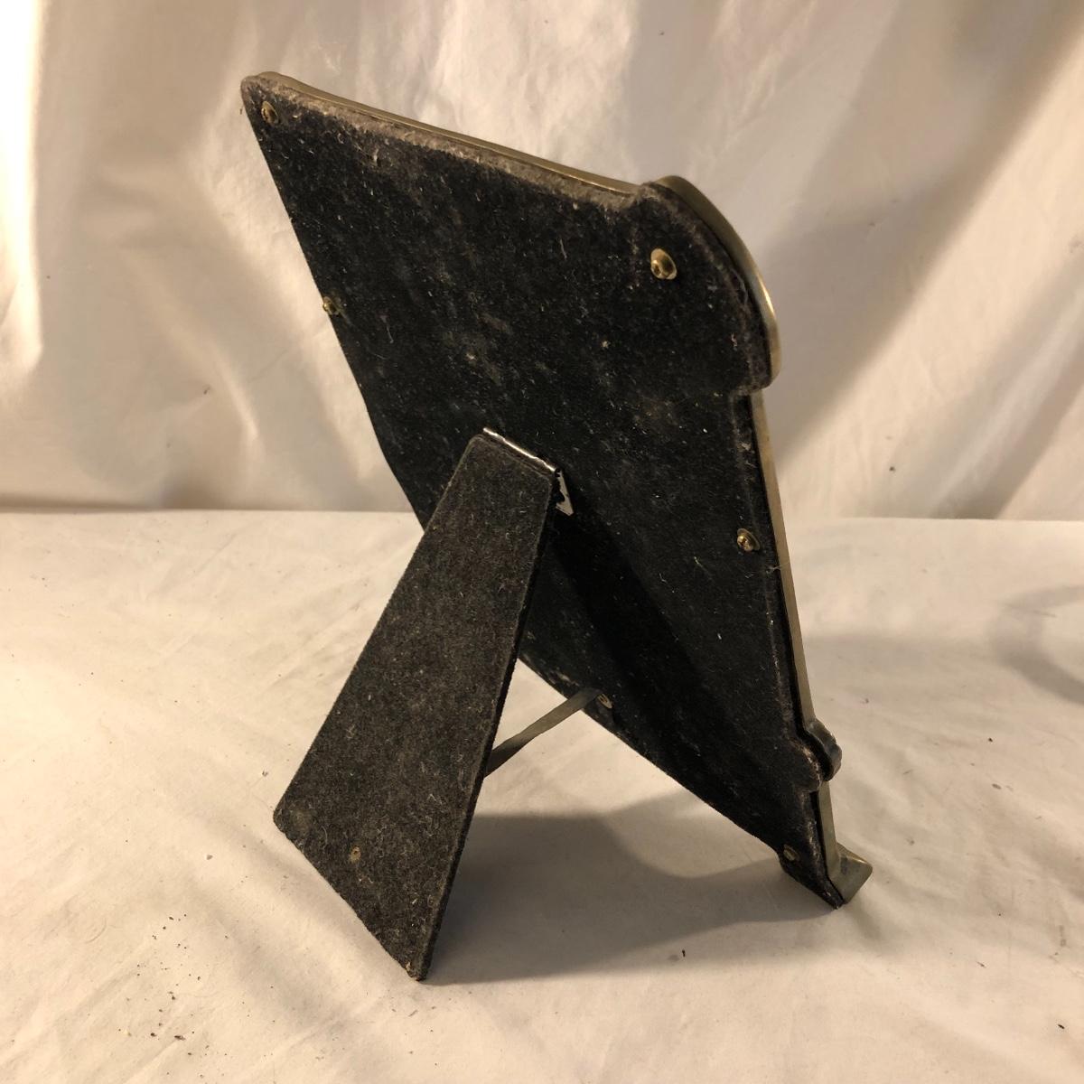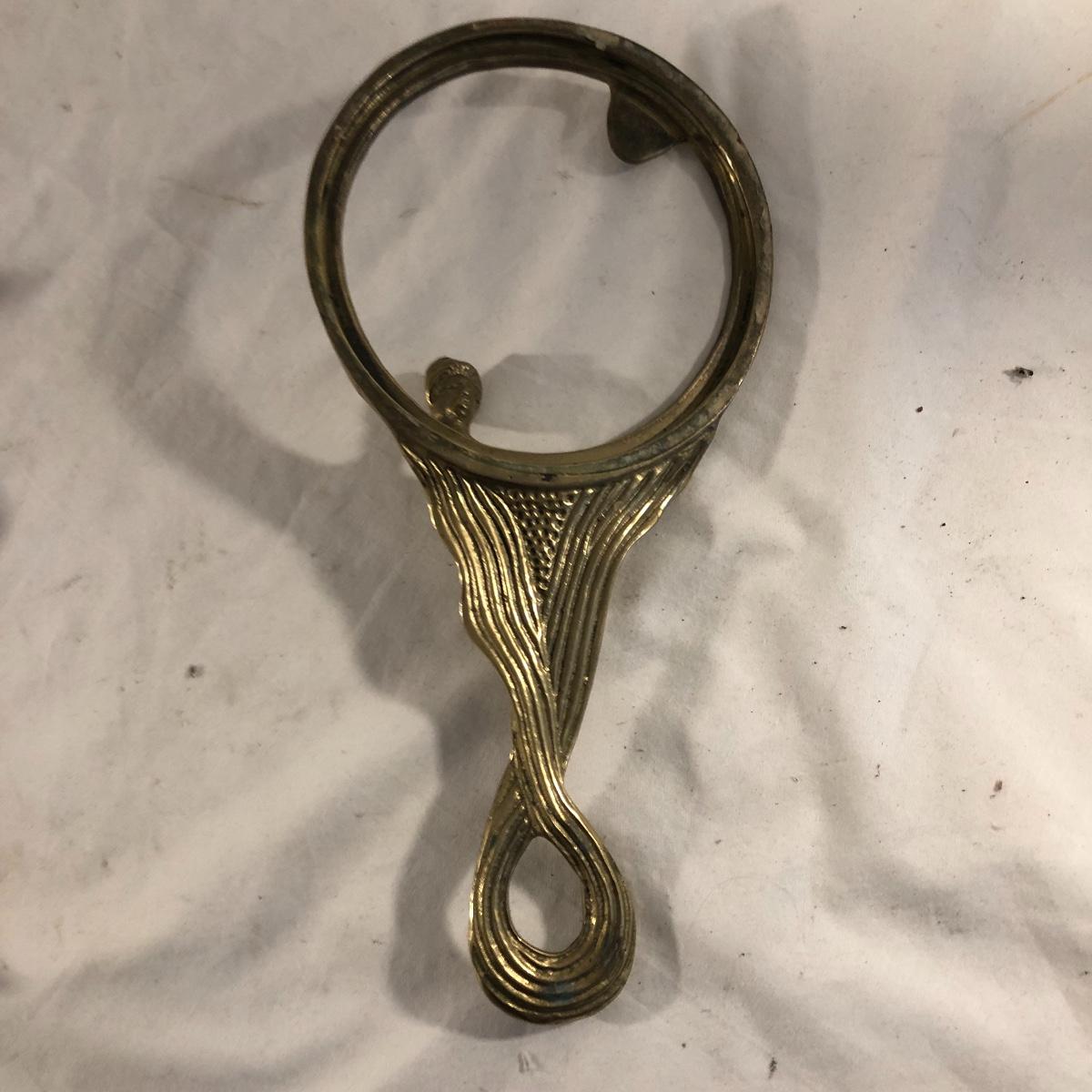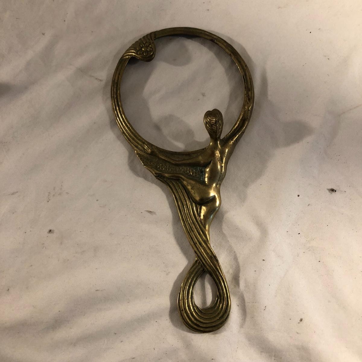 Step back in time with this pair of Art Nouveau pieces. Lot includes Art Nouveau brass mirror and a brass hand mirror handle that is missing mirror. Framed mirror measures 8.5” x 11.5”.