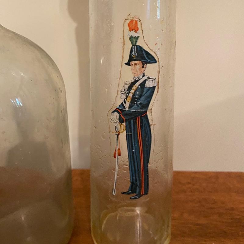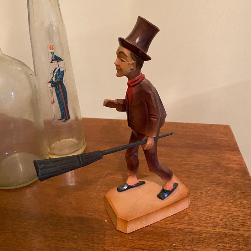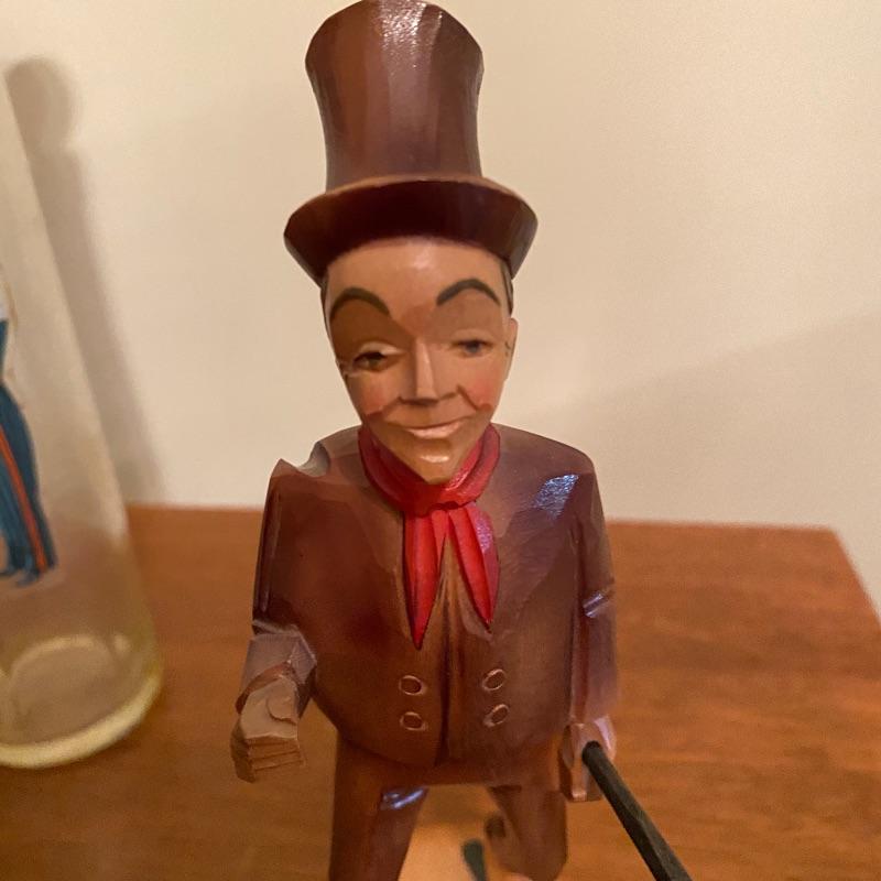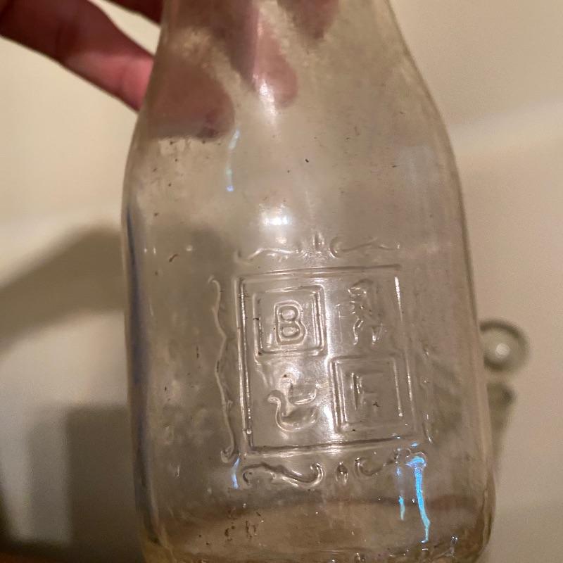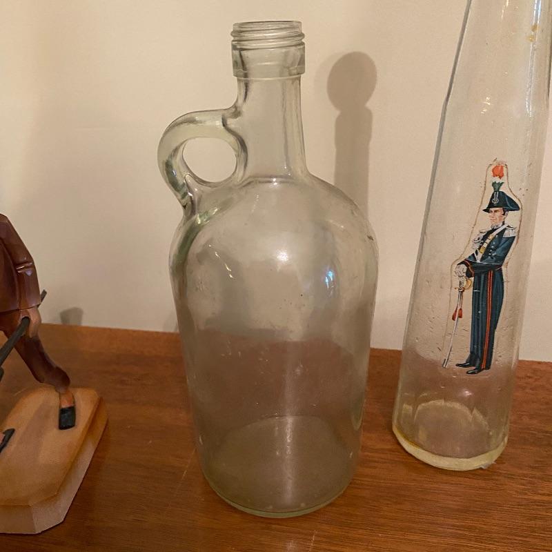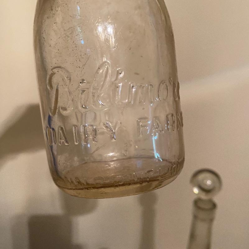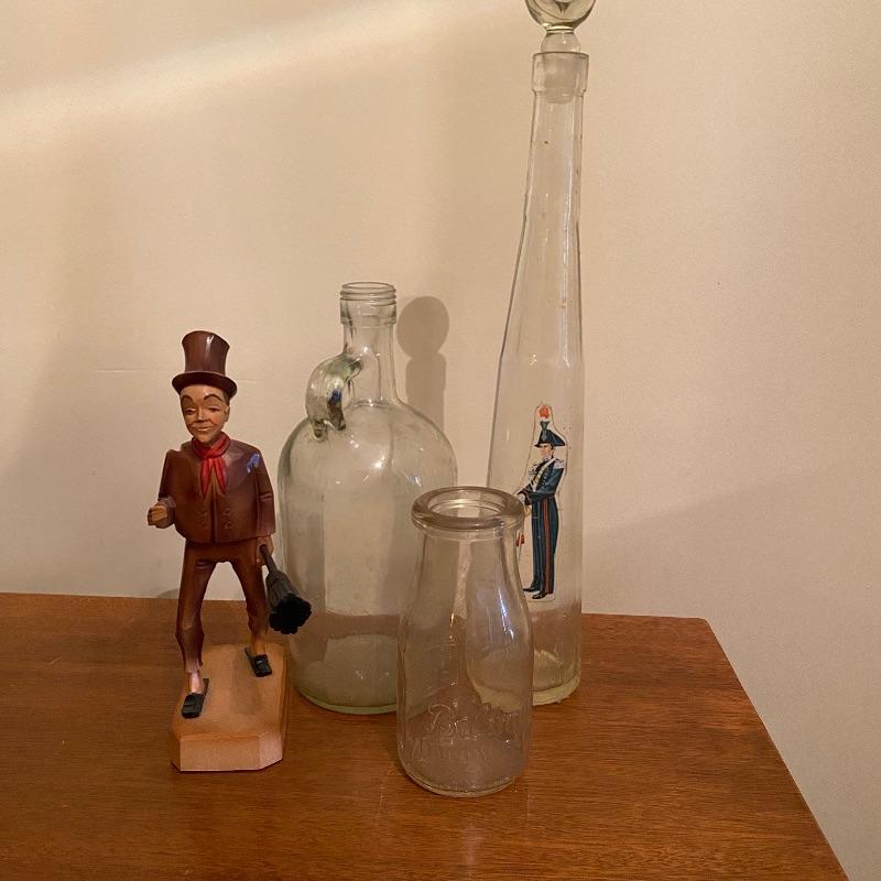Lot has a fantastic small original Biltmore Farms milk bottle. Also includes a tall decantur (13”tall) with a man on front, a smaller glass jug and a fun wooden figurine. Shipping available