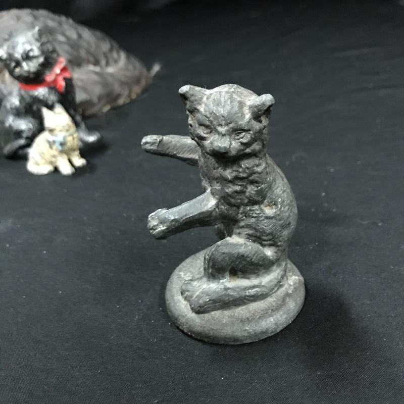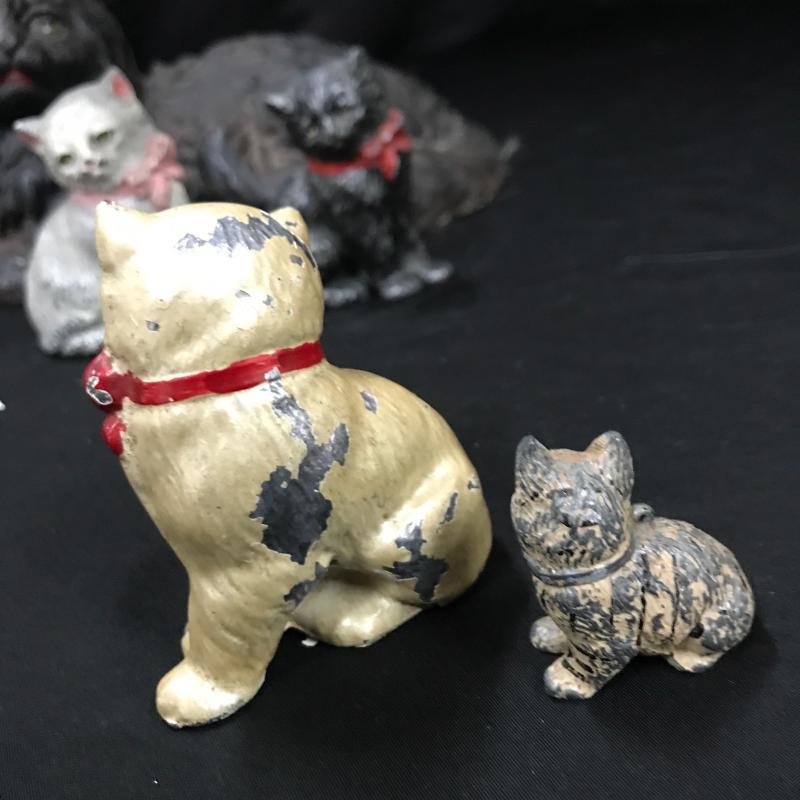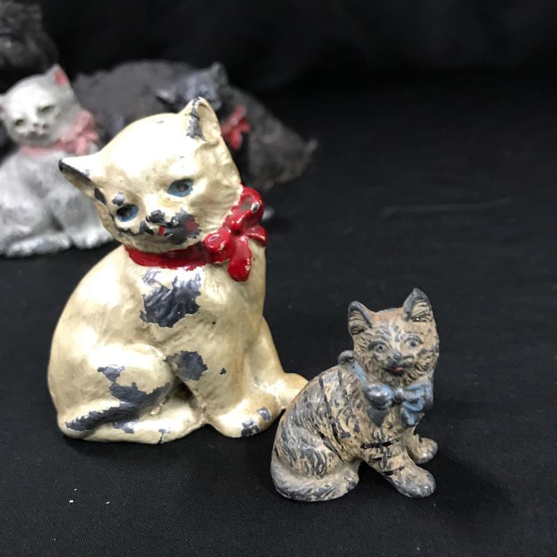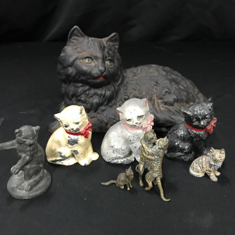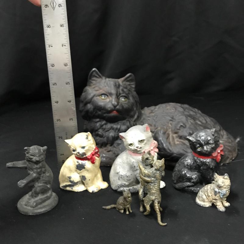 Collectible cats mostly in cast iron. Includes large doorstop and kissing bronze family. See photo of ruler for approximate sizes and details. One cat seems to be missing a peice that it should be holding. Shipping or local pick up in Asheville
